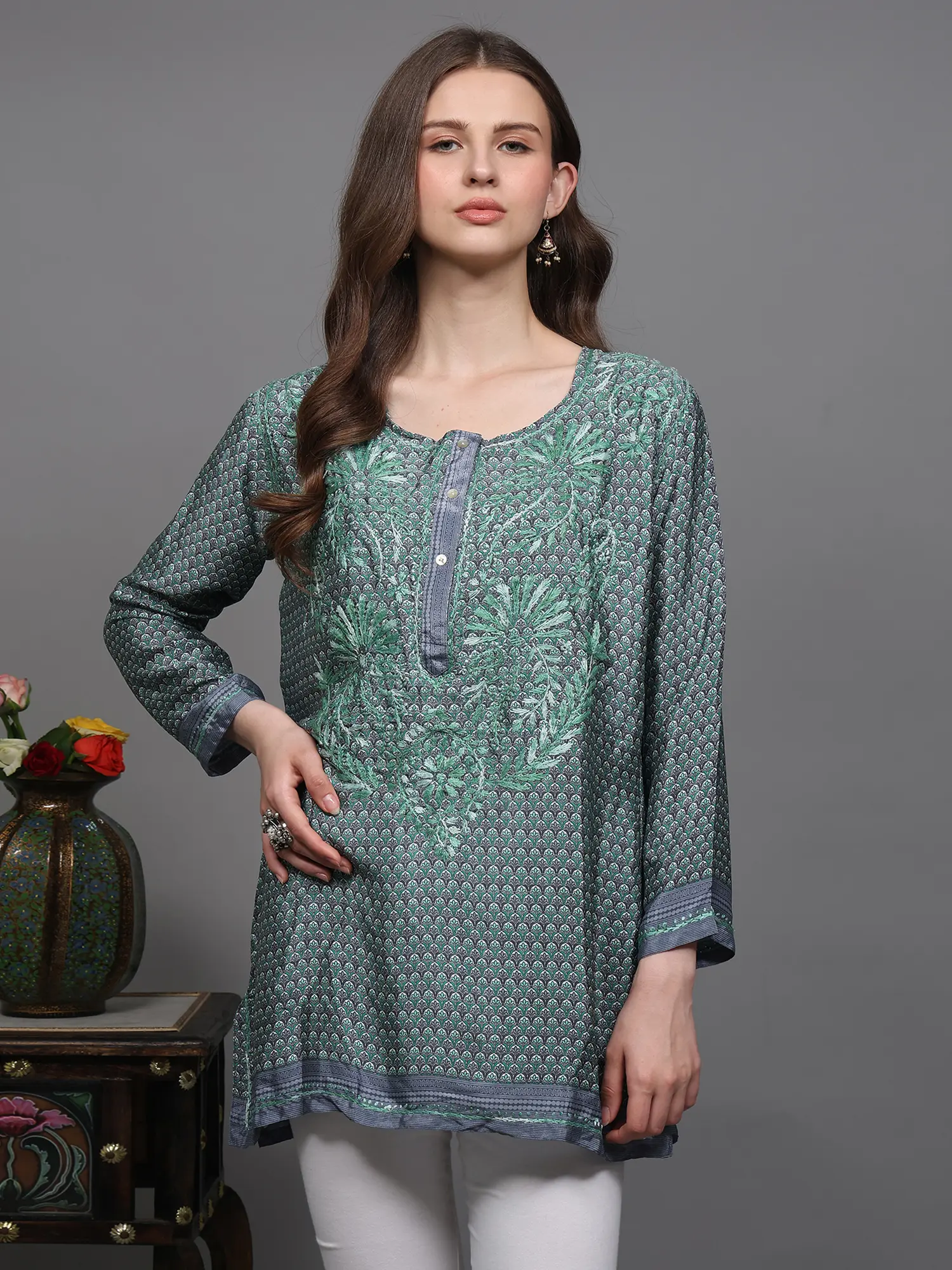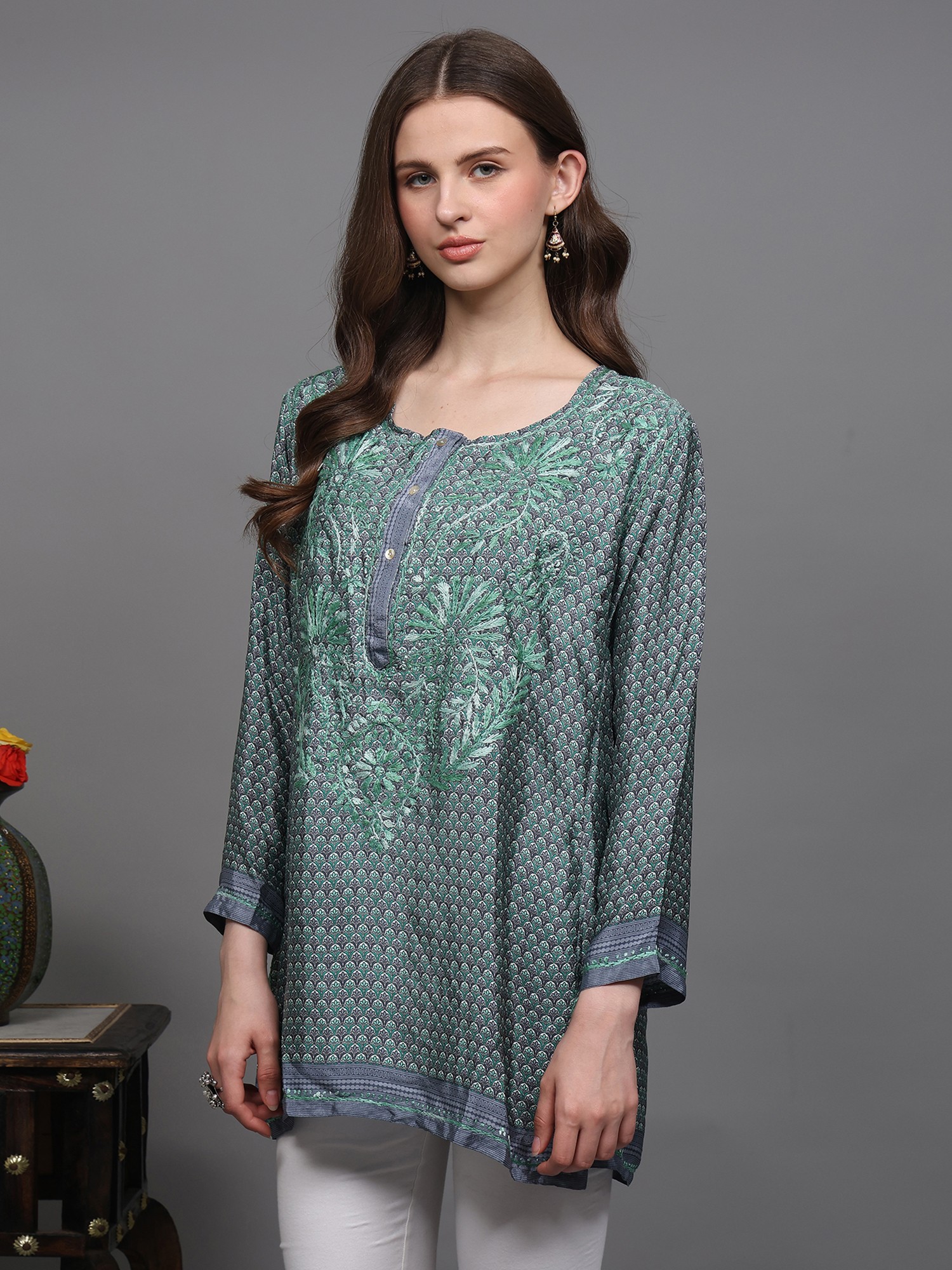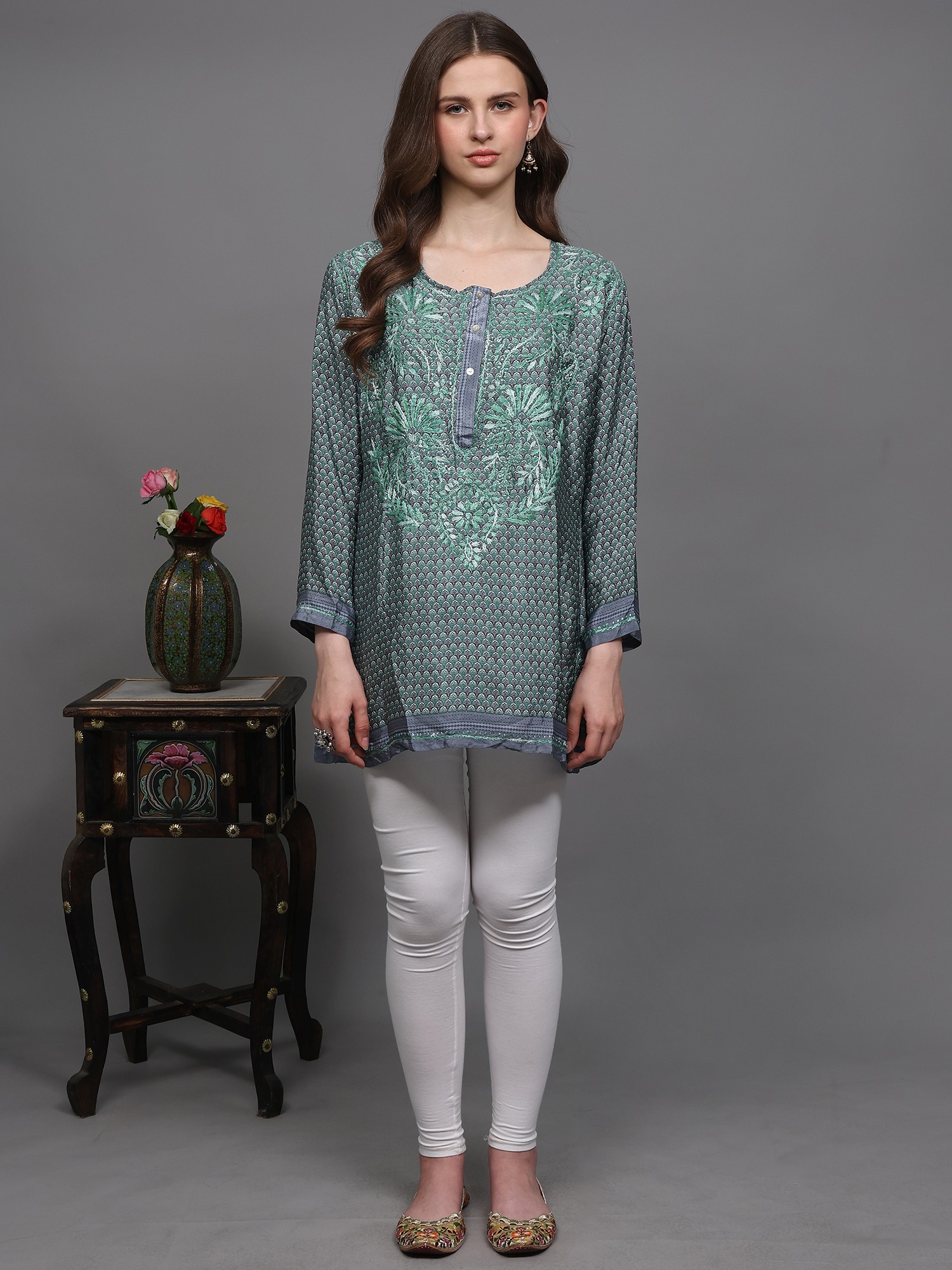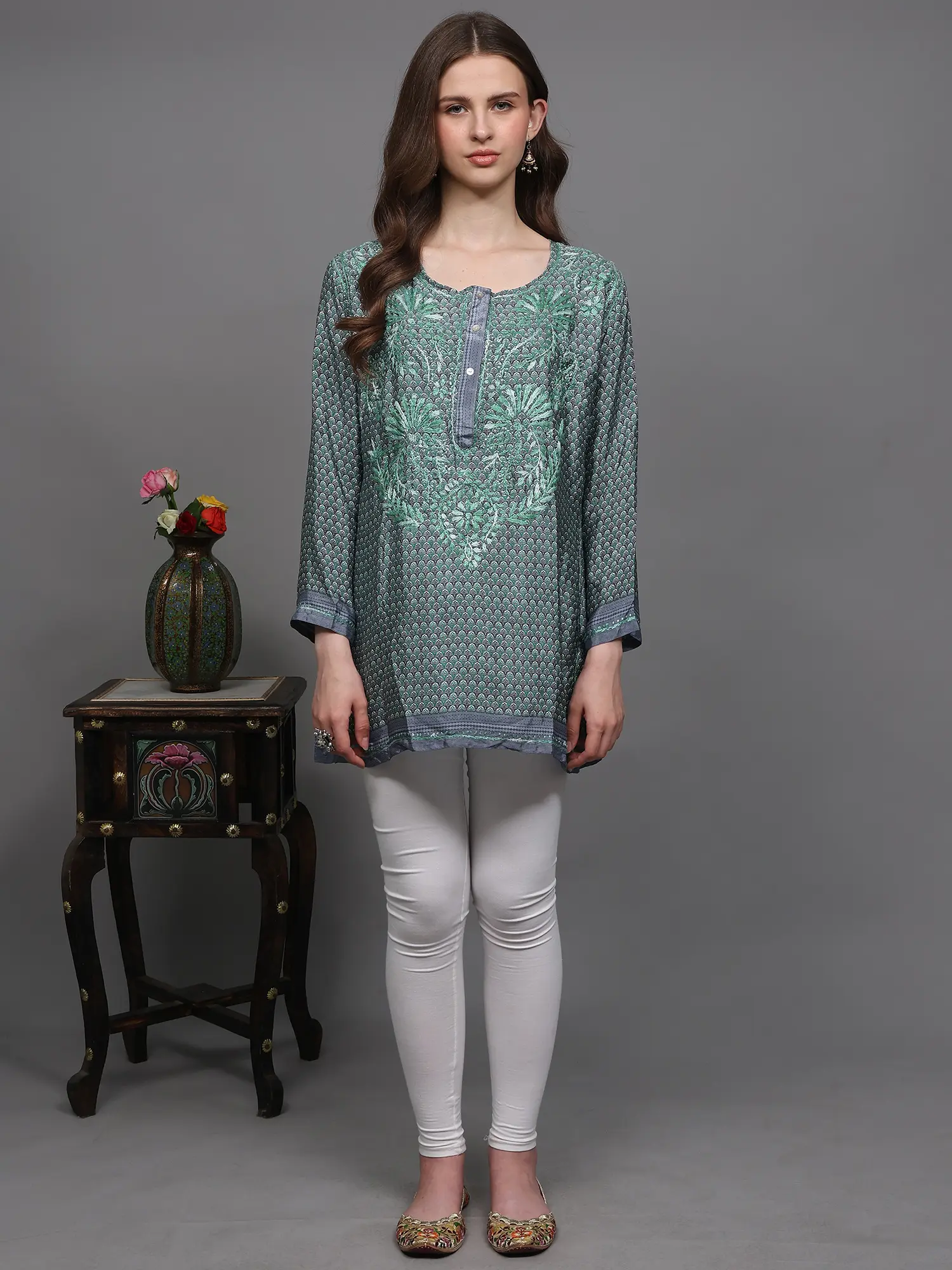 Dusty-Blue Floral Embroidered Short Kurti with Printed Motifs