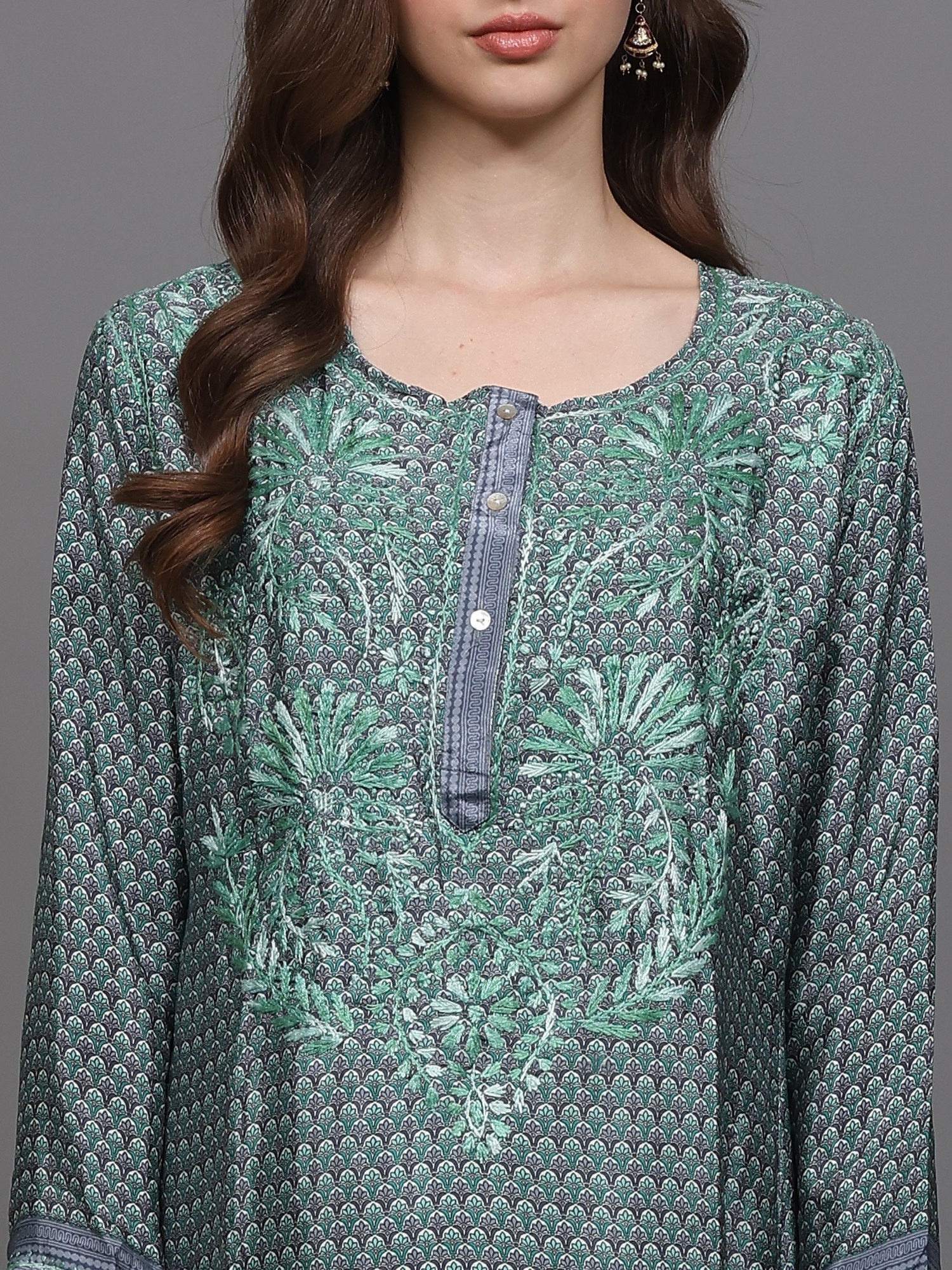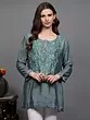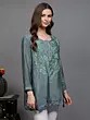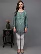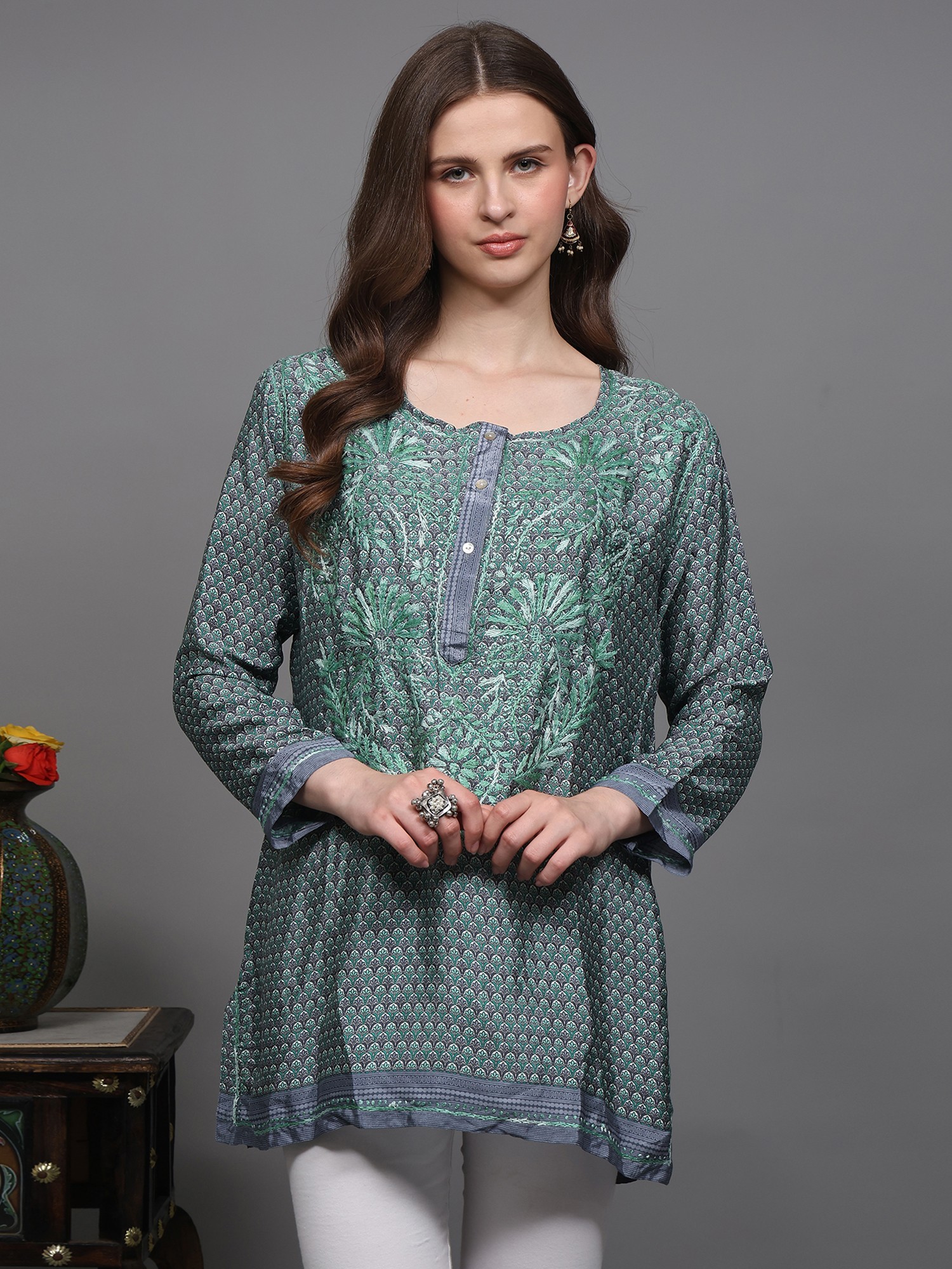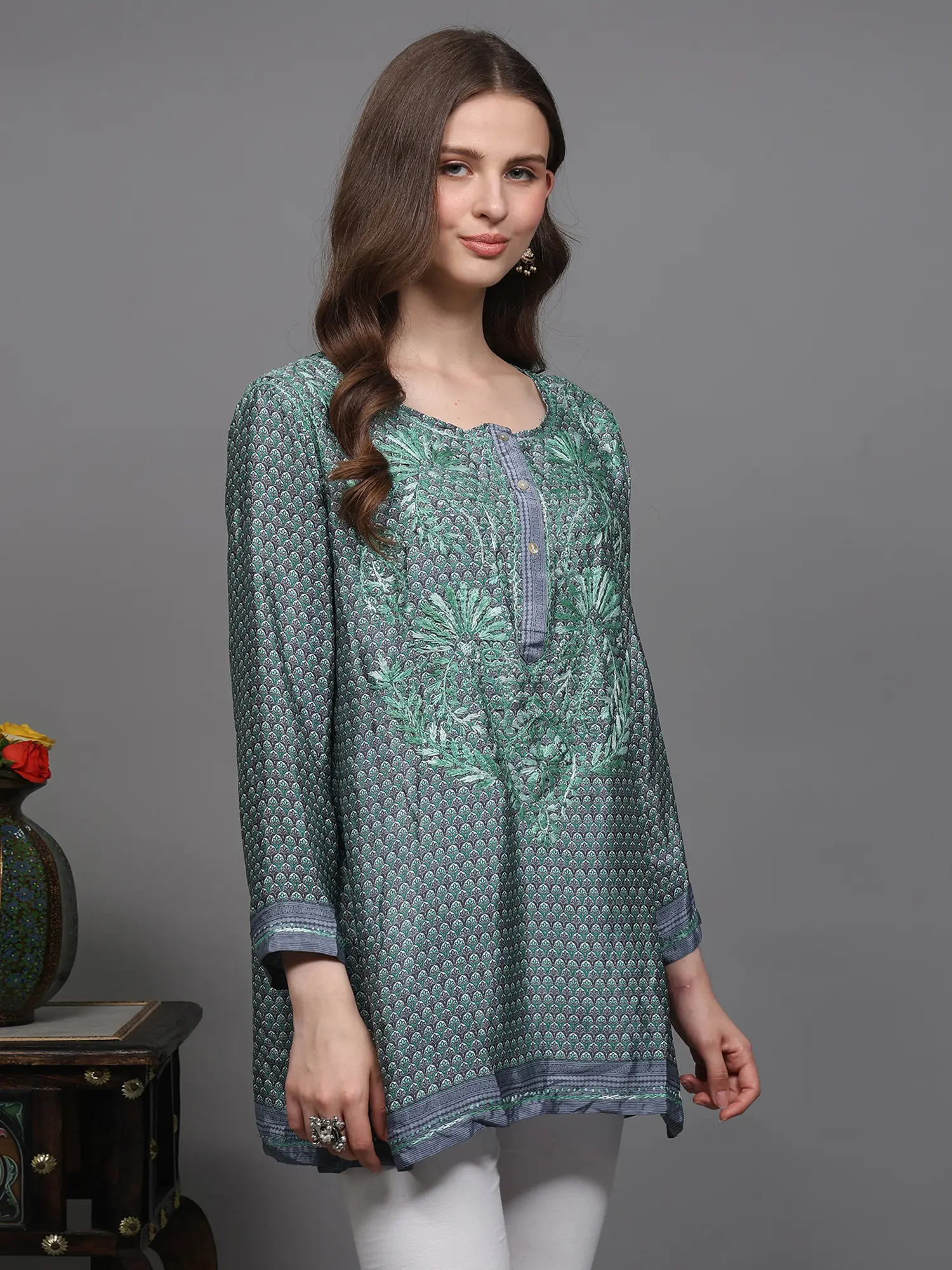 Dusty-Blue Floral Embroidered Short Kurti with Printed Motifs