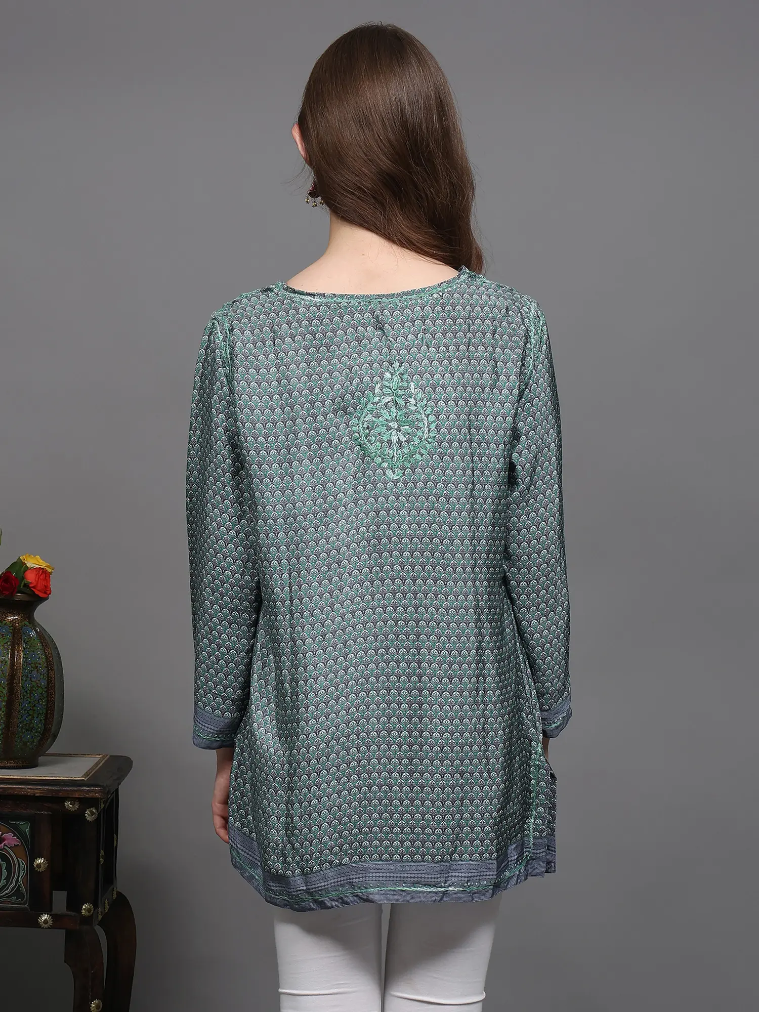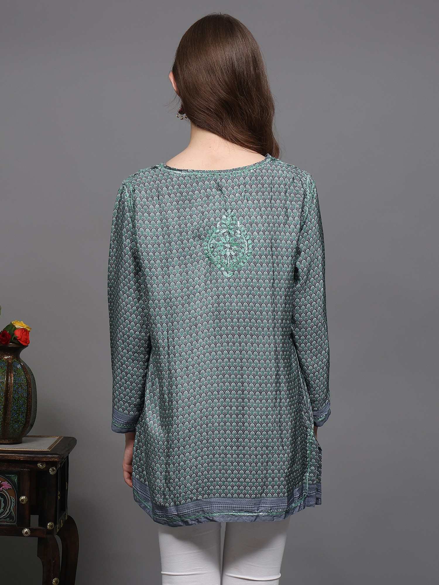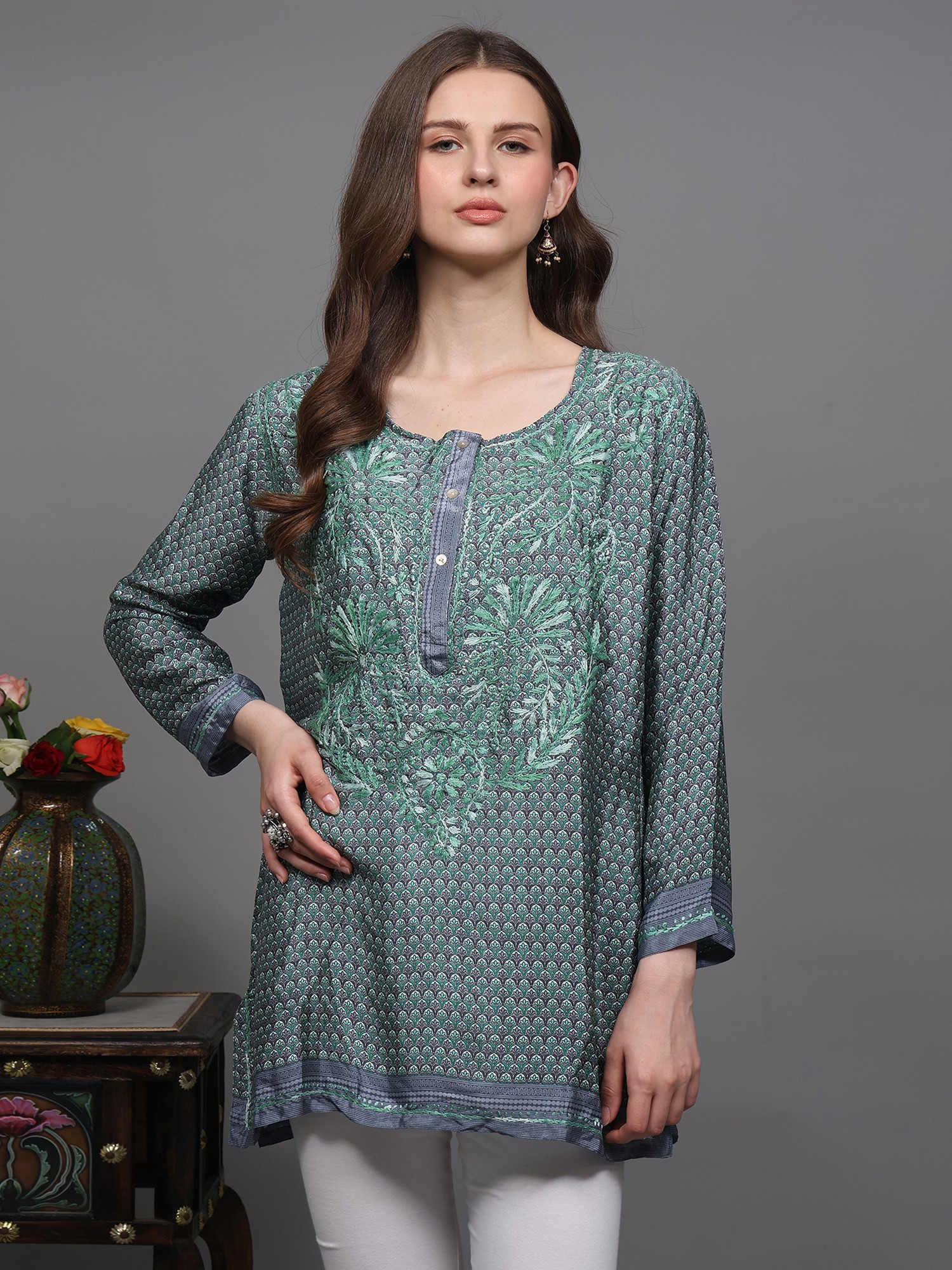 Floral Printed Crepe Short Kurti with Chikankari Embroidery