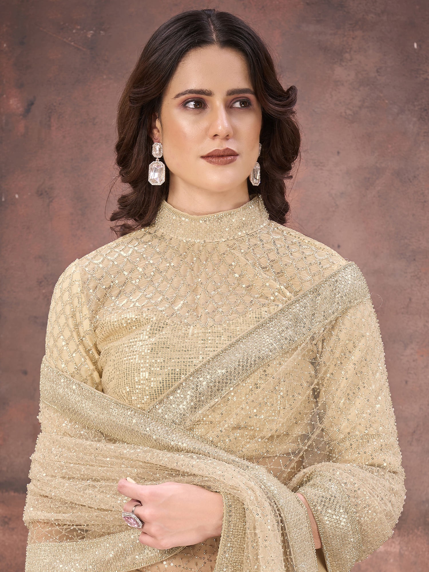 The delicate mesh overlay, intricately adorned with a constellation of beads and shimmering dual sequins, creates a breathtaking visual effect. This embellishment technique catches the light from every angle, offering a captivating play of illumination and shadow. The subtle sheen of the underlying Crush Satin Mononet provides a rich foundation, allowing the sparkling details to truly stand out.