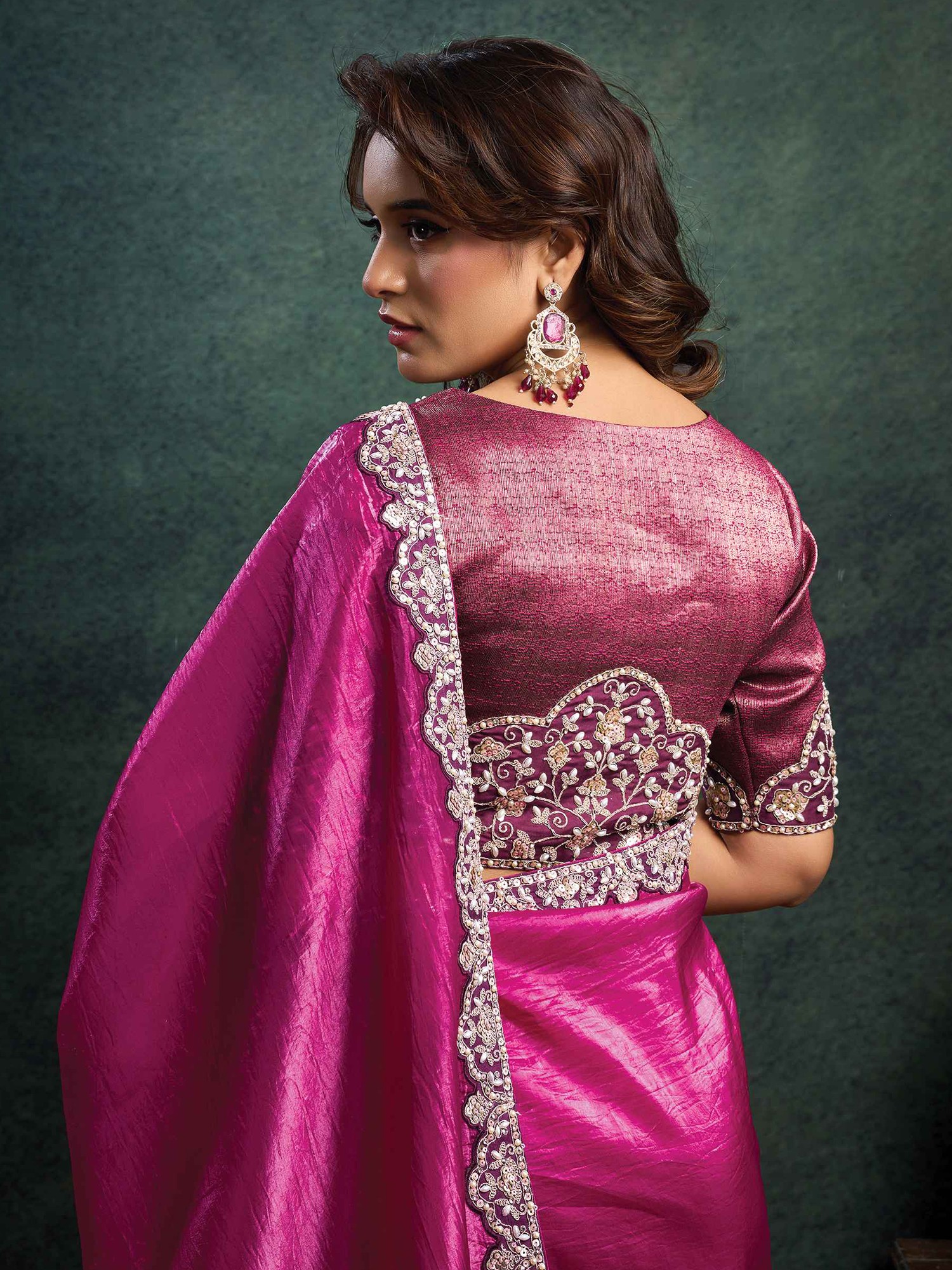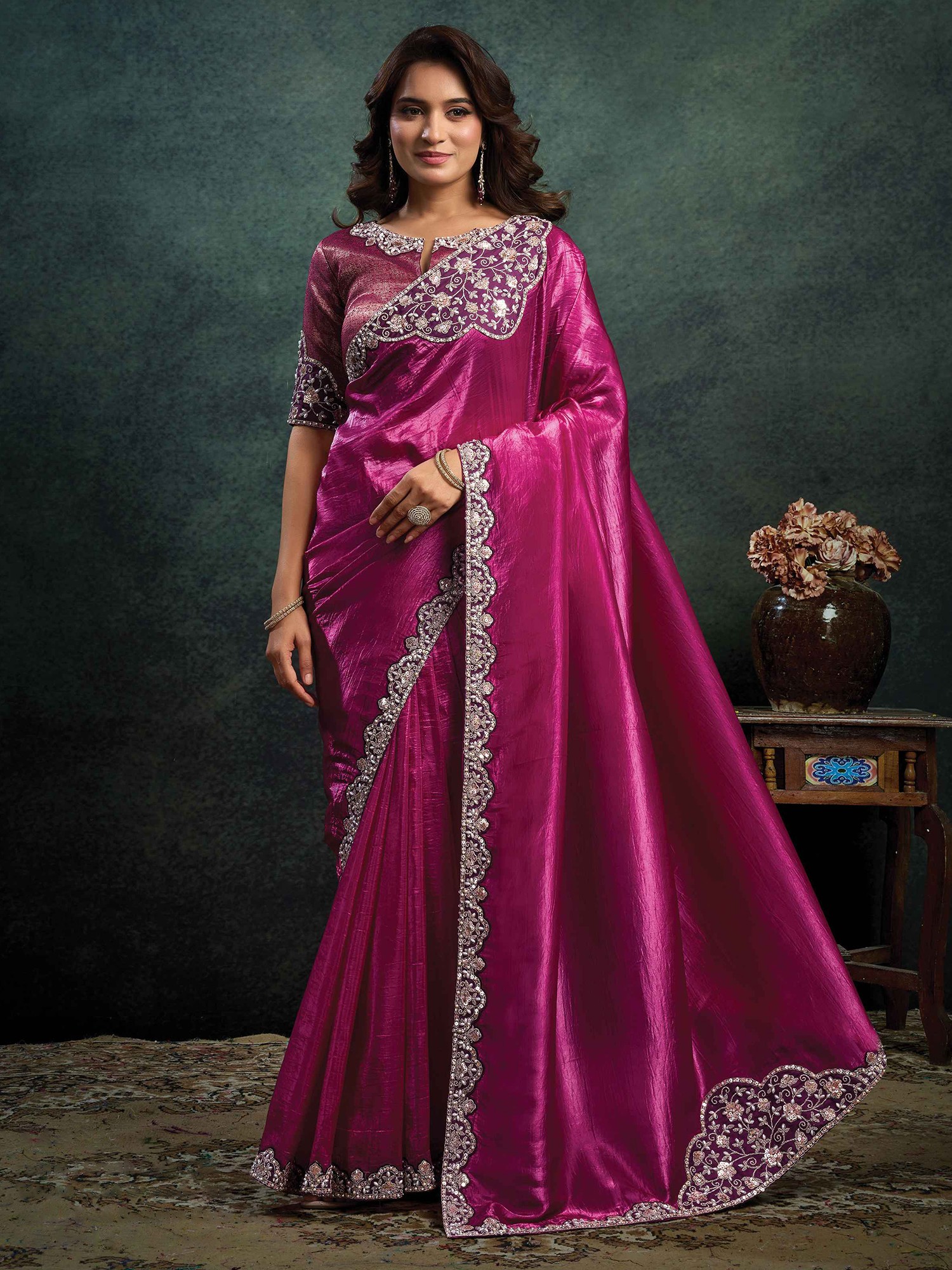 Elegant Bridal Satin Silk Saree With Detailed Dual Sequence Embroidery Pearl And Stone Handwork For Wedding Party And Festive Wear