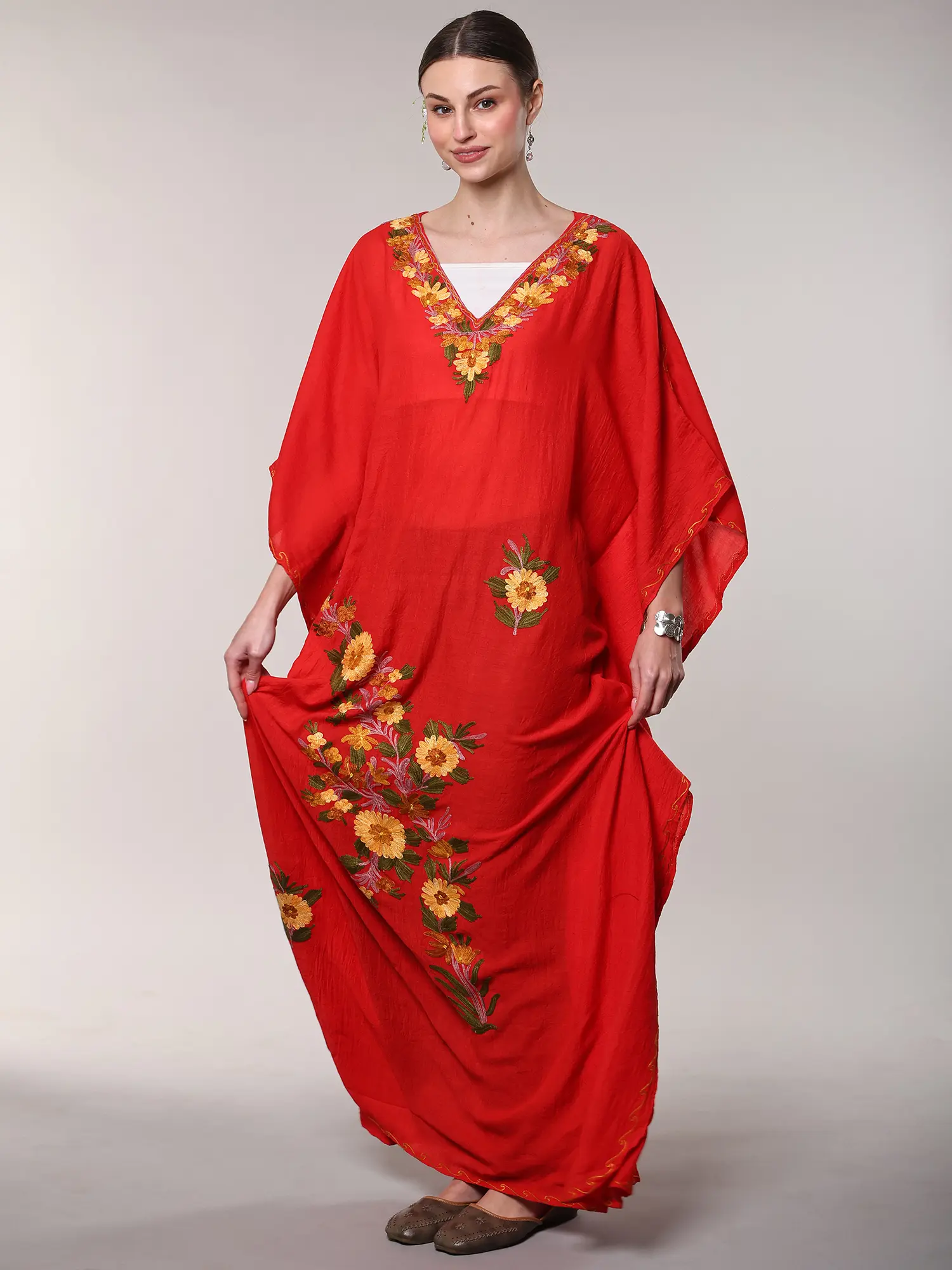 Georgette Kashmiri Long Kaftan with Floral Aari Embroidery
