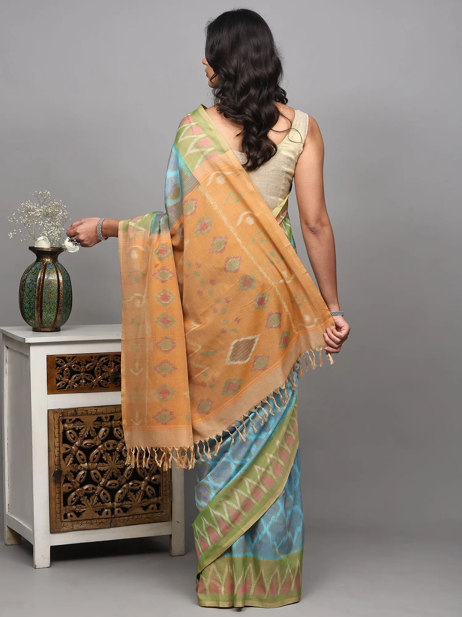This pure cotton Ikat saree is a testament to versatility. Its understated yet captivating design makes it suitable for a myriad of events, from festive gatherings and wedding celebrations to corporate events and formal dinners. The natural drape of cotton ensures you remain comfortable and stylish throughout the day or night. Pair it with statement jewelry and classic footwear to elevate your ensemble, or keep it minimalist for a subtly sophisticated look. The accompanying blouse piece, tailor-made to your size, ensures a perfect fit, allowing you to customize your look with ease. This saree is not just an attire; it's a canvas of tradition waiting to be styled by you.