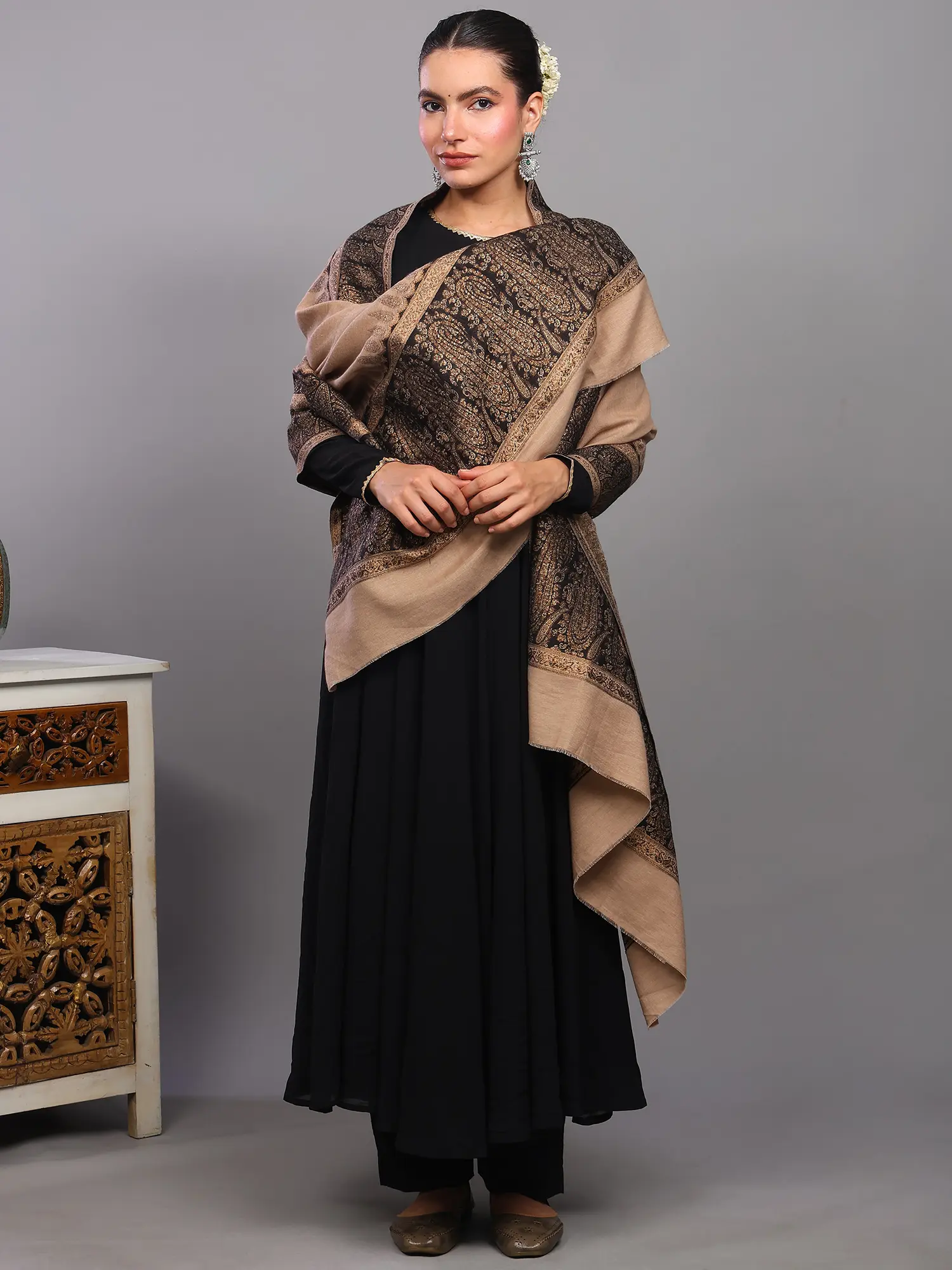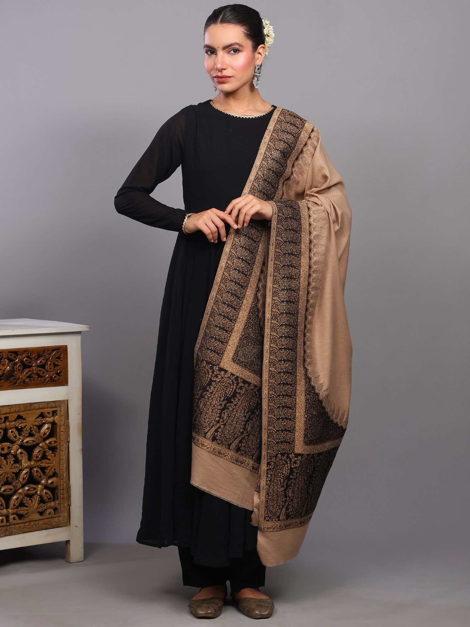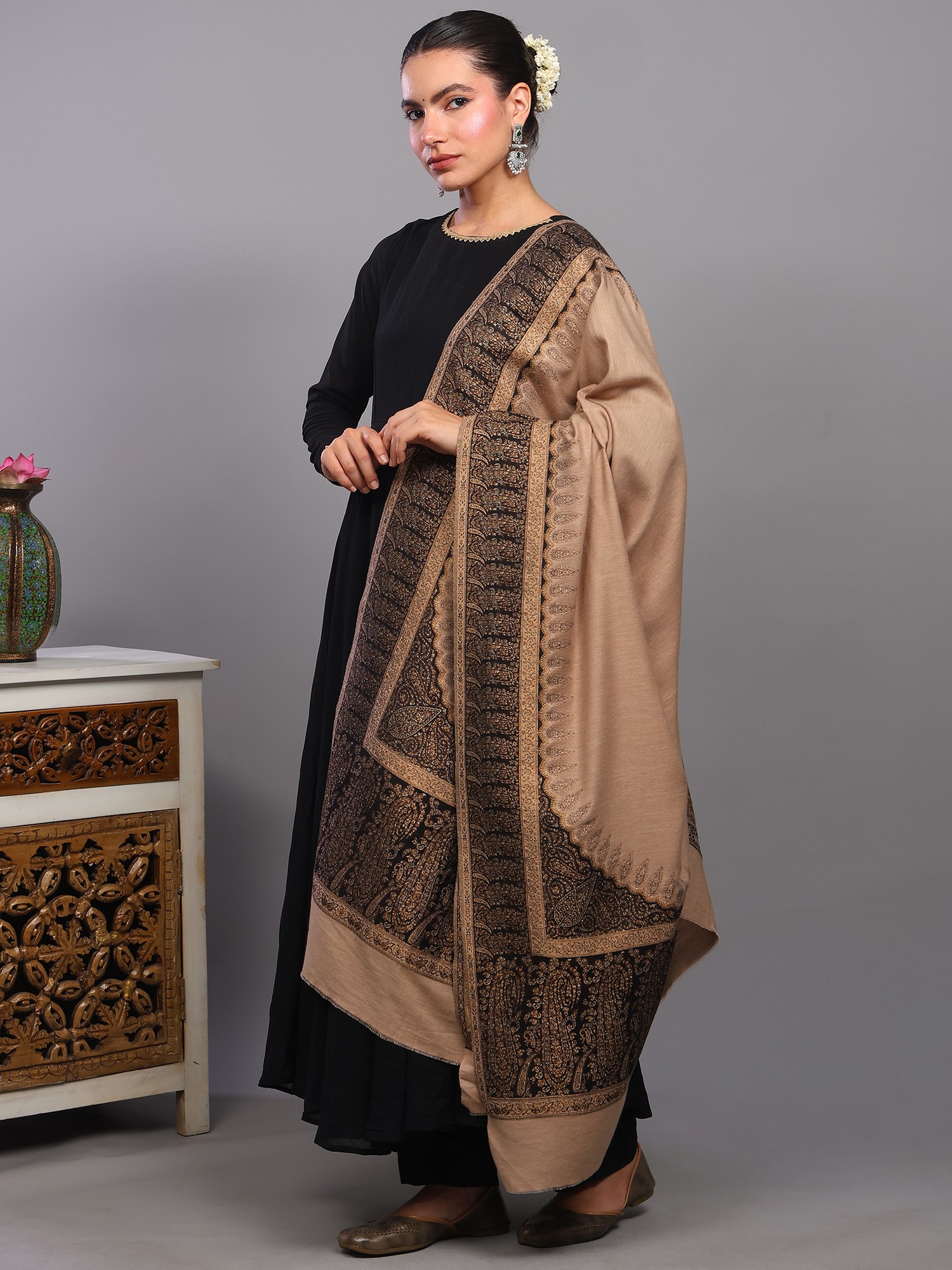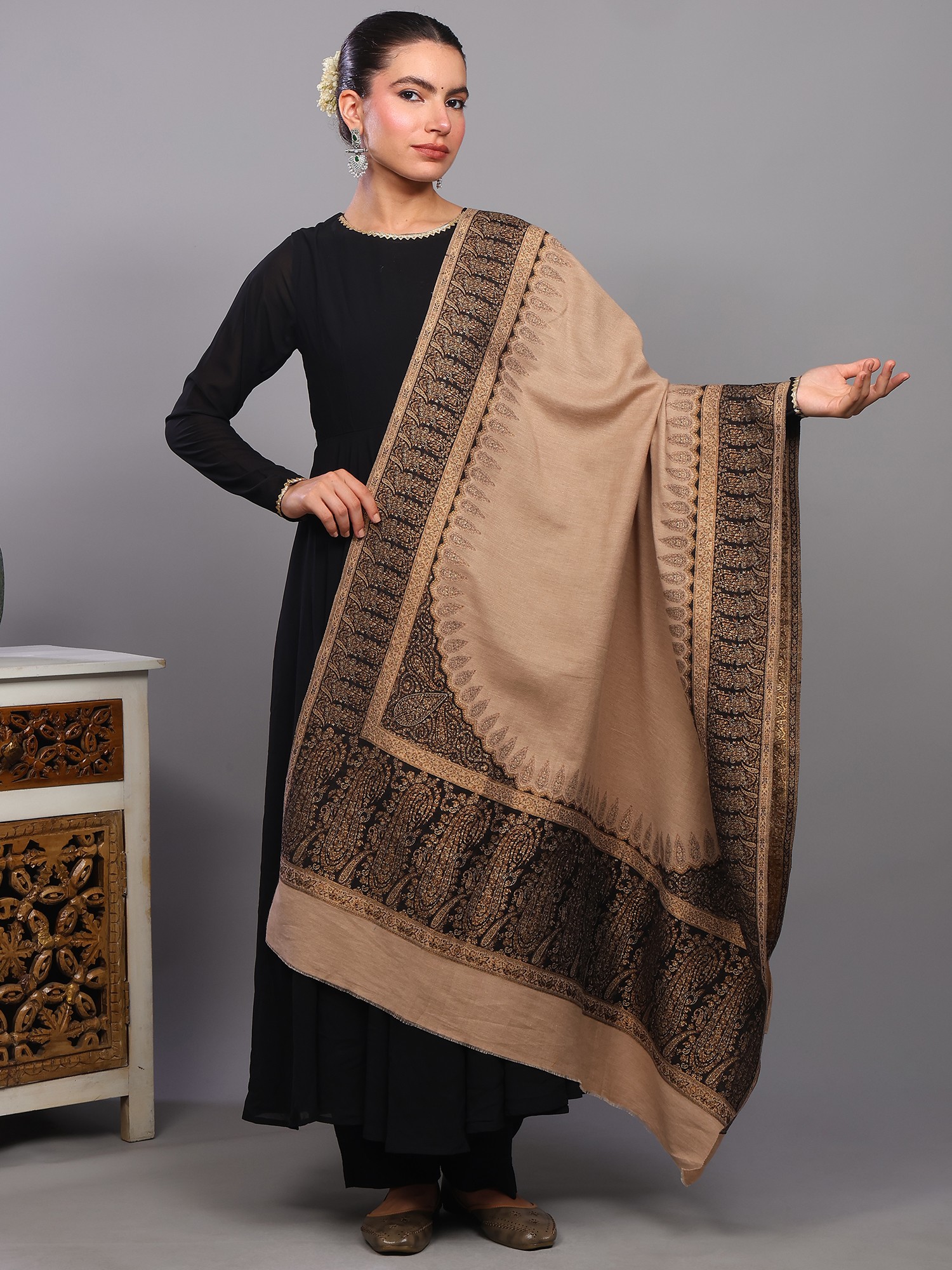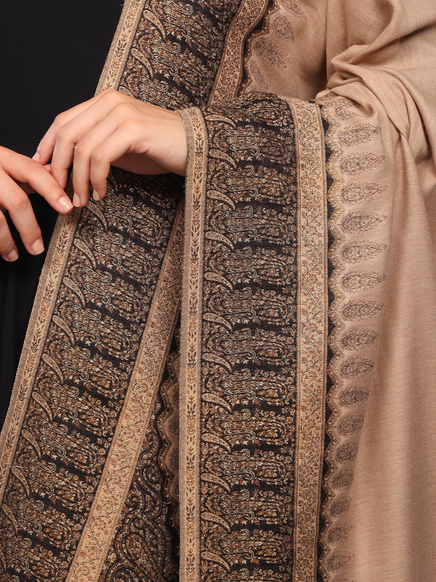Cuban-Sand Wool Shawl with Intricate Zari Woven Paisley Kani Border