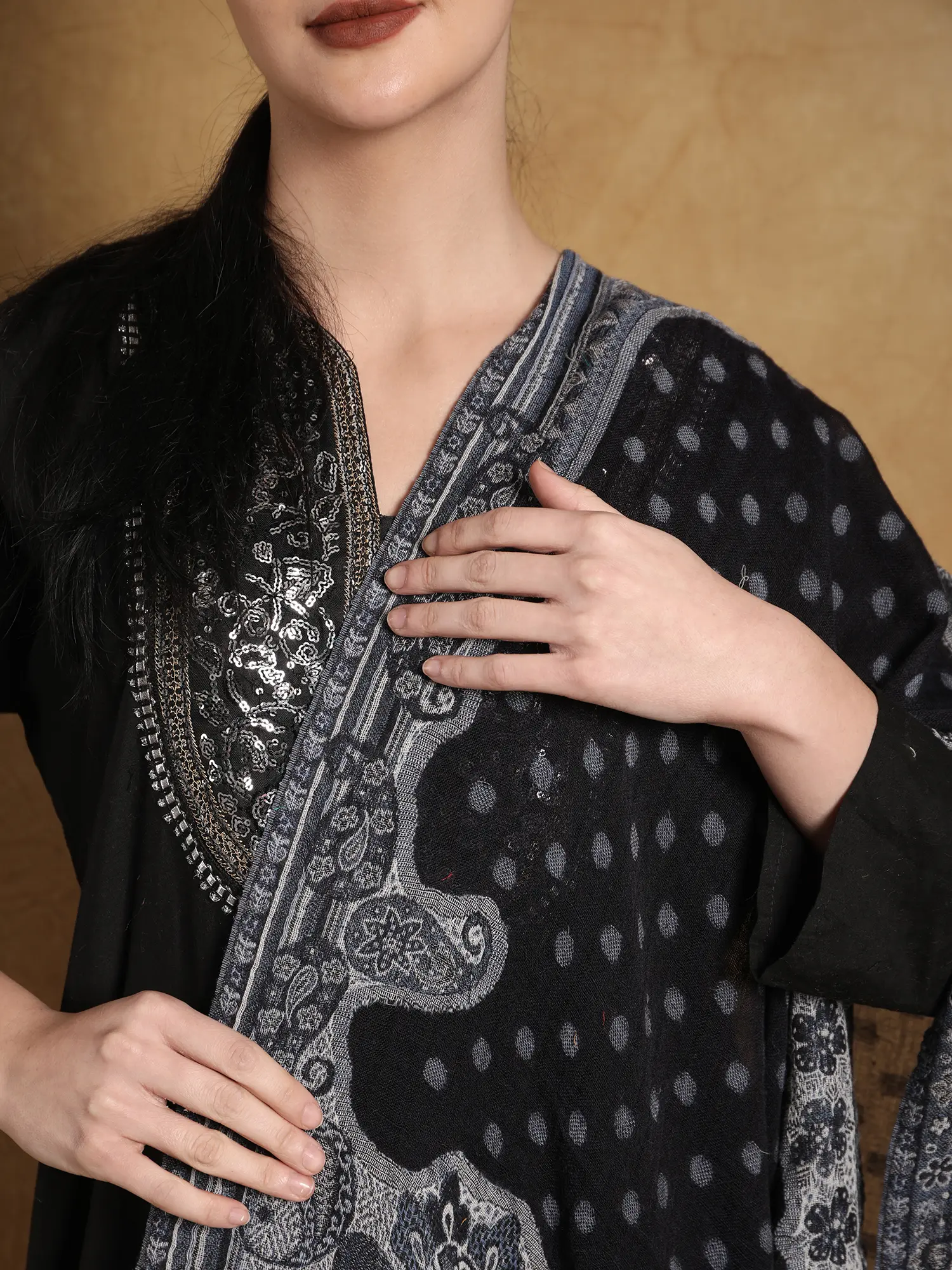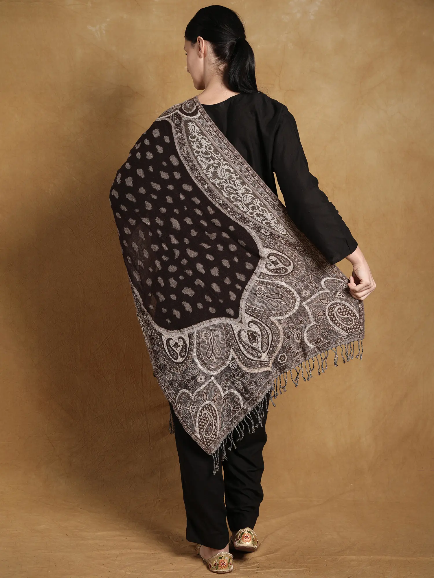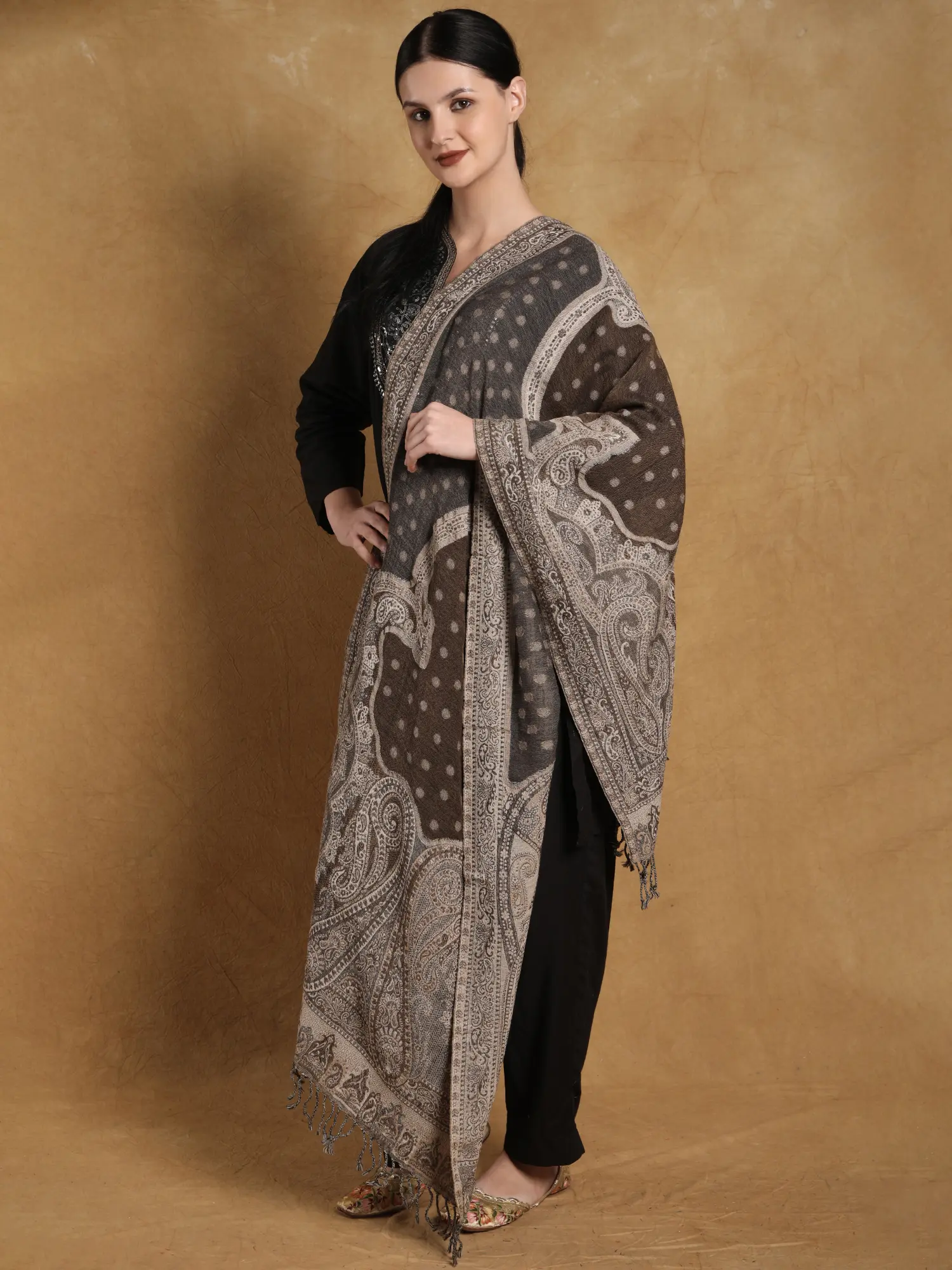 Cutwork jamawar stoles are the most beautiful shawls every lady loves to wear. If you want to get your hands on the right piece, we have got everything covered for you. This exclusive cutwork jamewar stole with woven paisleys and bootis all around it is enough to speak for its ornate artistry. Featuring the chocolate chip colour, this shawl is the way to go. A unique blend of natural beauty and elegance, this piece will elevate your look to a huge extent. Aside from chocolate chips, we have a vast collection of different colours available in it. You can shop for Cloudburst, Gray, Iron, French Blue, Jet Black and Swiss Green coloured stole available in the same design. No matter what your choice is, we have everything covered for you under one roof. Feel free to mix and match these shawls with your attires and get that perfect diva look for your day. Shop today!