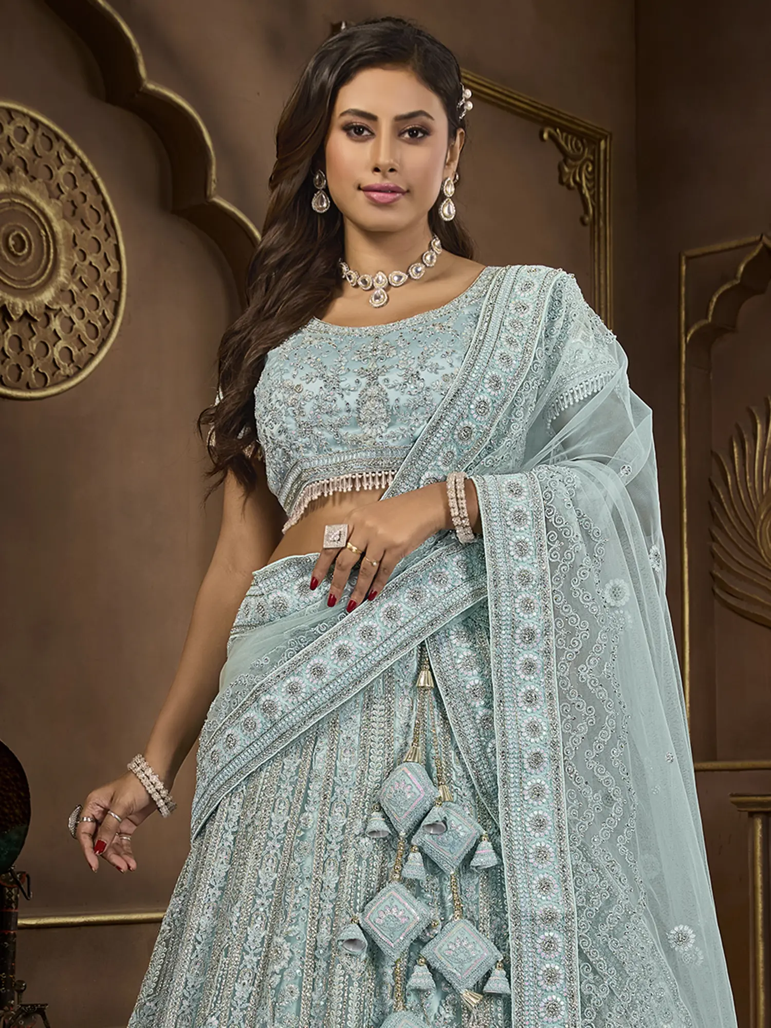 Multi-Colored Lehenga Choli from Rajasthan with Embroidered Flowers and Dori