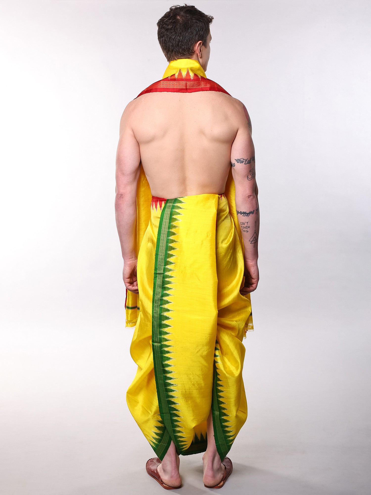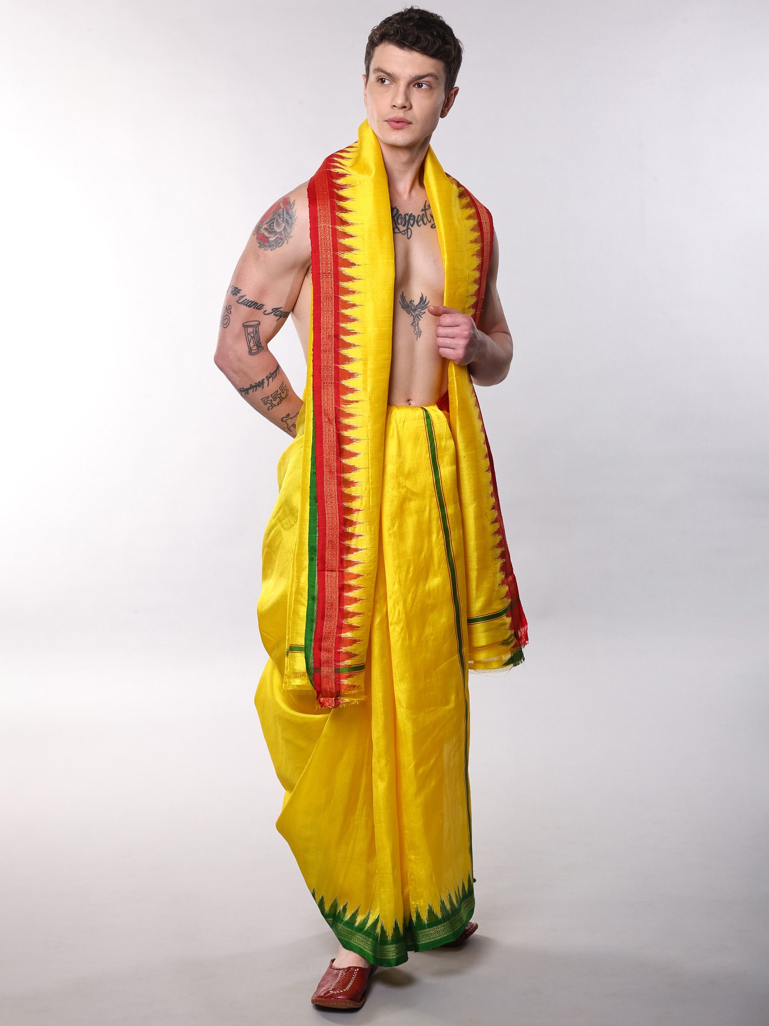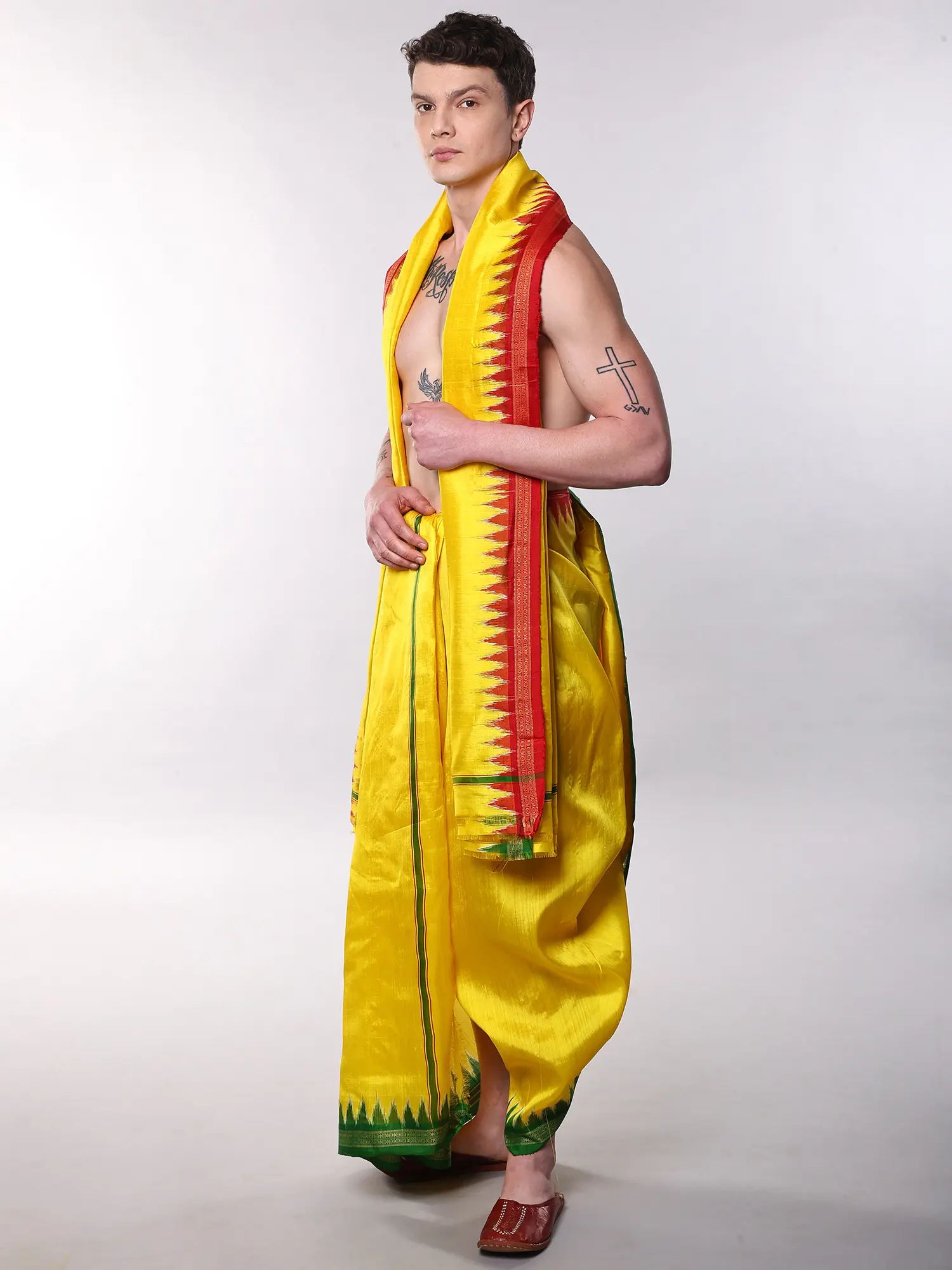 Features a vibrant cyber-yellow pure silk dhoti and complementary angavastram.