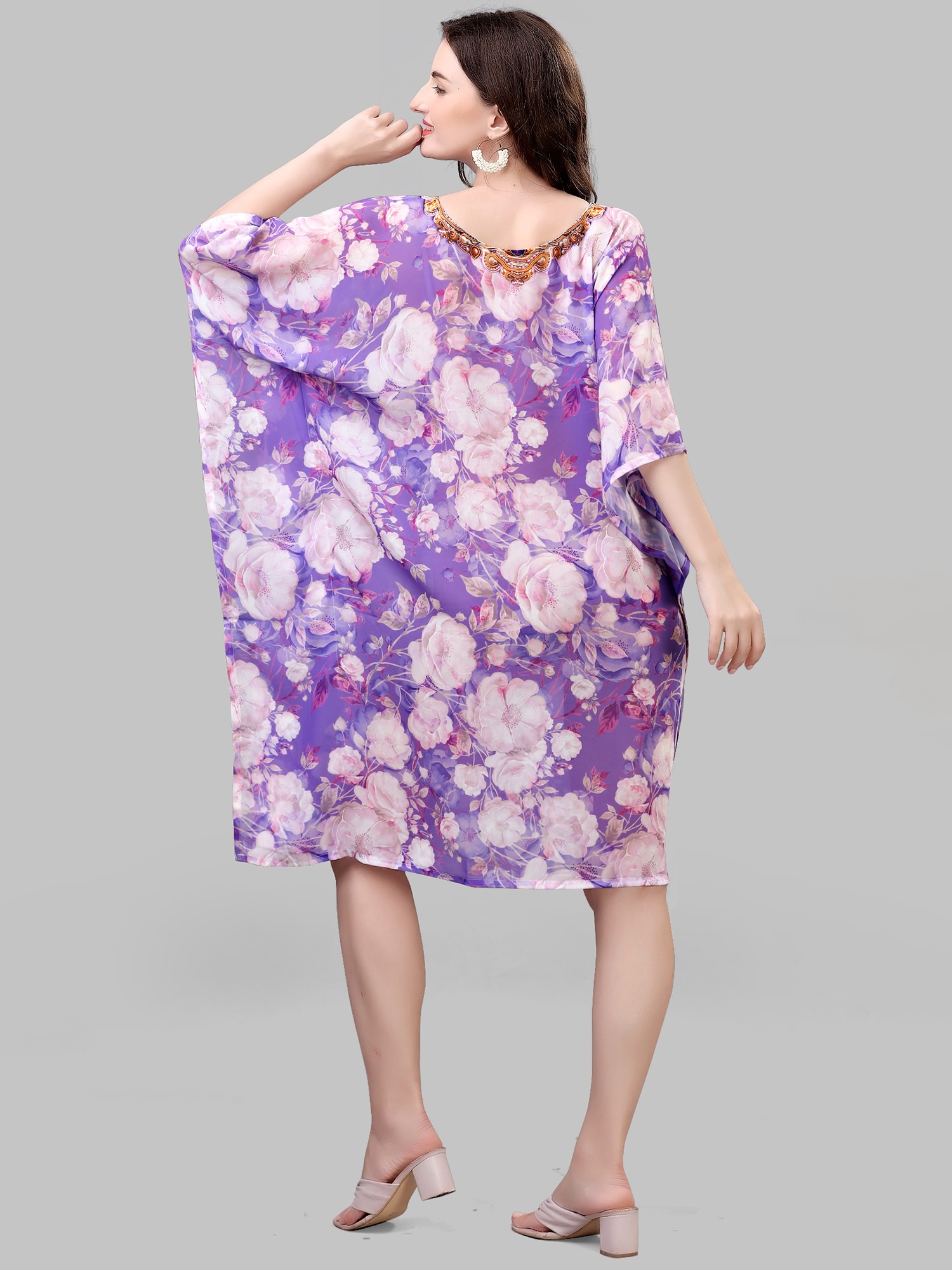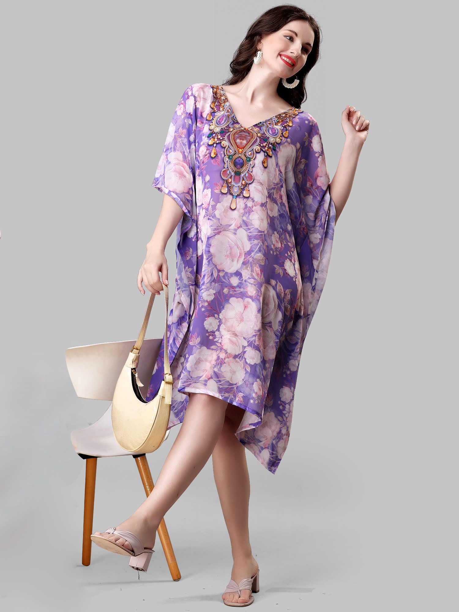 Short Boho Kaftan with Floral Print and Dori on Waist