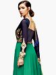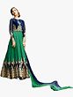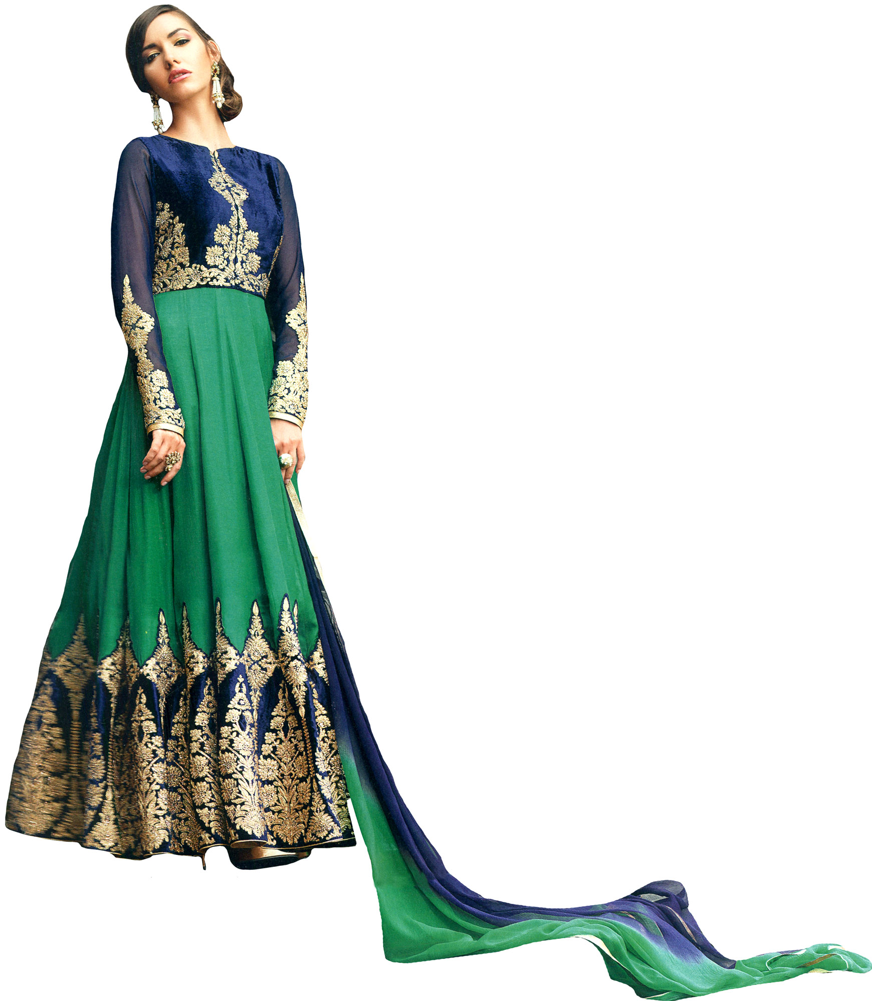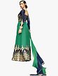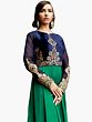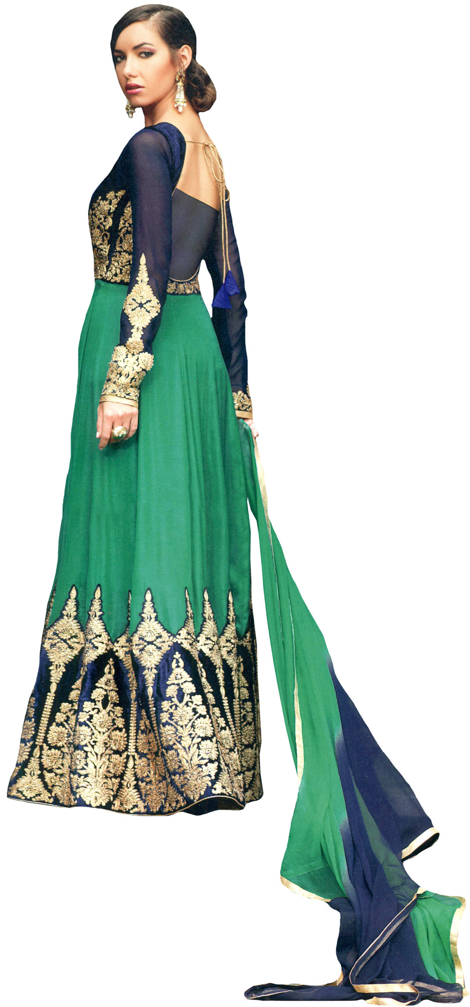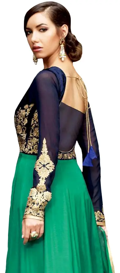Step into a world of regal charm with this exquisite Anarkali suit, a masterpiece designed to make you the center of attention at any wedding or festive occasion. The striking contrast between the deep, luxurious navy blue and the vibrant, refreshing green creates a captivating visual harmony. This ensemble is more than just clothing; it's a statement of refined taste and undeniable grace, promising to elevate your presence and leave a lasting impression.