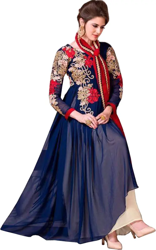 Step into a world of refined grace and sophisticated style with this exquisite Anarkali suit. Crafted from luxurious georgette fabric, this ensemble is designed to make a statement at any special occasion. The rich, dark-blue hue serves as a captivating canvas for the intricate detailing that elevates this piece from ordinary to extraordinary.