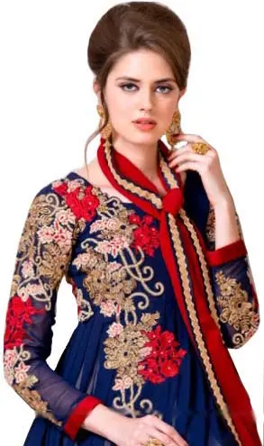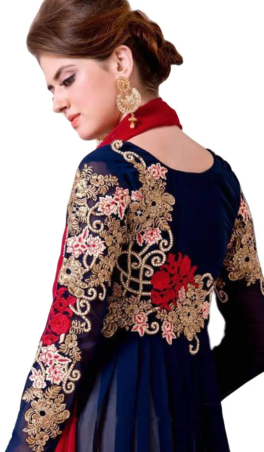 The neckline of the Anarkali is a classic, flattering cut, providing a perfect frame for the intricate embroidery. The sleeves are full-length, ensuring coverage and adding to the overall elegant appeal. A contrasting red border along the neckline and cuffs adds a vibrant pop of color and ties the entire ensemble together harmoniously. The accompanying dupatta, also in a rich dark blue, drapes beautifully, completing the traditional yet contemporary look. This Anarkali suit is more than just clothing; it's a wearable piece of art designed to make you feel confident, elegant, and utterly unforgettable.