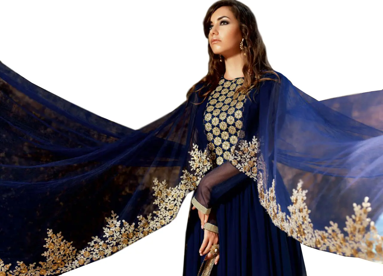 With an enchanting blue and stylish flow of net, this designer three-piece gown takes your breath away with its enchanting golden details. The flowy gown is decorated with embroidery and sequins, which create floral motifs all over the torso. A mesh of floral vines is stitched on the cape of the gown, which becomes a dramatic addition to your look. Paired with a dupatta that brings a traditional look to this regal and stylish contemporary attire, the designer gown needs no accessories to give you a queenly allure.