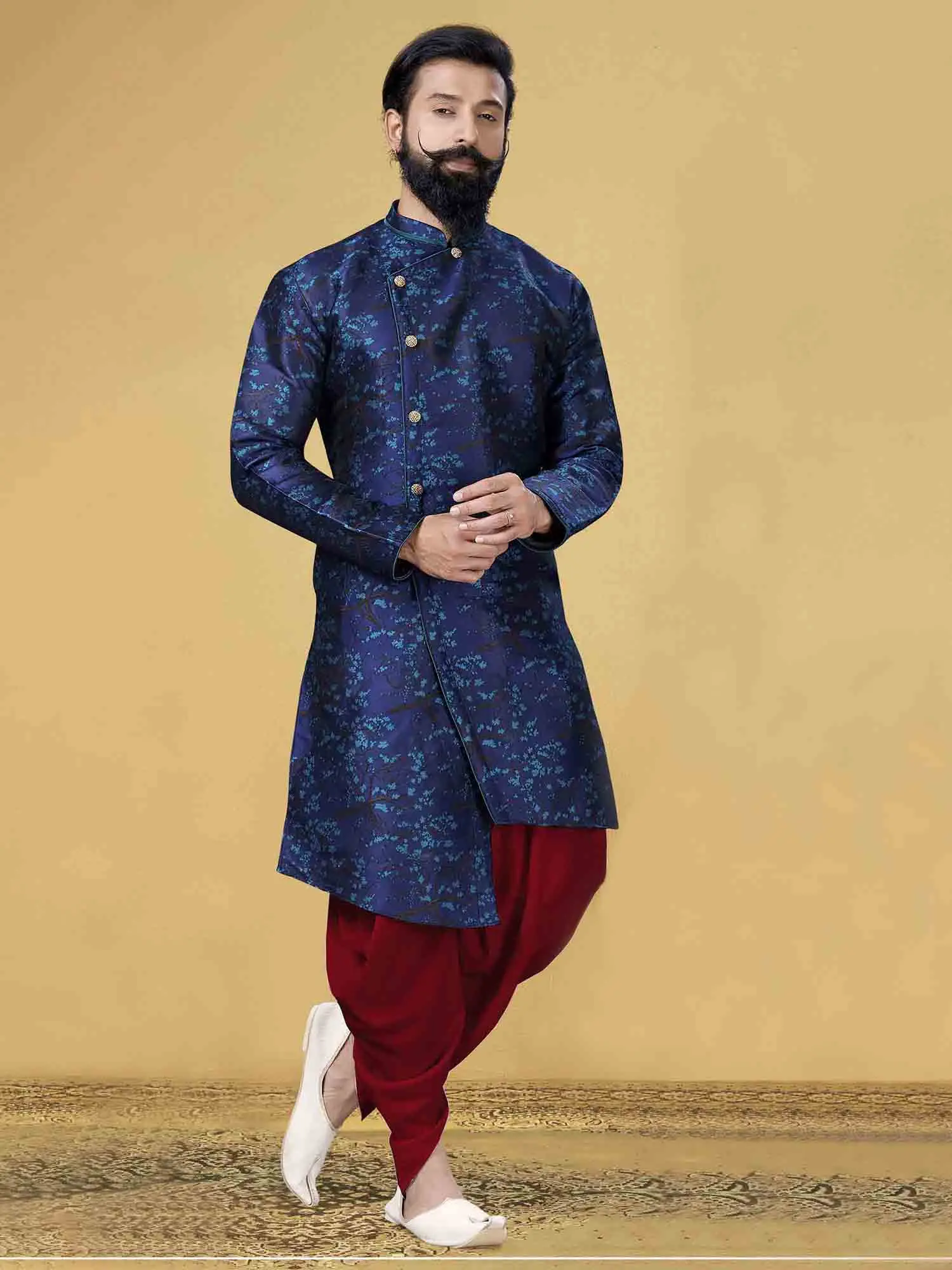 Elevate your festive and formal wardrobe with this stunning Indo-Western ensemble, designed for the discerning gentleman. This set masterfully blends traditional Indian aesthetics with contemporary styling, offering a sophisticated and dapper look perfect for weddings, cultural events, and special occasions. The rich, dark blue hue of the kurta provides a timeless canvas, while the intricate vine pattern woven into the heavy silk fabric adds a touch of subtle opulence.