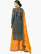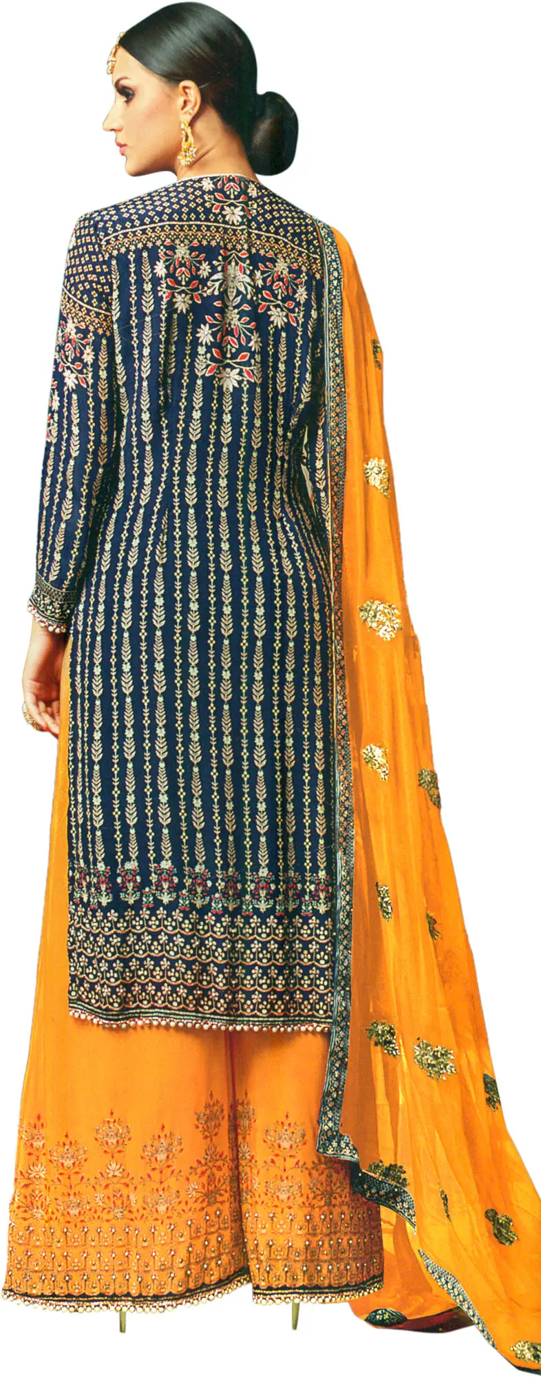 Complementing the kameez are the wonderfully flared palazzo pants. Rendered in a radiant, sun-kissed orange, these pants offer a dramatic and stylish silhouette. The vibrant hue provides a stunning contrast to the deep denim of the kameez, creating a harmonious and striking color palette. The hemline of the palazzo pants is also richly decorated with elaborate printed patterns and subtle embellishments, mirroring the intricate detailing on the kameez. This ensures a balanced and luxurious feel throughout the entire outfit. The generous flare of the palazzo pants adds a modern twist to the traditional salwar kameez, offering both comfort and undeniable style.