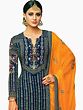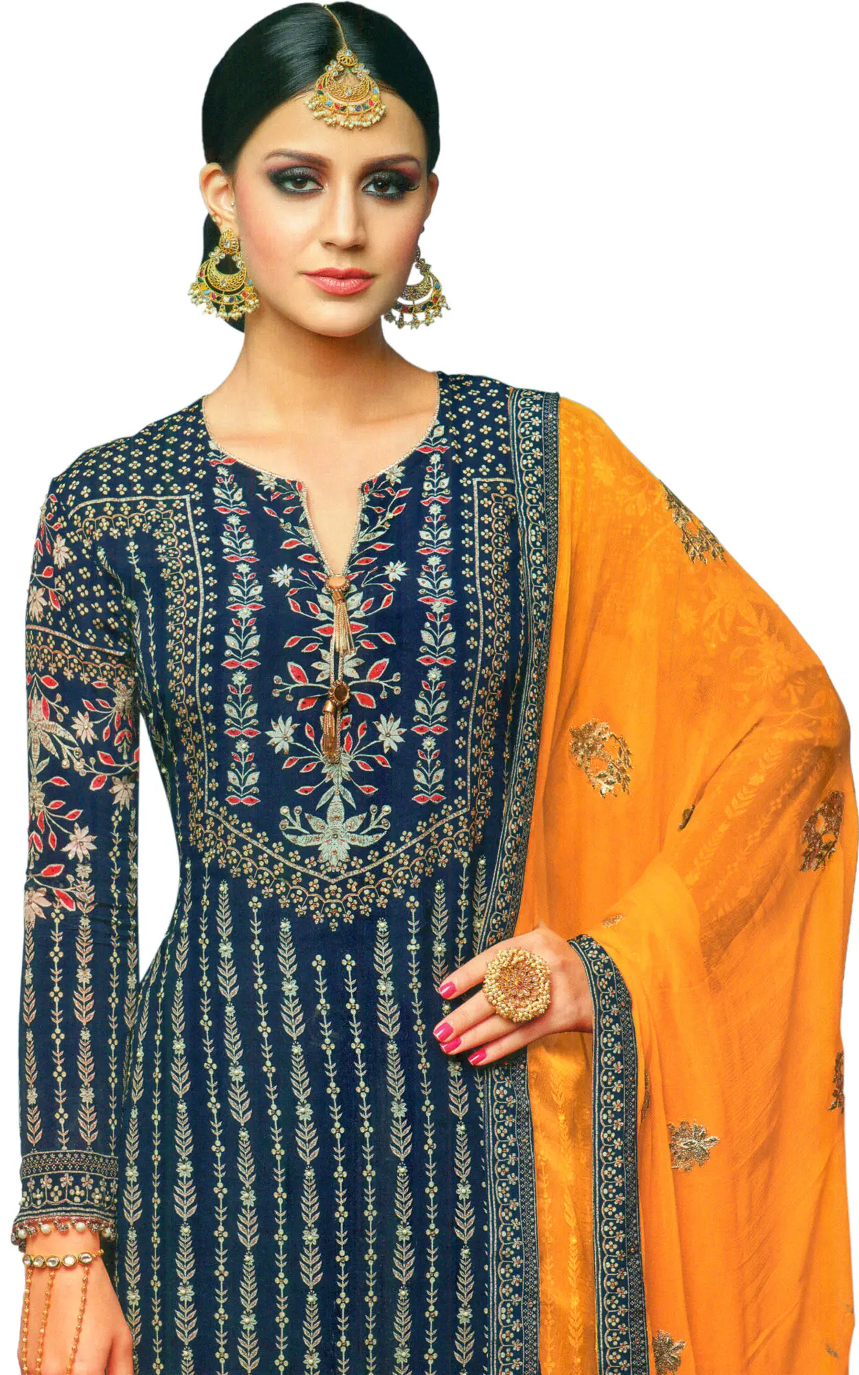 Step into a world of refined elegance and eye-catching beauty with this exquisite salwar kameez suit. The deep, dark denim hue of the kameez provides a sophisticated canvas for a tapestry of intricate prints and shimmering crystals. This is more than just an outfit; it's a statement piece designed to turn heads and leave a lasting impression.
