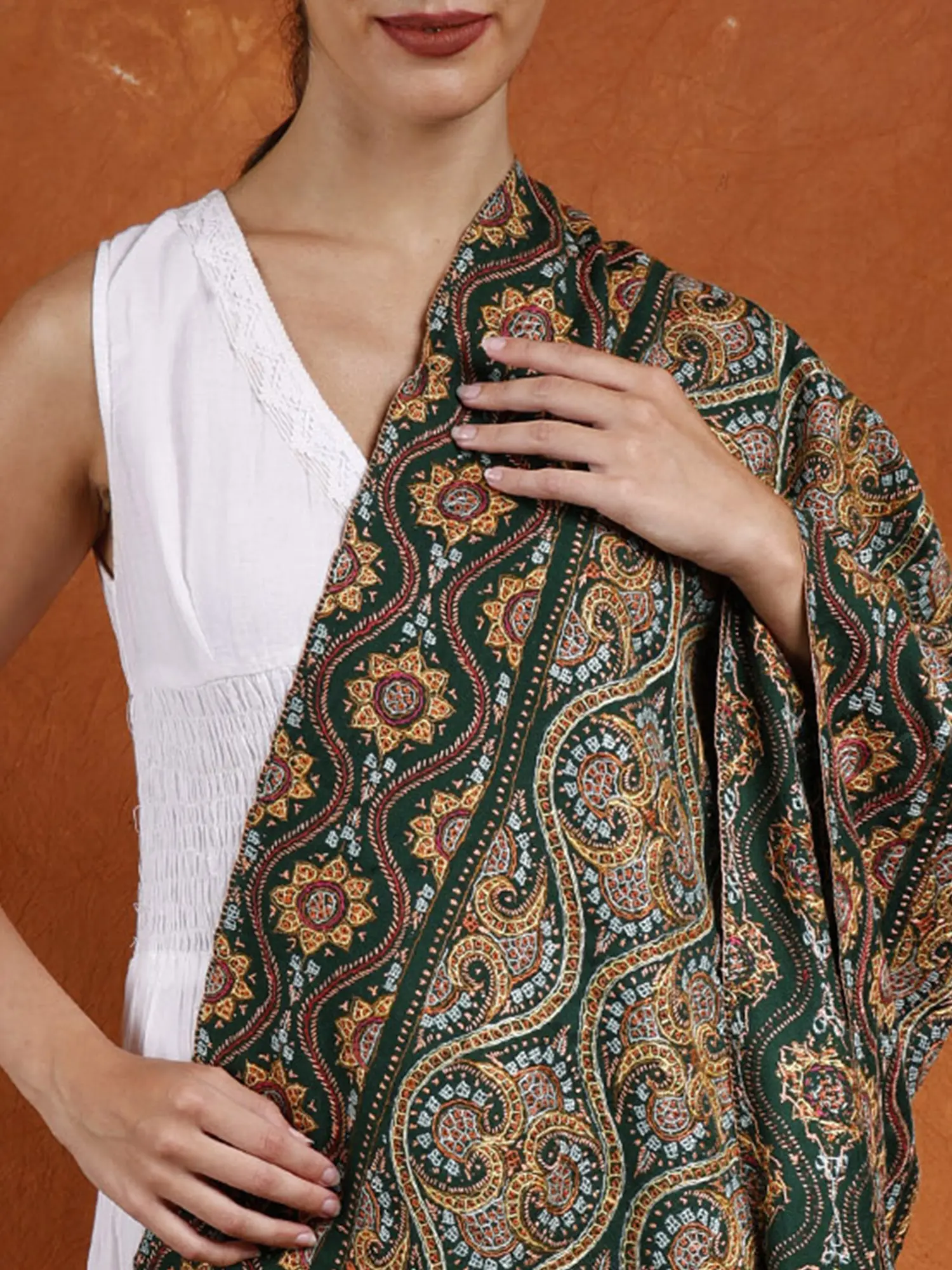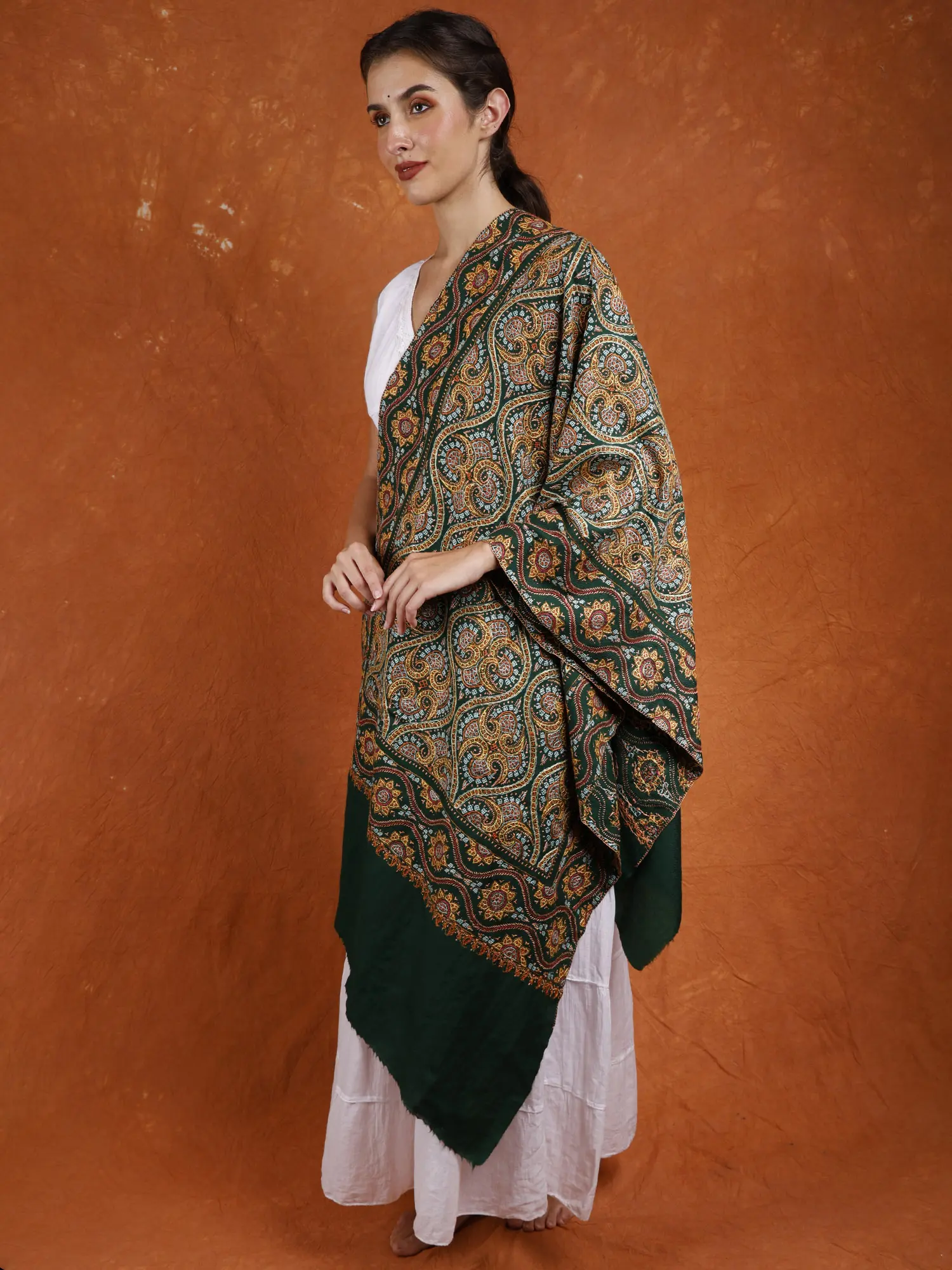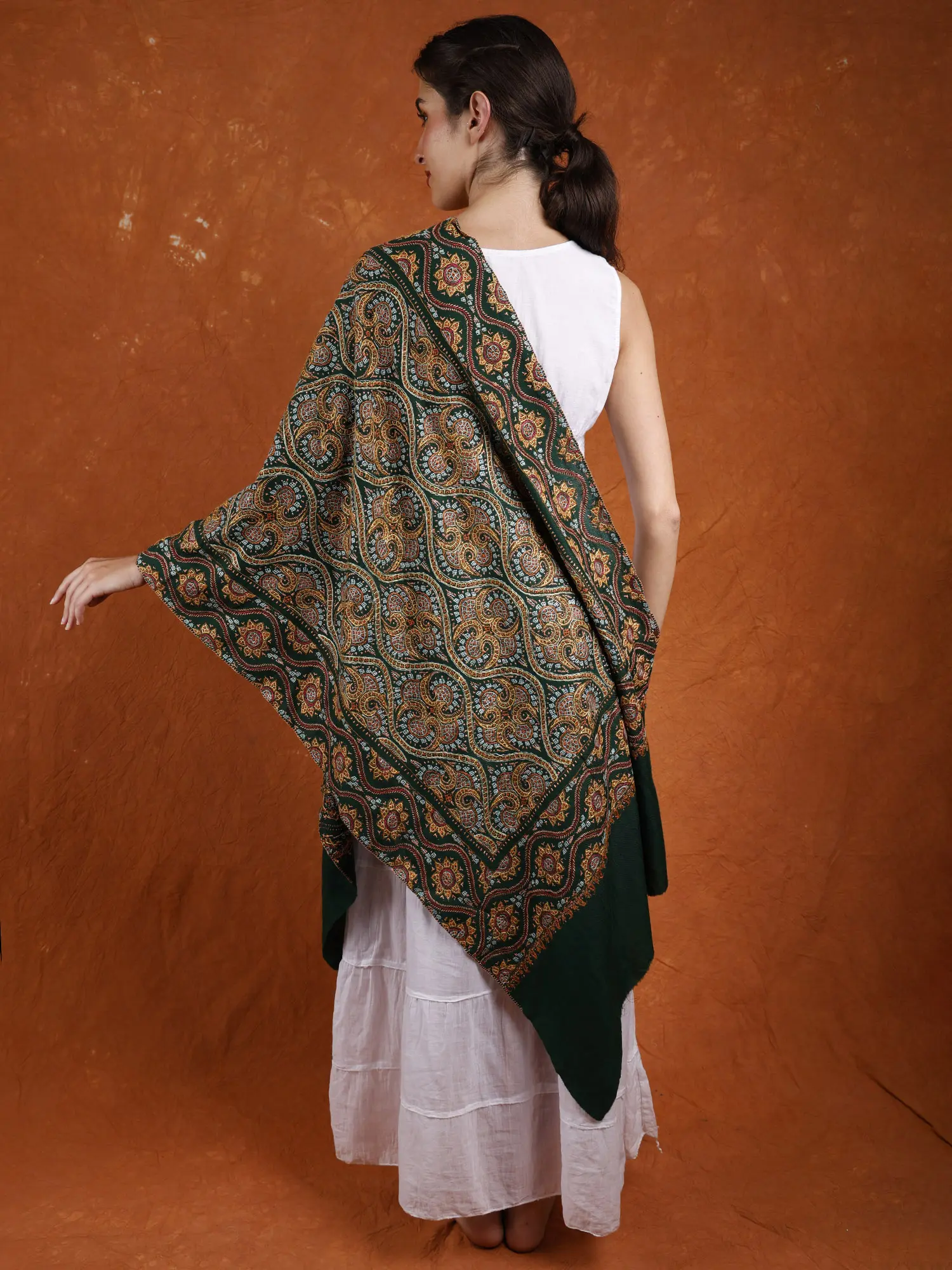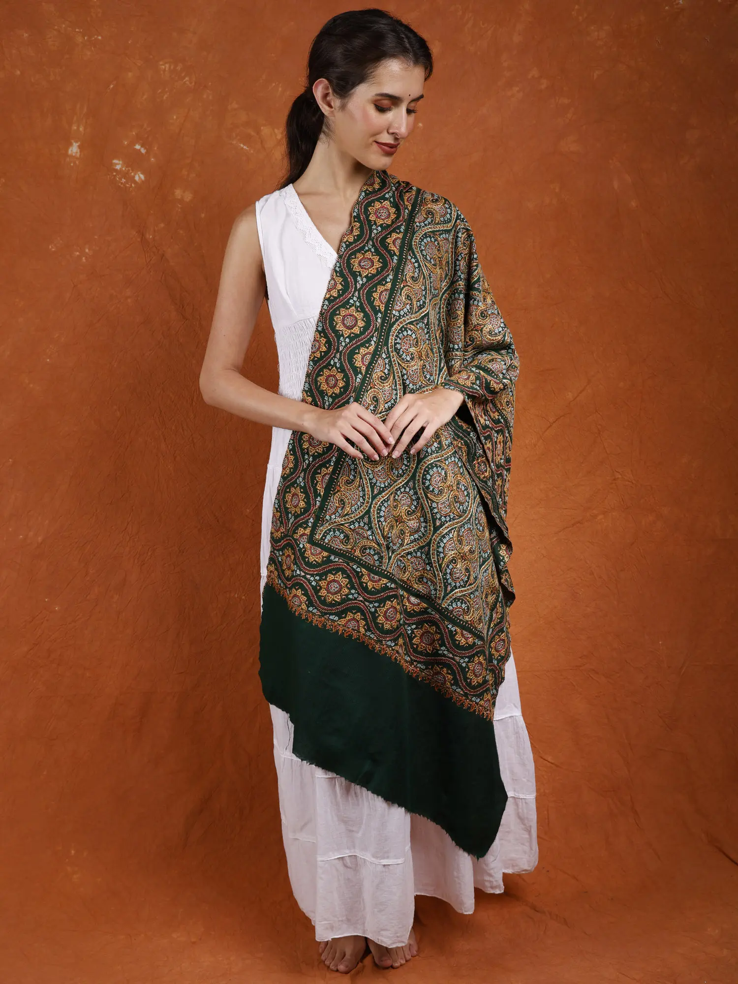 In the depths of winter's embrace, the Dark-Green Pure Wool Stole from Kashmir emerges as a poetic ode to elegance and craftsmanship. Handcrafted with meticulous care, each stitch of Sozni embroidery tells tales of ancient artistry and tradition. The verdant hue of the wool evokes the lush valleys of Kashmir, while the intricate motifs dance with grace along the fabric's edge.