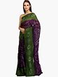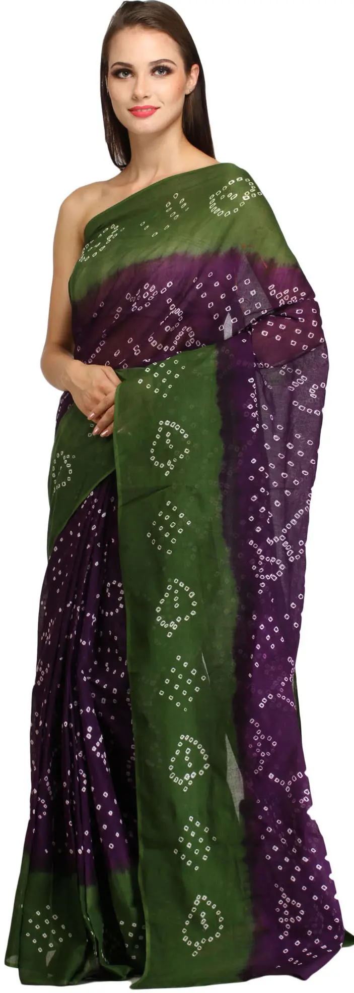 Immerse yourself in the rich heritage of Rajasthan with this exquisite Bandhani tie-dye sari, a true masterpiece from the vibrant city of Jodhpur. Crafted from pure cotton, this sari offers a breathable and comfortable feel, perfect for any occasion, from festive celebrations to elegant evenings. The intricate tie-dye technique, a centuries-old Indian art form, results in a captivating interplay of deep, alluring dark purple and refreshing, natural green. Each knot tied by hand before dyeing creates the characteristic circular or diamond patterns, making every sari a unique piece of wearable art.