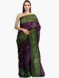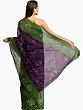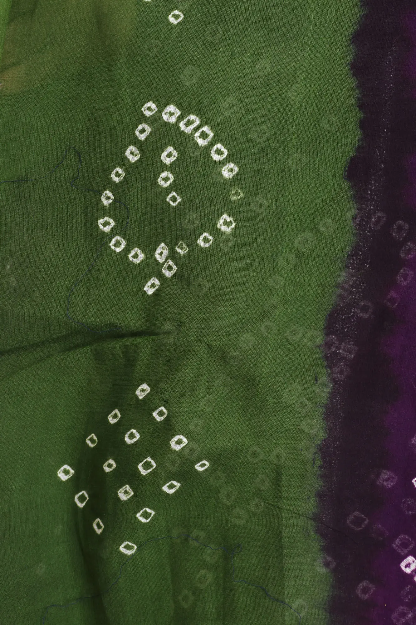 The striking contrast between the rich dark purple and the lively green creates a visually stunning effect. The bandhani patterns, rendered in a delicate white, pop against the bold hues, adding a touch of sophistication and charm. The gradient transition between the colors further enhances the visual appeal, giving the sari a dynamic and flowing appearance. The border of the sari showcases a more concentrated bandhani pattern, framing the garment beautifully and adding an extra layer of detail. This sari is more than just clothing; it's a testament to the skill and dedication of traditional artisans.