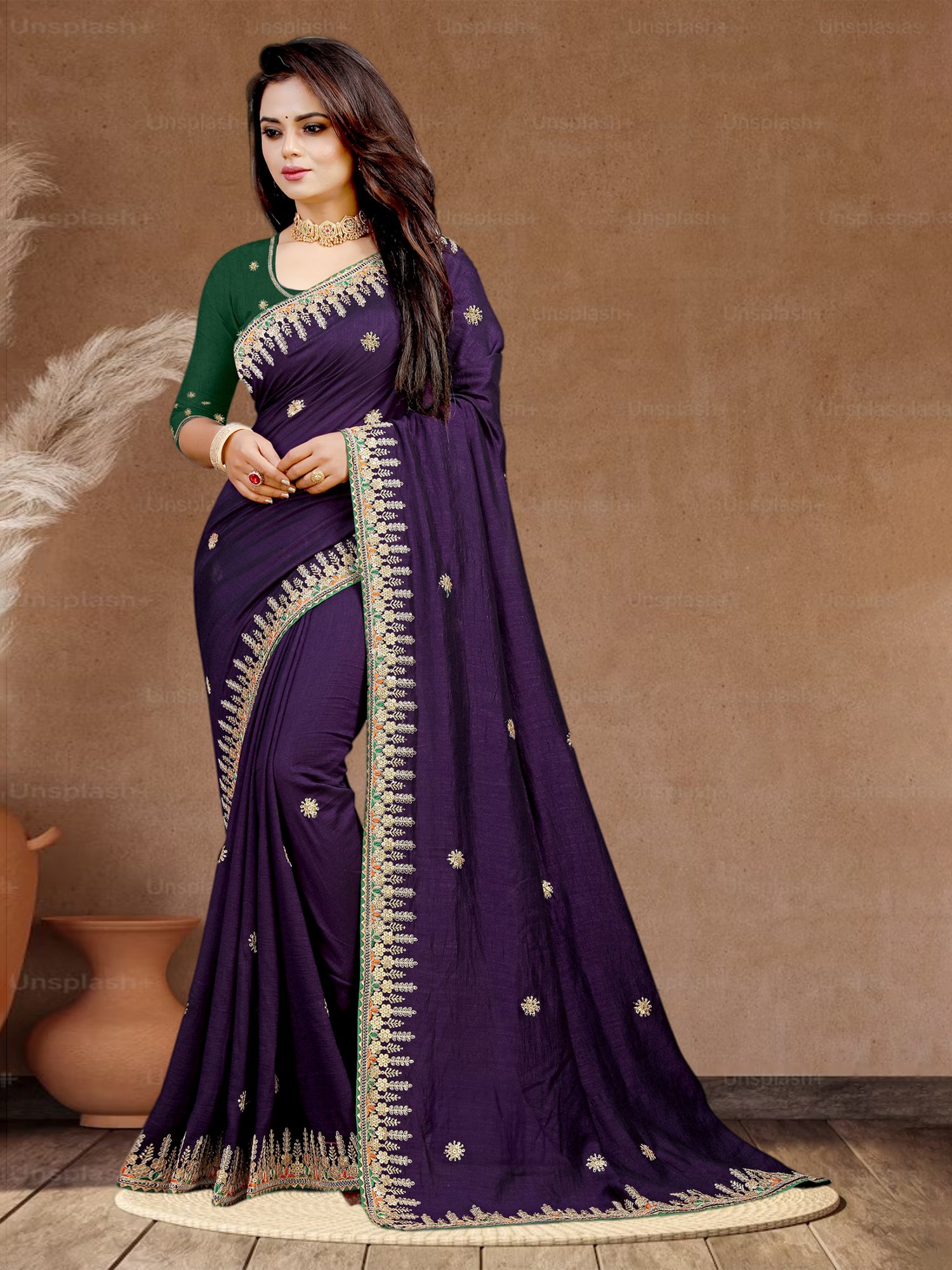 Step into the spotlight with this stunning saree, designed to make a lasting impression. The rich, dark-purple hue exudes sophistication and adds a touch of regal charm to your ensemble. Crafted from luxurious Vichitra silk, the saree drapes beautifully, enhancing your natural grace and ensuring comfort throughout the event. This is more than just a piece of clothing; it's a statement of confidence and refined taste.