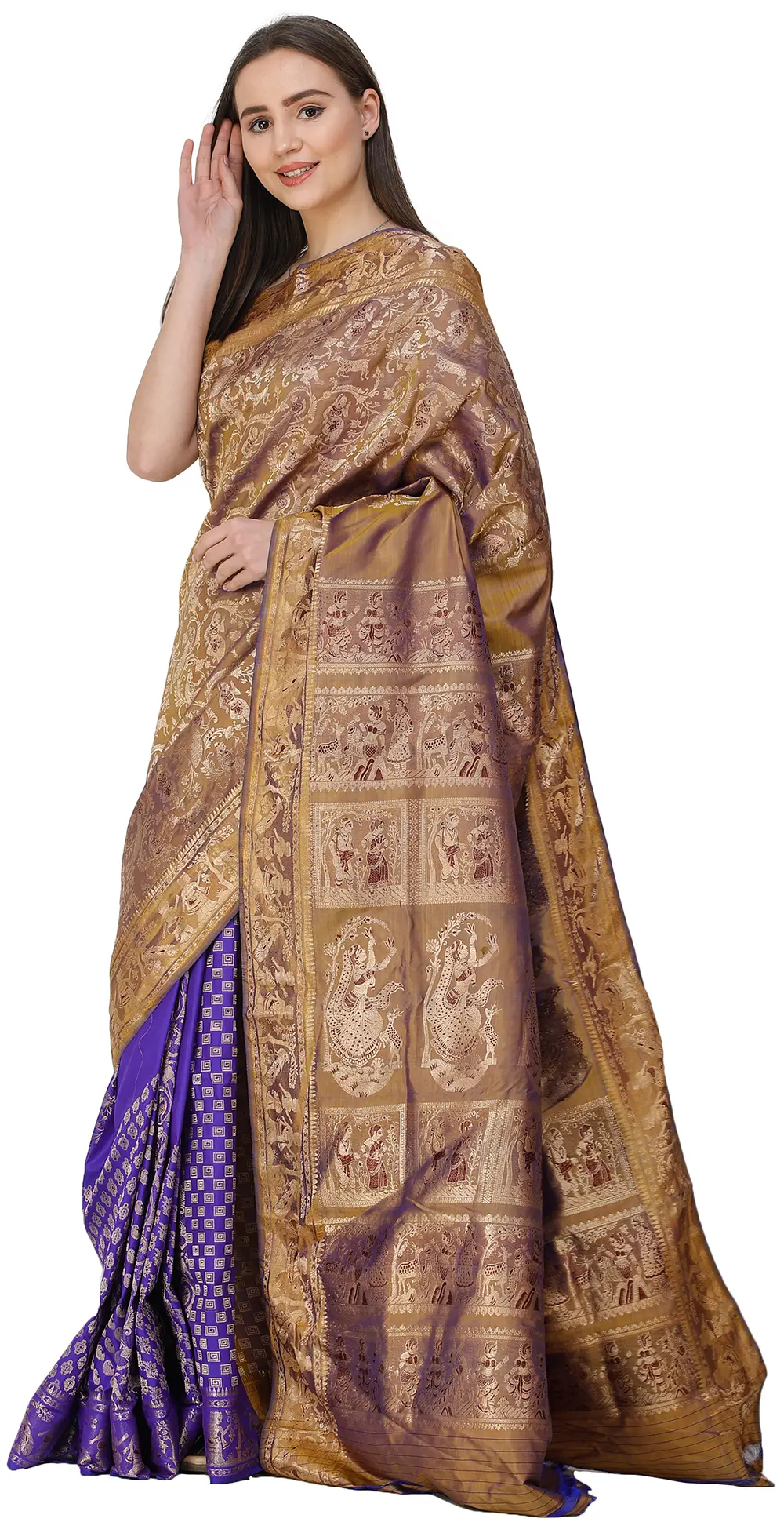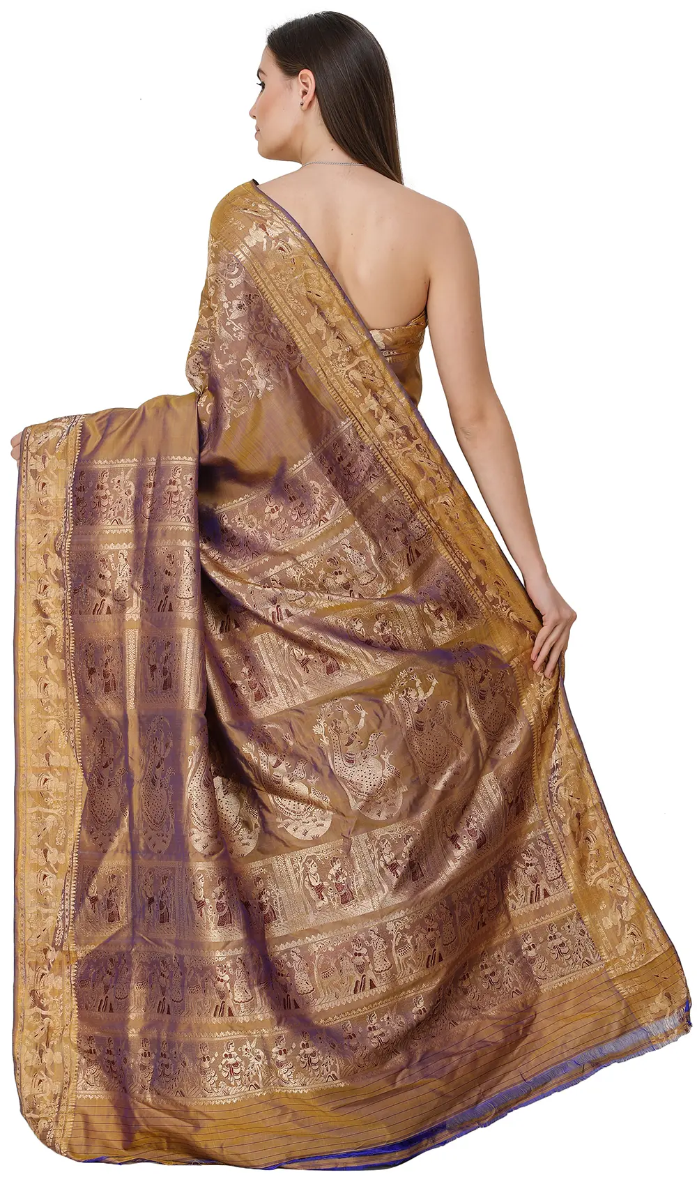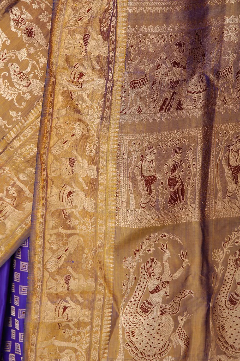Intricate patterns flow on the border, along with a repetition of human figures which is a classic element in Balucharis. The drama gets richer on the pallu, where eye-catching woven patterns of natural elements and beautiful maidens with nature infuse the drape with a lovely tale of the connection between the fecundity of nature and women.
