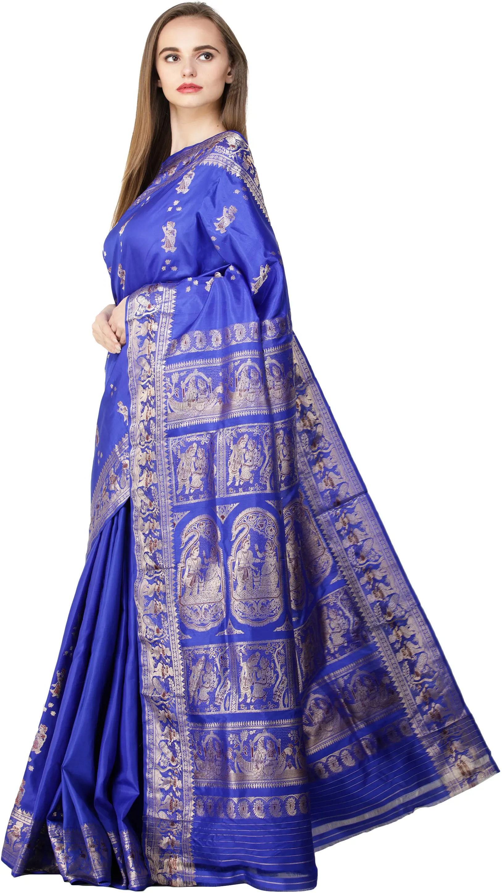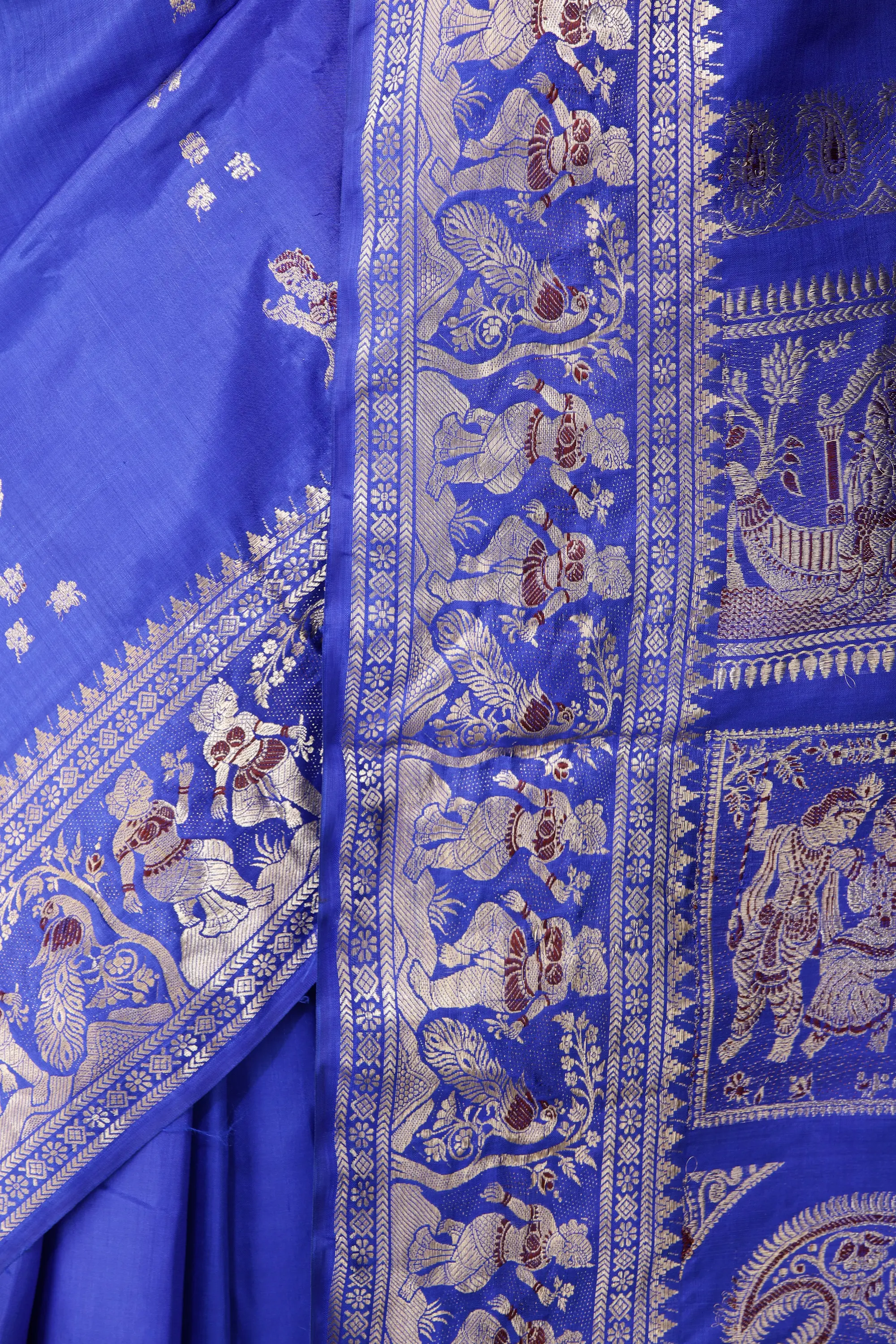 This dazzling-blue Buchari Sari orginated in Bengal and is 100% pure silk. The Hindu mythological motifs on it are intricately zari woven. Silk is a breathable material which is suitable to be worn even during hot weather. The material is soft and luxurious and the motifs are designed densely at the end of the sari so that it displays when the fabric drapes over the shoulder.