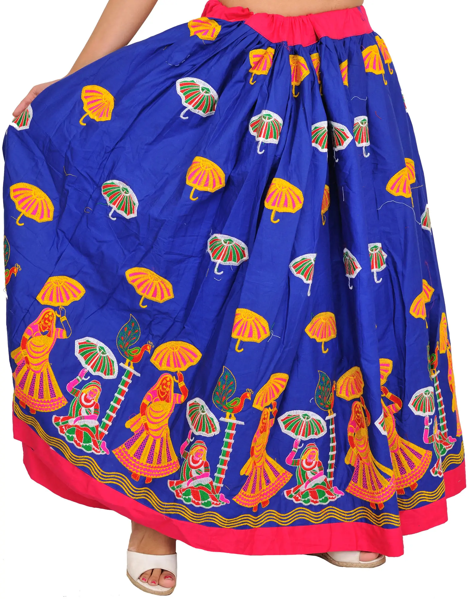 Step into a world of color and charm with this exquisite long skirt. Crafted from pure cotton, this garment offers both breathability and a wonderfully soft feel against your skin, making it a perfect choice for any season. The rich, deep blue hue serves as a captivating canvas for an intricate and lively embroidered design that tells a story of rural traditions and daily life.
