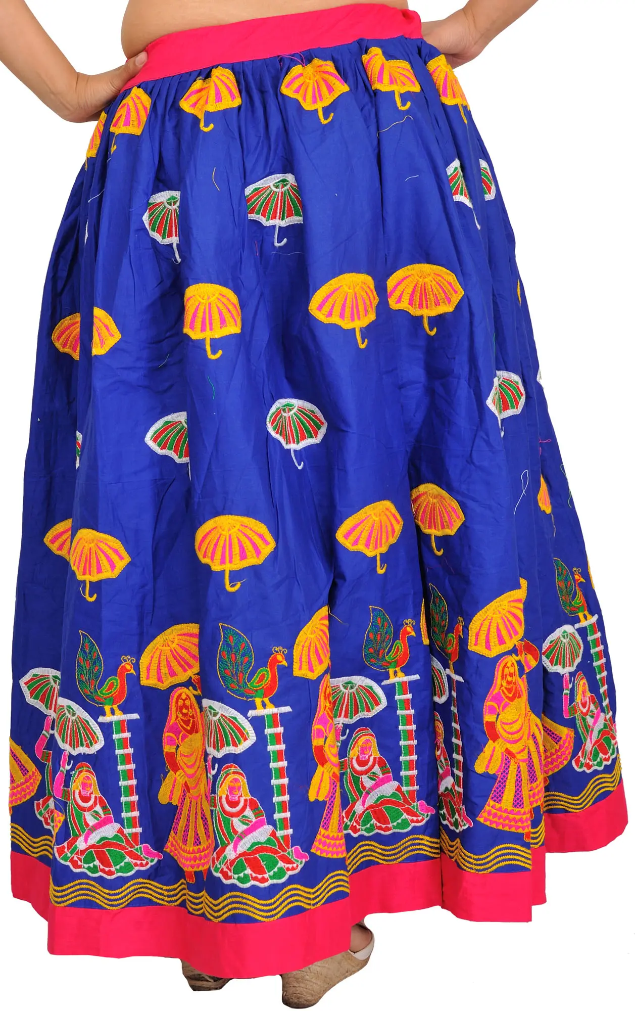 Dazzling-Blue Ghagra Skirt with Embroidered Village Ladies