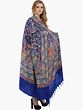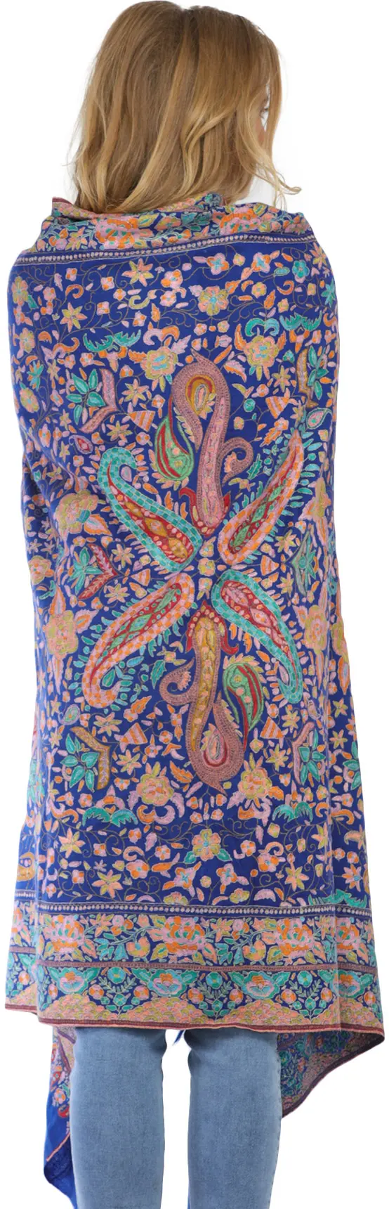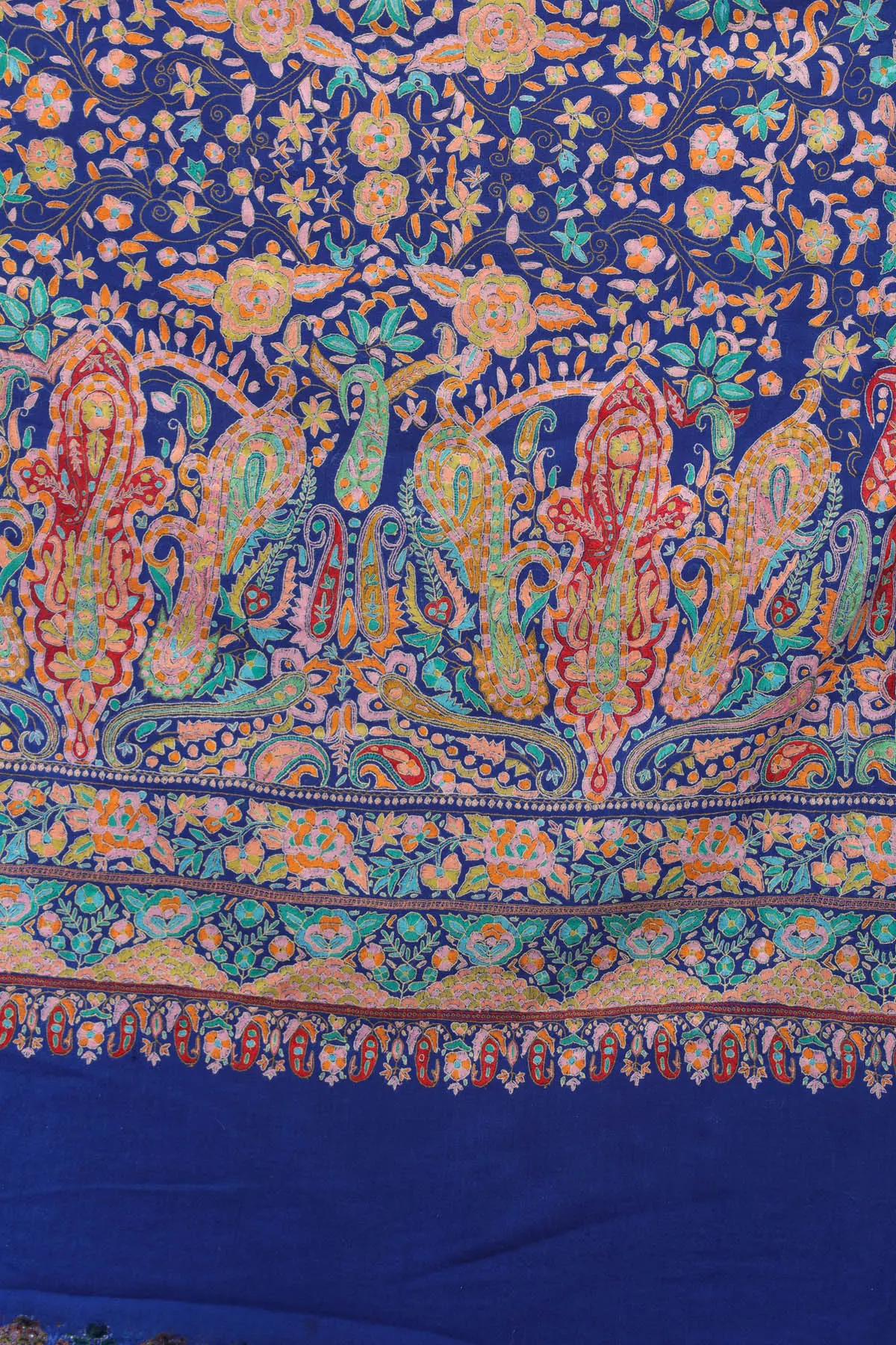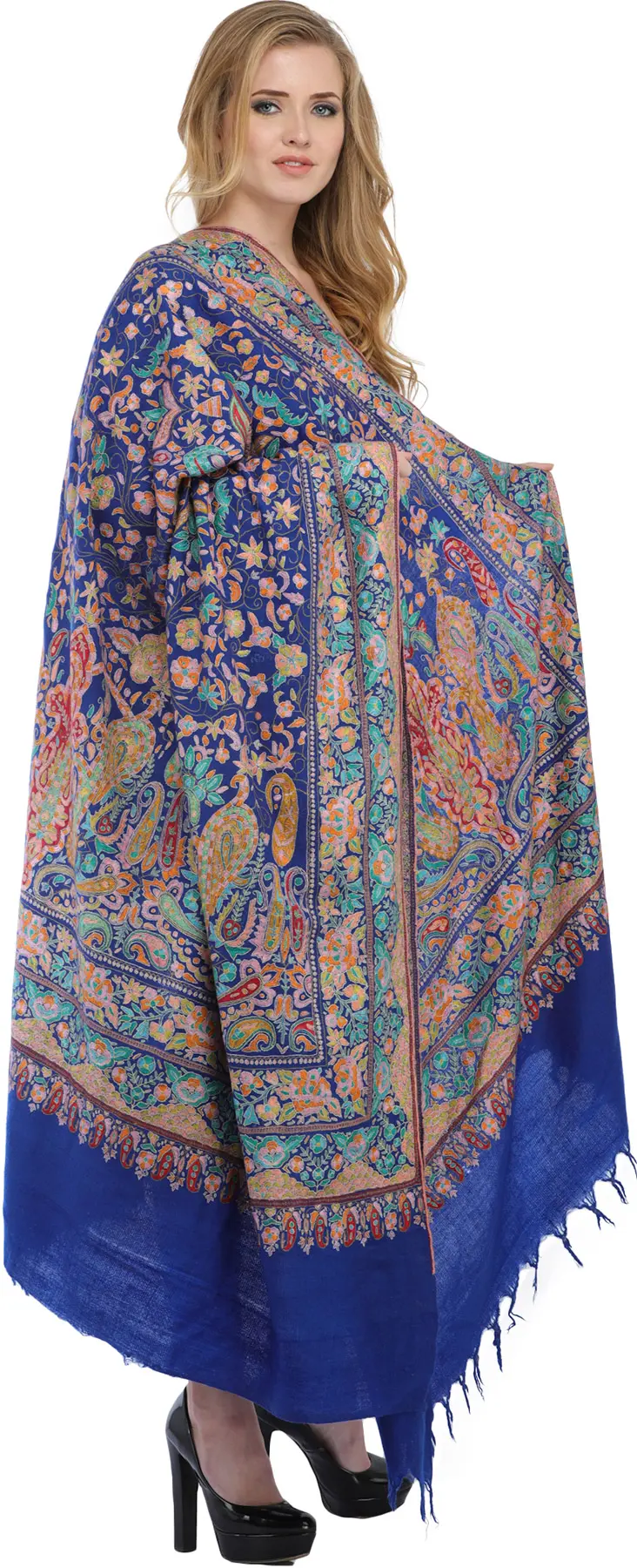 French-Oak Pure Pashmina Shawl with Sozni Hand Embroidered Paisleys-Flowers Jaal from Kashmir
