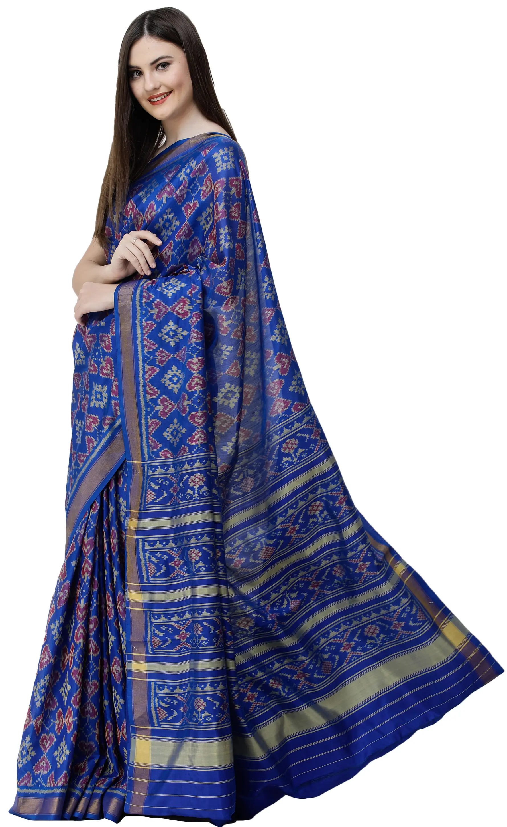 Federal-Blue Ikat Handloom Pure Cotton Saree with Woven Pair of Peacocks and Rudraksha Border from Sambhalpur