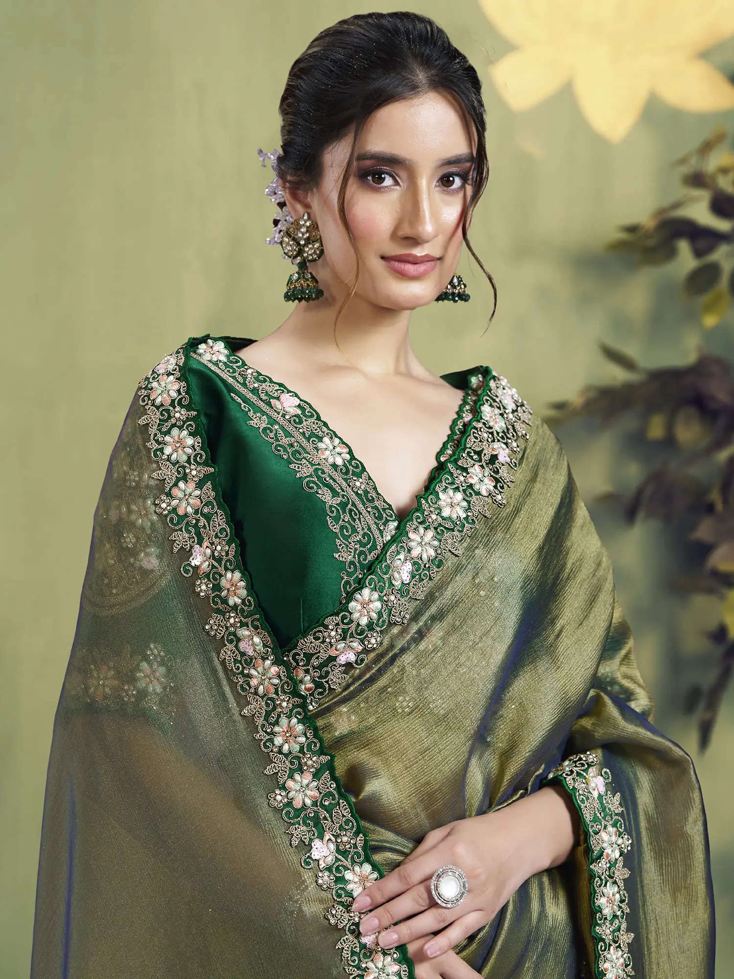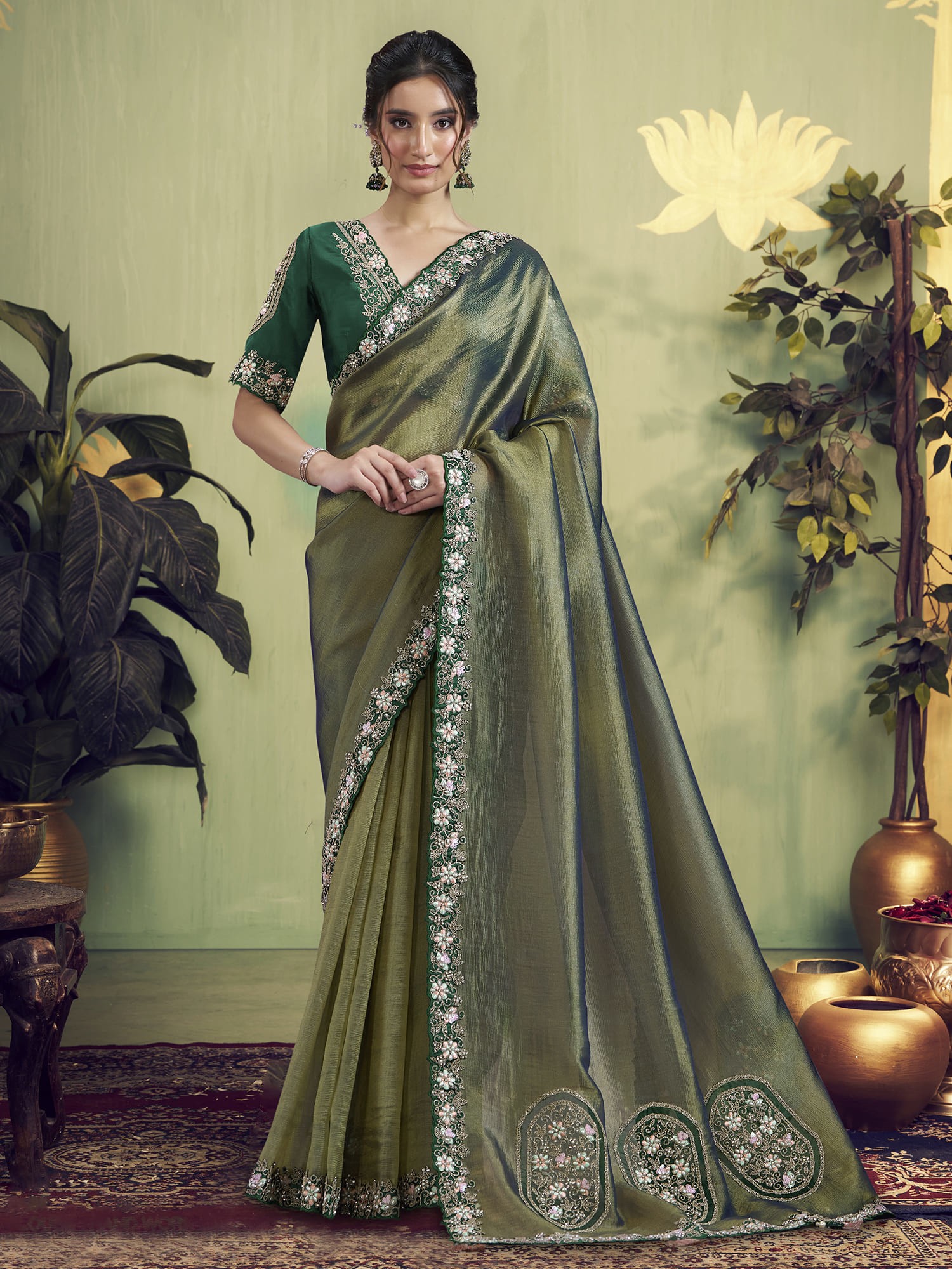 The shimmering texture of the Glass Tissue captivates the eye, offering a mesmerizing interplay of light and shadow with every graceful movement. The border, a masterpiece of delicate embroidery, features floral motifs and subtle sequence work that adds a touch of sophisticated sparkle. This design ensures you'll be adorned with artistry that speaks volumes, a true conversation starter.