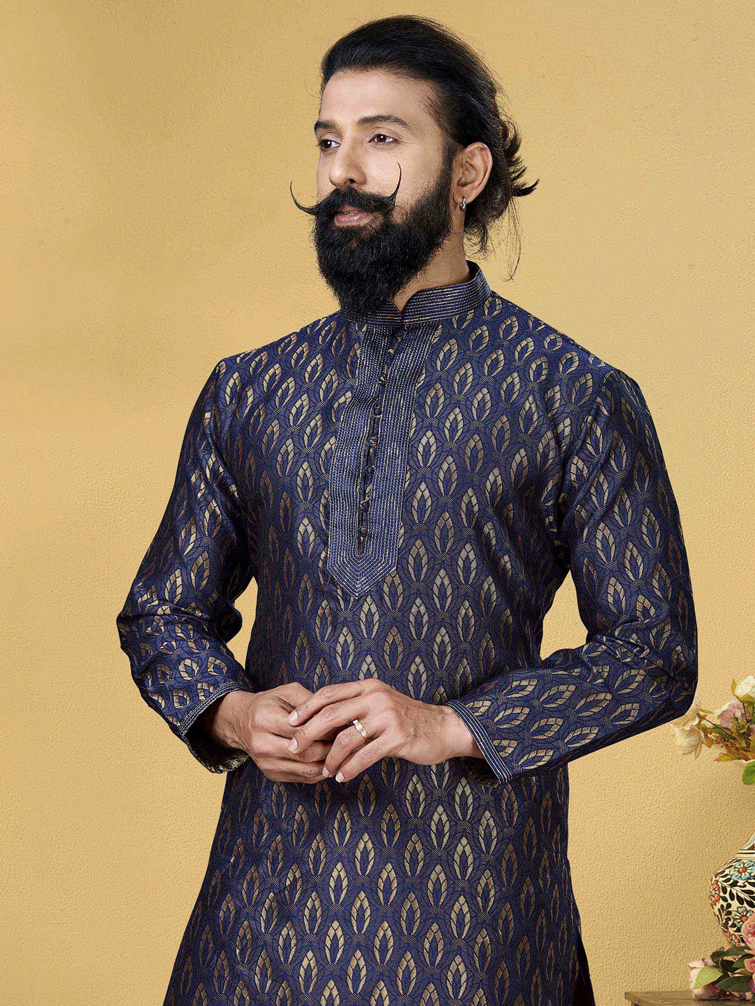 Deep-Ultramarine Brocade Fabric from Banaras with Hand-woven Lotuses and Zari Weave