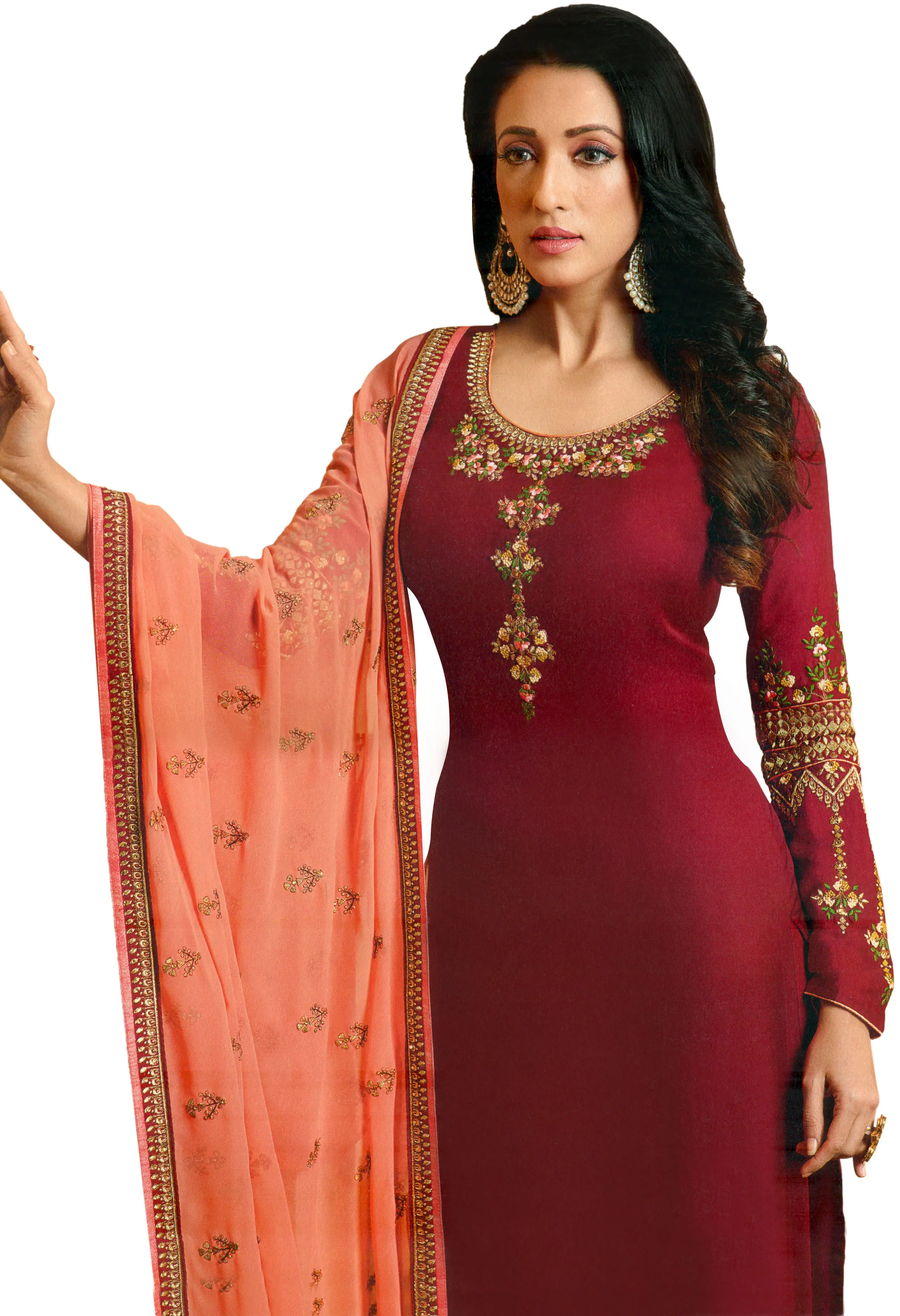 Immerse yourself in the luxurious charm of this deep claret salwar kameez suit, a masterpiece of traditional Indian craftsmanship designed to make you feel exquisite. Crafted from premium silk, the rich, deep claret hue of the kameez offers a sophisticated canvas for the intricate Zari embroidery that adorns its neckline, sleeves, and hem. This detailed Zari work, featuring a symphony of floral motifs and geometric patterns in shimmering gold and complementary thread colors, speaks volumes of its artisanal creation. The long-sleeved kameez is cut to flatter, providing a graceful silhouette that is both contemporary and timeless.