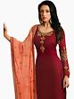 Deep-Claret Long Choodidaar Salwar Kameez Suit with Zari-Embroidery and Peach Chiffon Dupatta