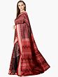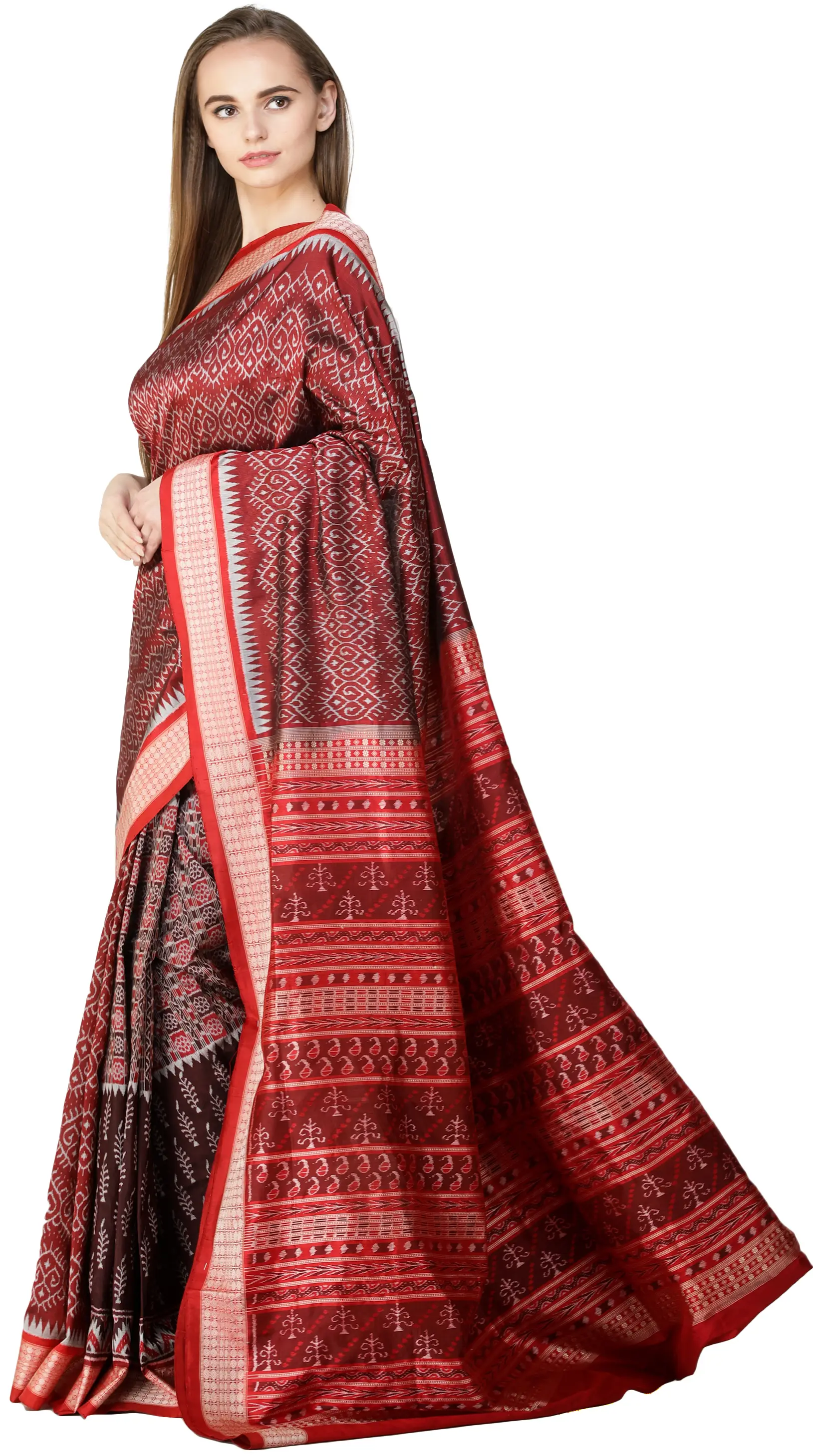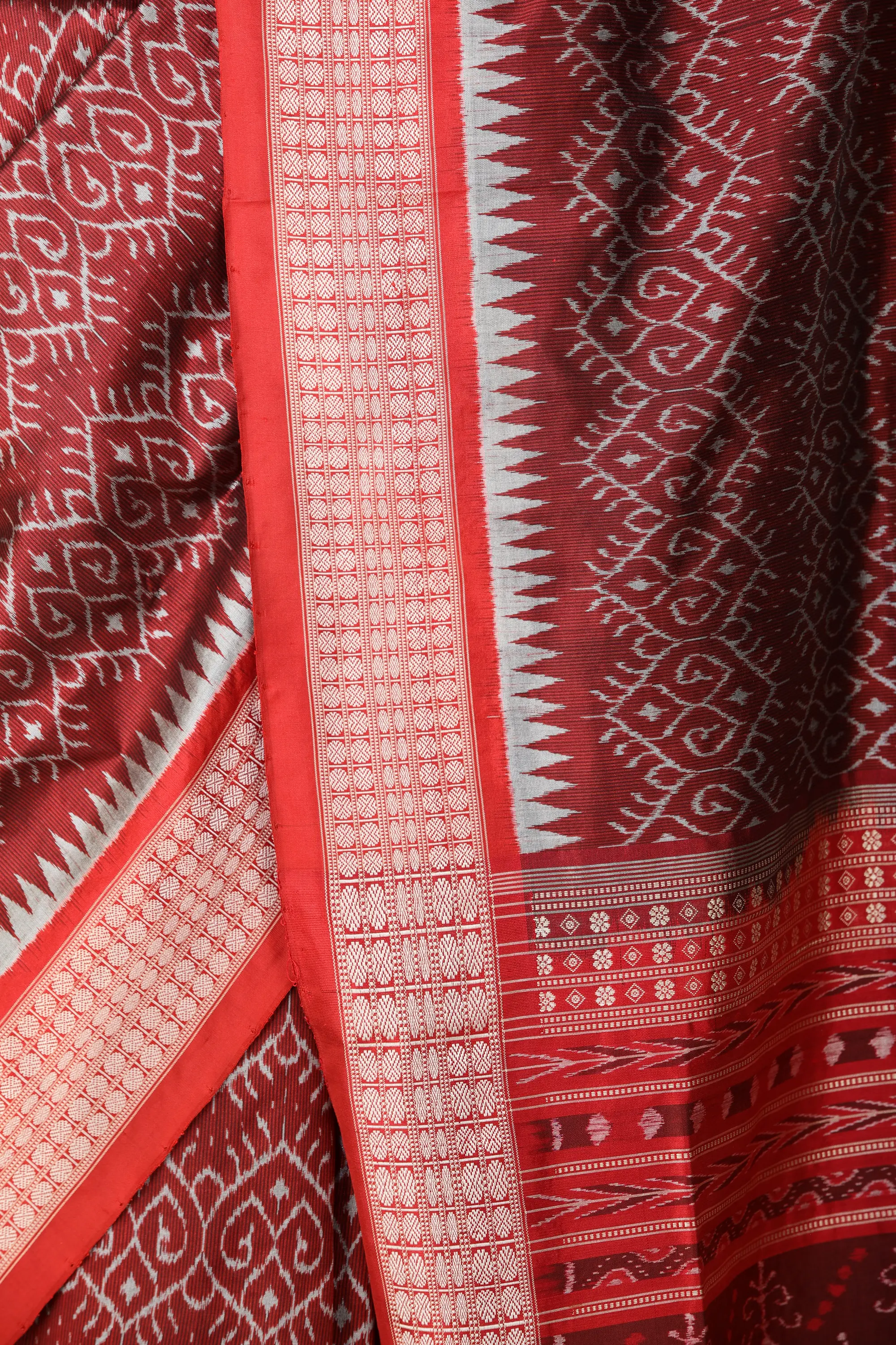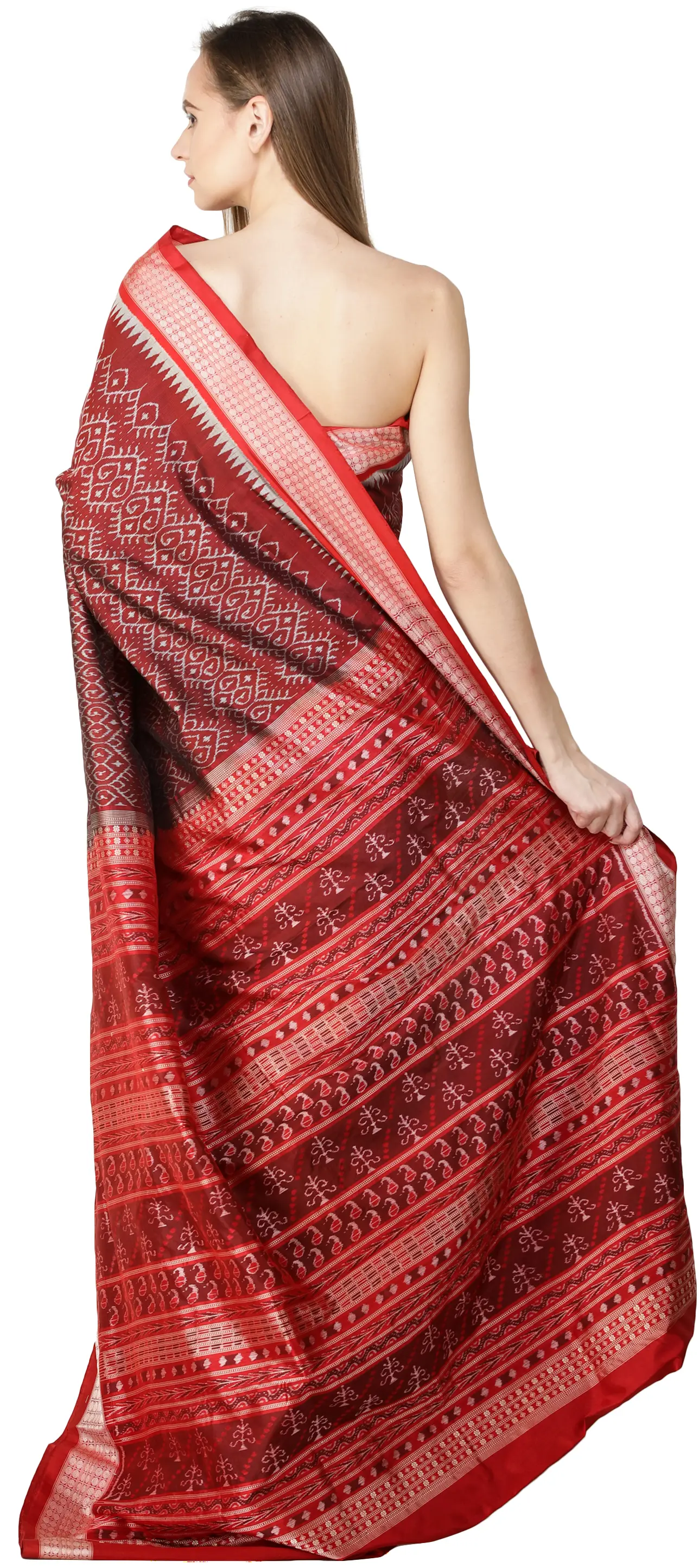 This pure silk handloom saree is more than just an garment; it's a piece of art to be treasured. Its deep claret color makes it suitable for a wide range of occasions, from festive celebrations and weddings to formal gatherings and cultural events. The natural luster of silk combined with the unique Ikat weave ensures that this saree will be a standout piece in any wardrobe. The accompanying blouse fabric, tailormade to your size, ensures a perfect fit and completes the ensemble, allowing you to showcase this masterpiece with confidence and grace. Embrace the allure of traditional Indian craftsmanship and add this magnificent Sambhalpuri Ikat silk saree to your collection.