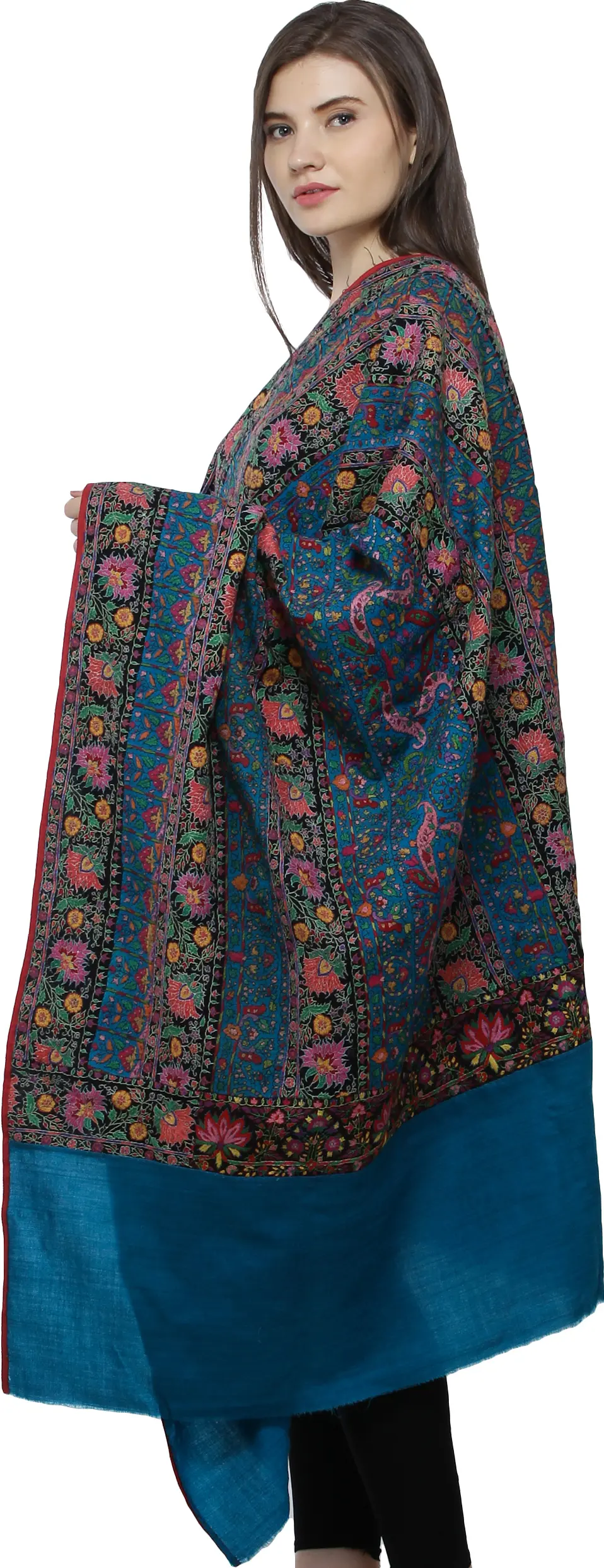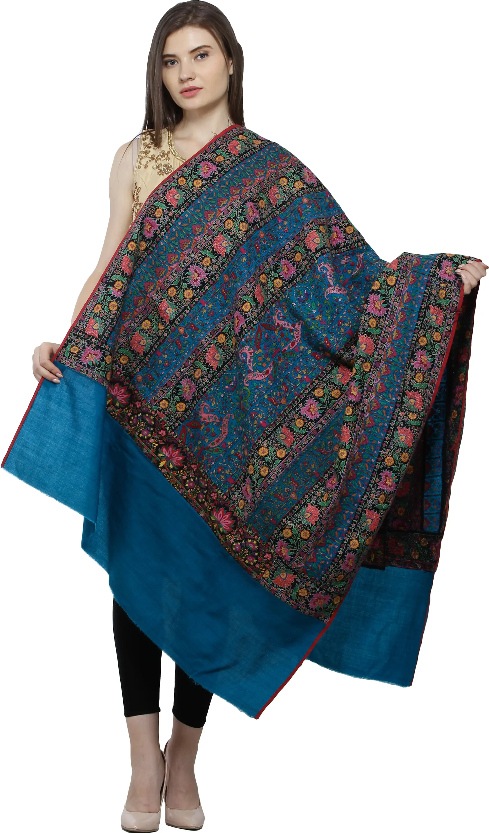 Midnight-Blue Pure Hand-woven Pashmina Shawl from Kashmir with Sozni Embroidery