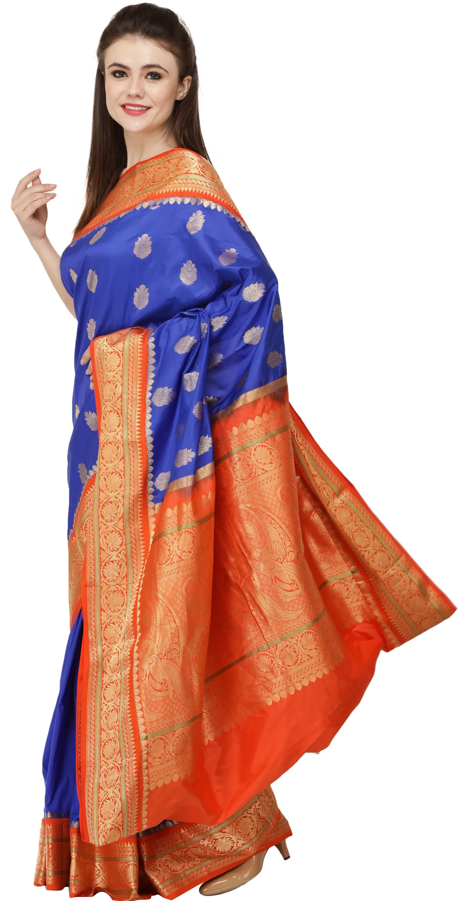 This sari is an ode to classic Indian aesthetics, yet possesses a contemporary charm that will appeal to the modern woman. It's an ideal choice for weddings, festivals, formal events, or any occasion where you wish to make a sophisticated and memorable statement. Drape it elegantly to showcase its stunning pallu, or allow the intricate border to frame your silhouette with grace. The deep ultramarine and vibrant orange combination is both bold and beautiful, ensuring you stand out in any gathering. This sari is an investment in timeless style and enduring quality, a piece that will be cherished for years to come.