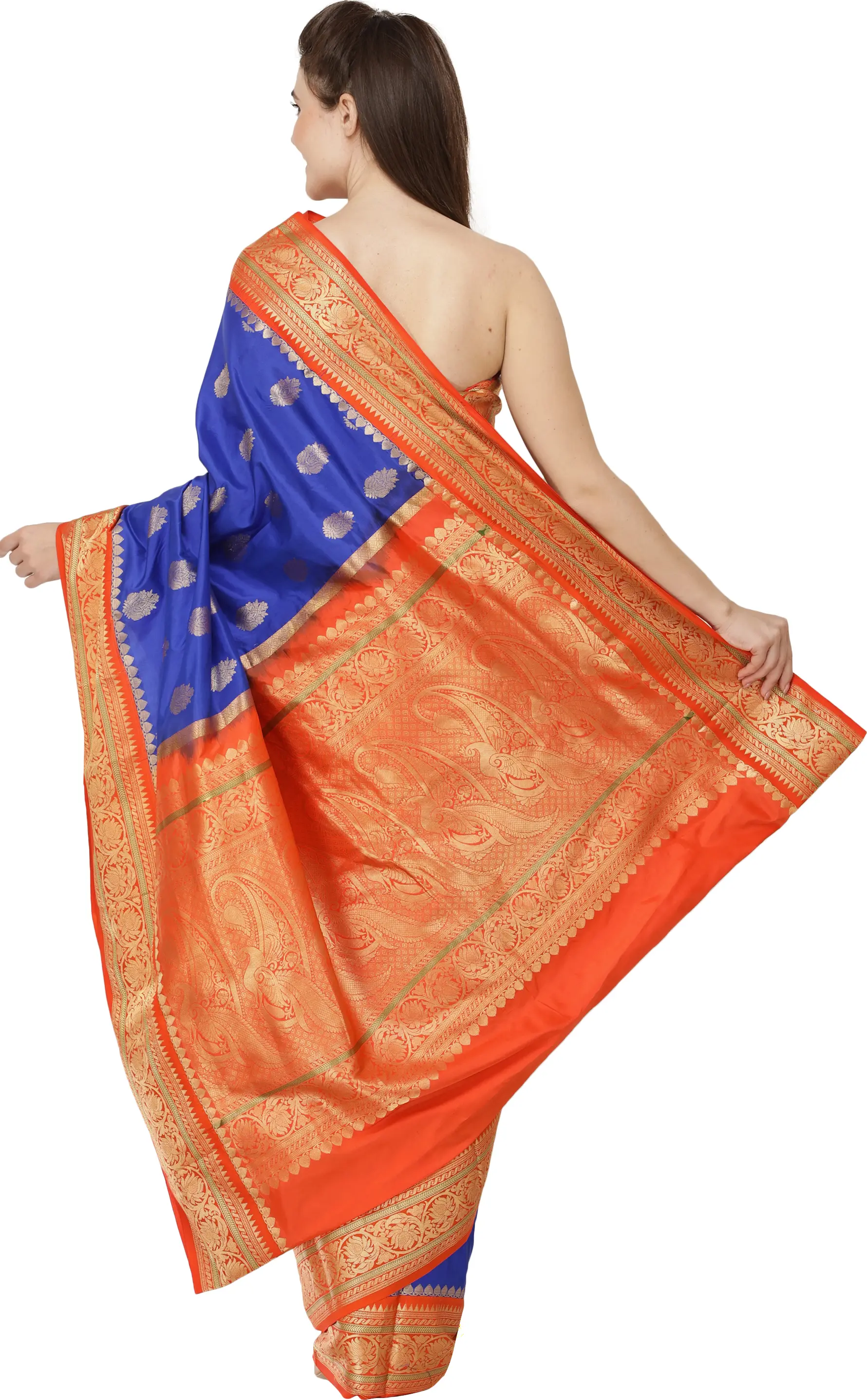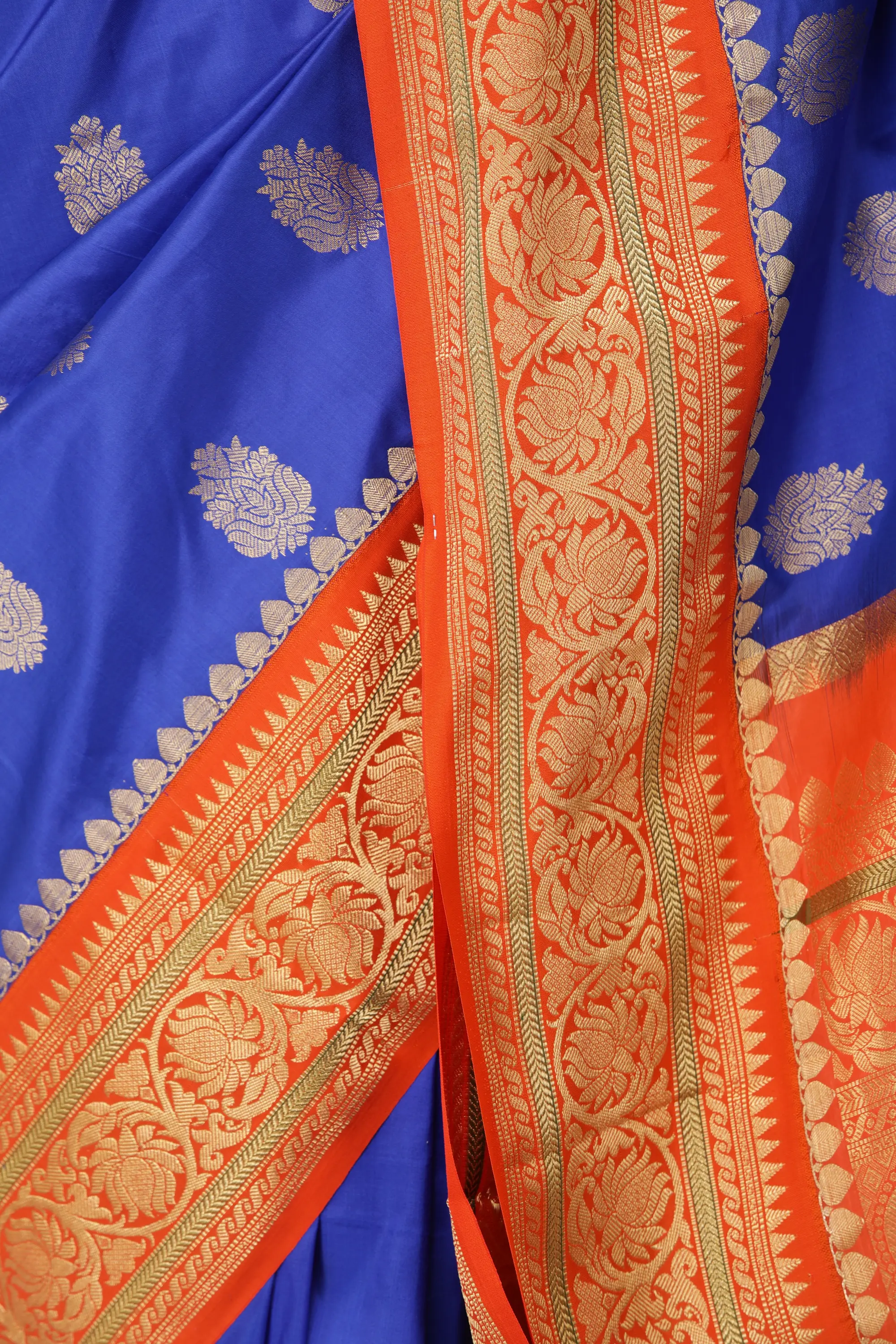 The body of the sari is elegantly scattered with delicate Zari-woven buttas, resembling stylized leaves or paisley shapes, adding a subtle shimmer and depth to the rich blue. The real grandeur, however, lies in the borders and pallu. A striking orange border, intricately woven with Zari, frames the sari, featuring a breathtaking display of lotus flowers and majestic peacocks. These motifs are rendered with meticulous detail in shimmering Zari threads, creating a visual spectacle that is both opulent and timeless. The contrast between the deep ultramarine and the vibrant orange creates a visually arresting appeal, making this sari a true showstopper.