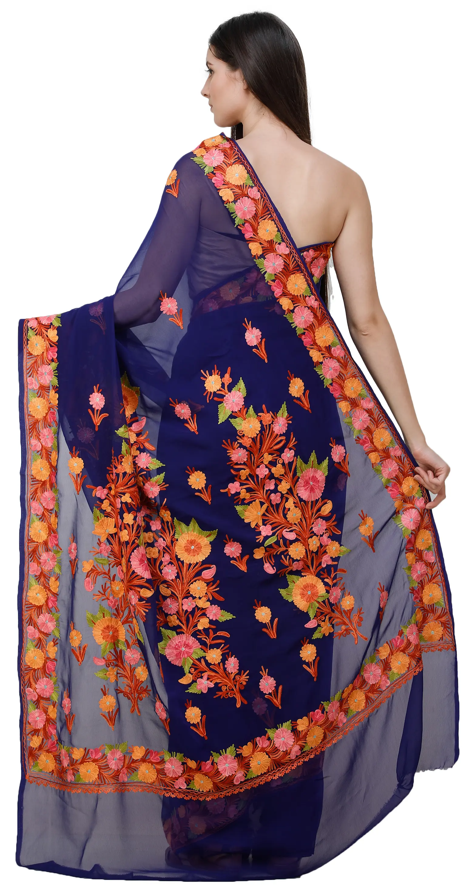 Immerse yourself in the rich tapestry of Kashmiri craftsmanship with this exquisite georgette sari. The deep ultramarine hue of the fabric provides a dramatic canvas for the vibrant Aari embroidery, a technique that has been perfected over centuries in the valleys of Kashmir. Each stitch is a testament to the artisan's skill, creating a breathtaking floral motif that dances across the entire length of the sari.