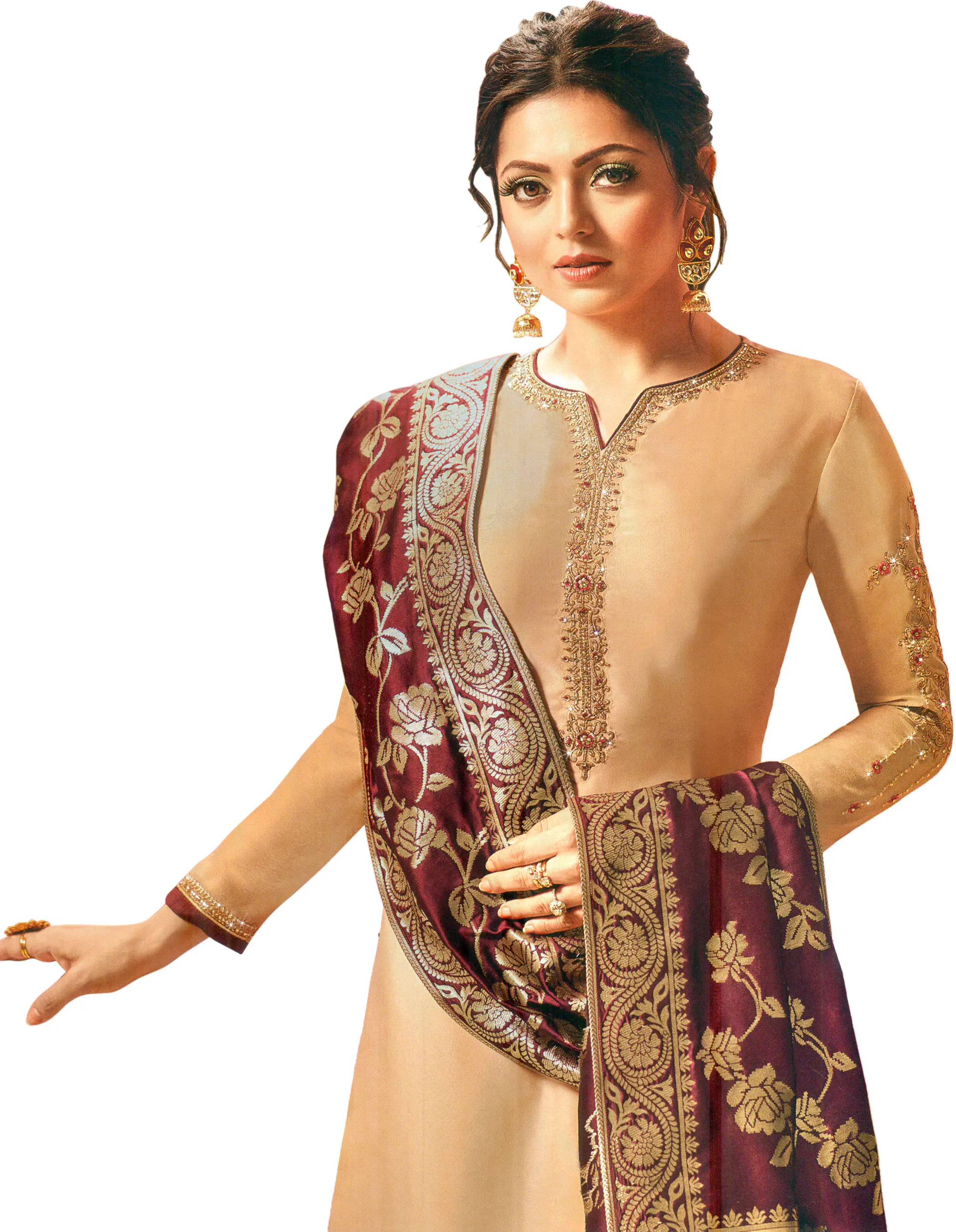 Step into a realm of refined grace with this exquisite choodidaar salwar suit, a masterpiece crafted from luxurious art silk. The desert-dust hue of the fabric provides a sophisticated and versatile canvas, exuding an understated elegance that is perfect for a multitude of occasions. This ensemble is designed for the modern woman who appreciates the fusion of traditional craftsmanship with contemporary style.