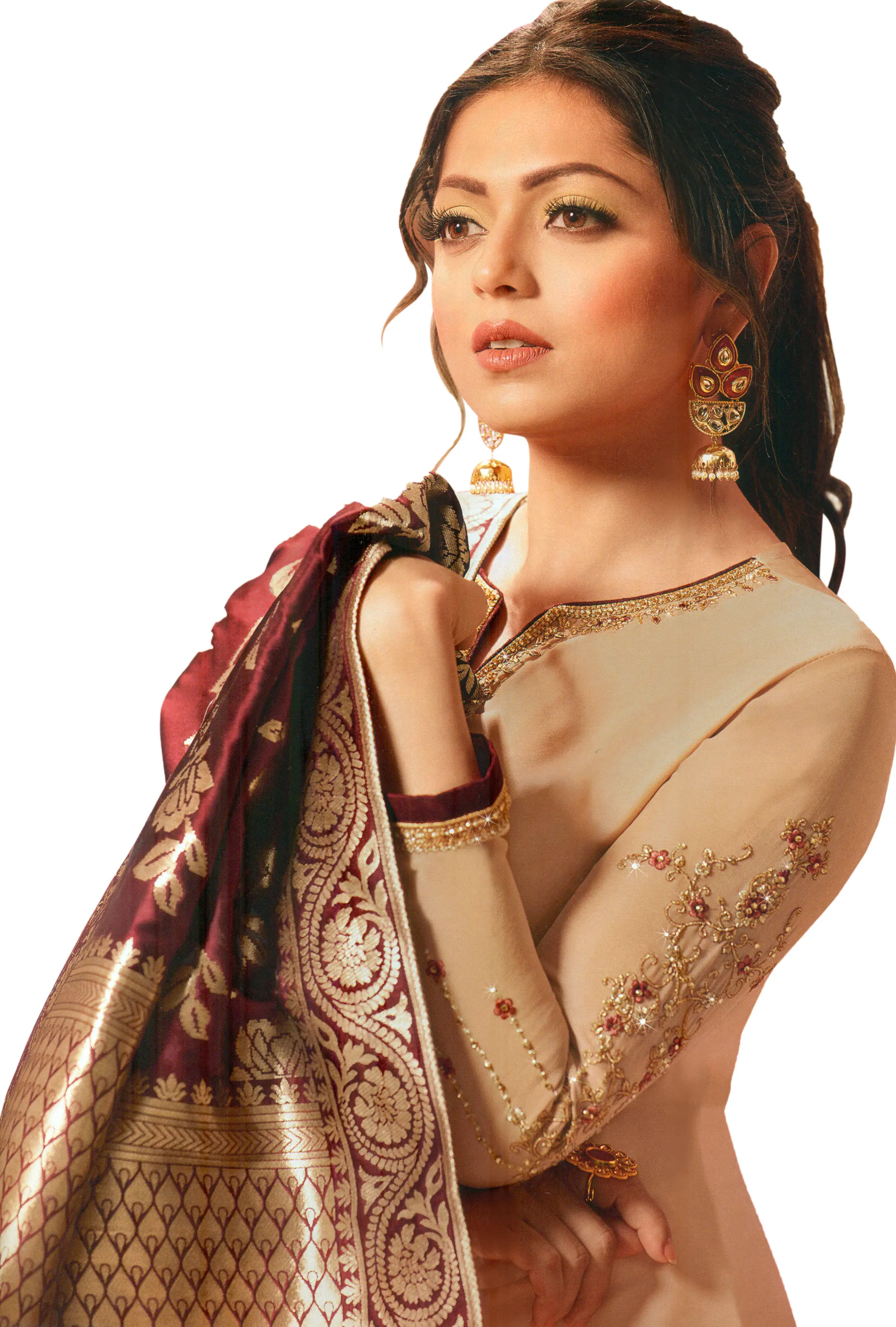 Complementing the understated beauty of the kameez is a breathtaking Banarasi dupatta. Crafted from rich silk, this traditional Indian textile is renowned for its intricate weaving and opulent designs. The dupatta features a deep, alluring maroon shade, beautifully contrasting with the desert-dust suit. It is richly embellished with a classic floral motif woven in golden zari, creating a stunning visual tapestry. The borders of the dupatta are a work of art in themselves, featuring ornate zari woven patterns that are characteristic of Banarasi craftsmanship, framing the floral design with regal splendor. The generous length of the dupatta allows for versatile styling, draping gracefully to complete the ensemble. This salwar suit is more than just clothing; it's an expression of heritage and artistry. The art silk fabric drapes beautifully, offering both comfort and a refined silhouette. The subtle embroidery on the kameez adds just the right amount of sparkle without being overwhelming, making it ideal for festive gatherings, weddings, or elegant evening affairs. Paired with the dramatic Banarasi dupatta, this outfit promises to turn heads and make a lasting impression. Elevate your ethnic wear collection with this timeless piece that embodies sophistication and tradition.