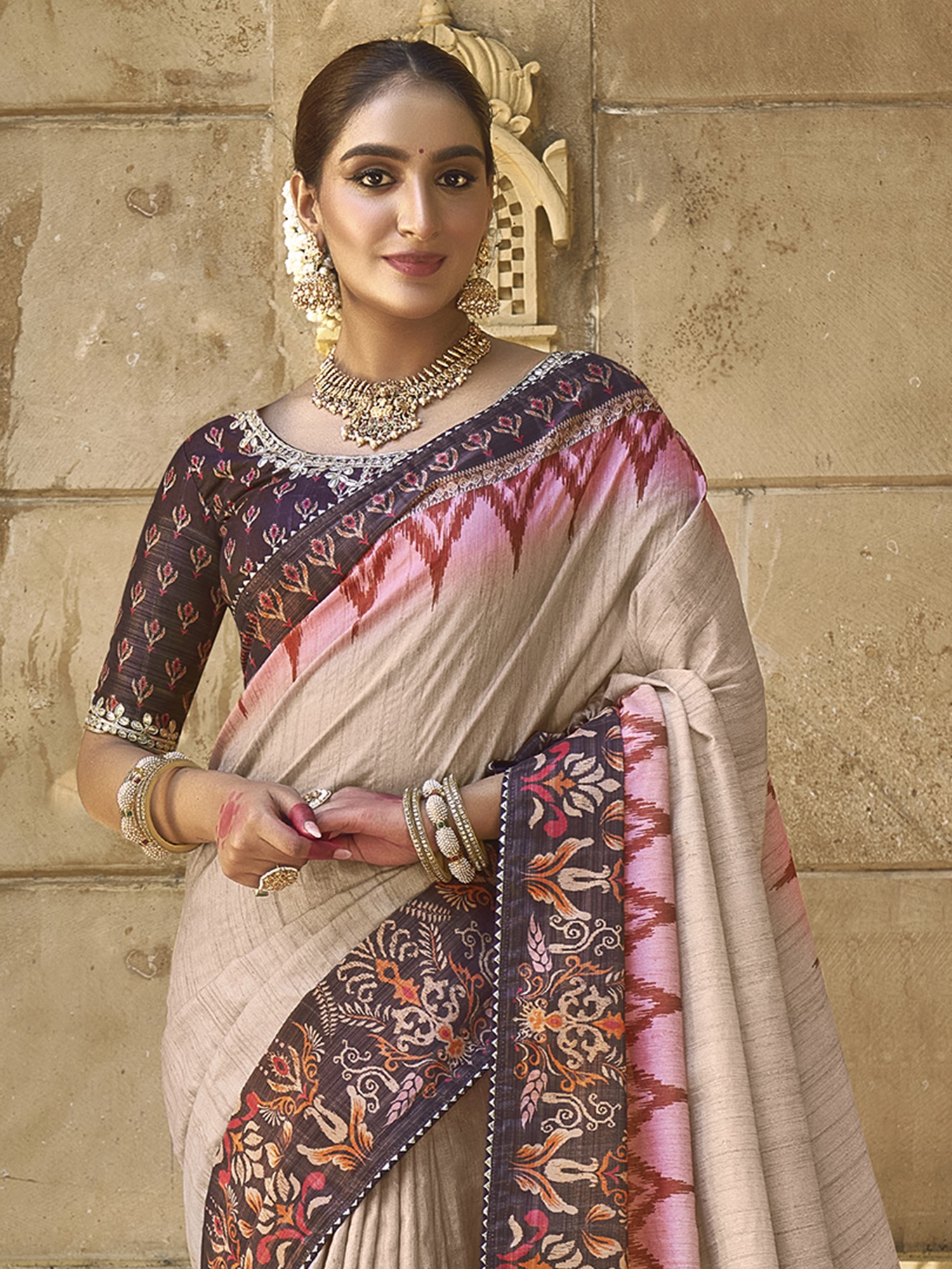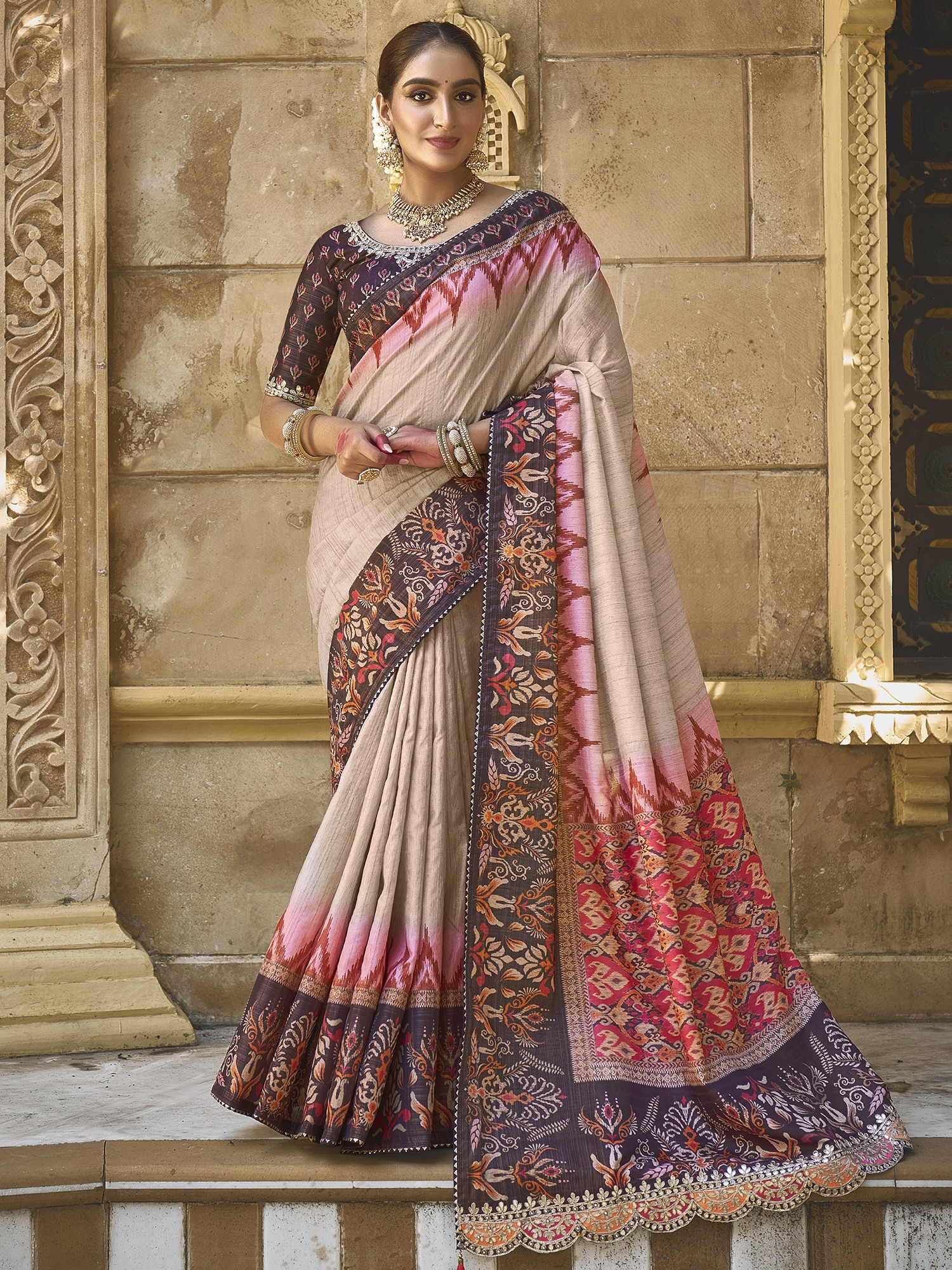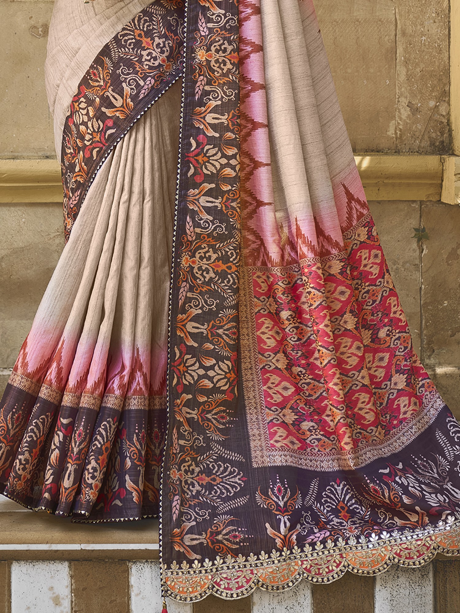 Desert-Sand Silk Pure Gota Work Saree Flower And Leaf Border With Blouse & Tassels Pallu