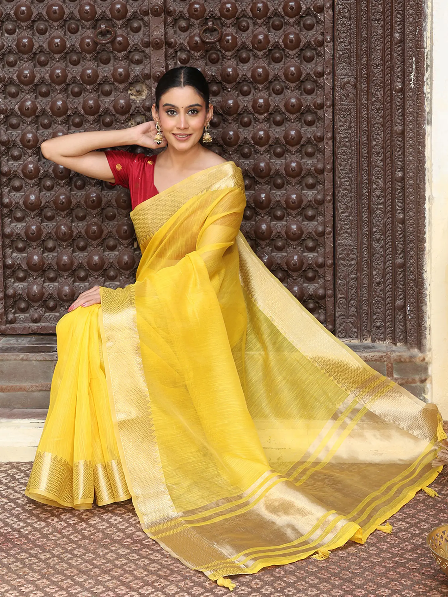 Adorned with intricate traditional motifs on the border and pallu.