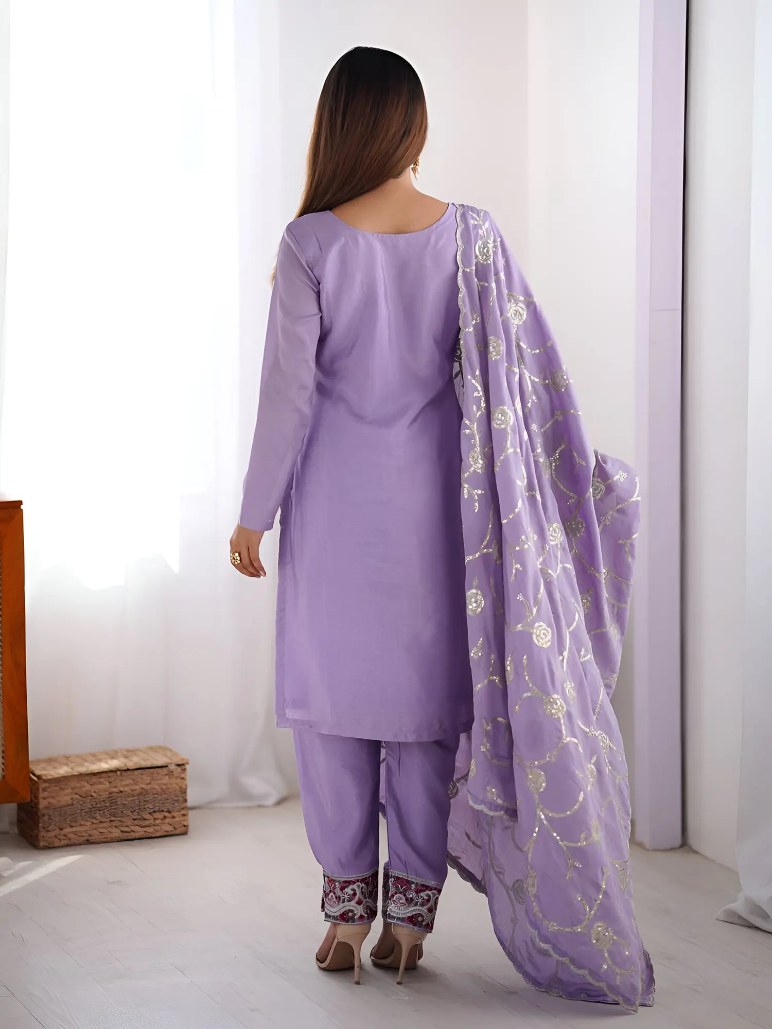 Viscose Chanderi Embroidery And Sequins Work Straight Kurta Set With Matching Dupatta