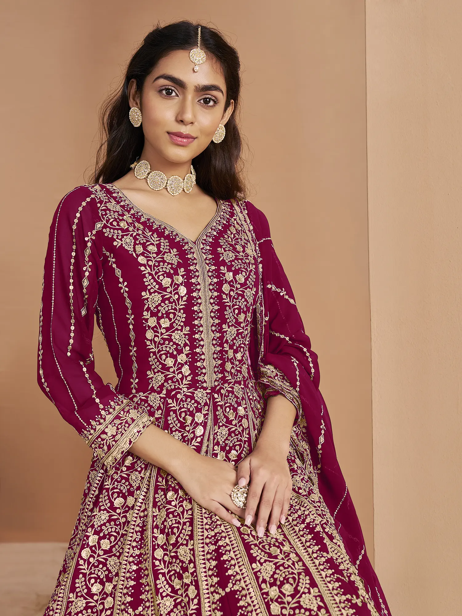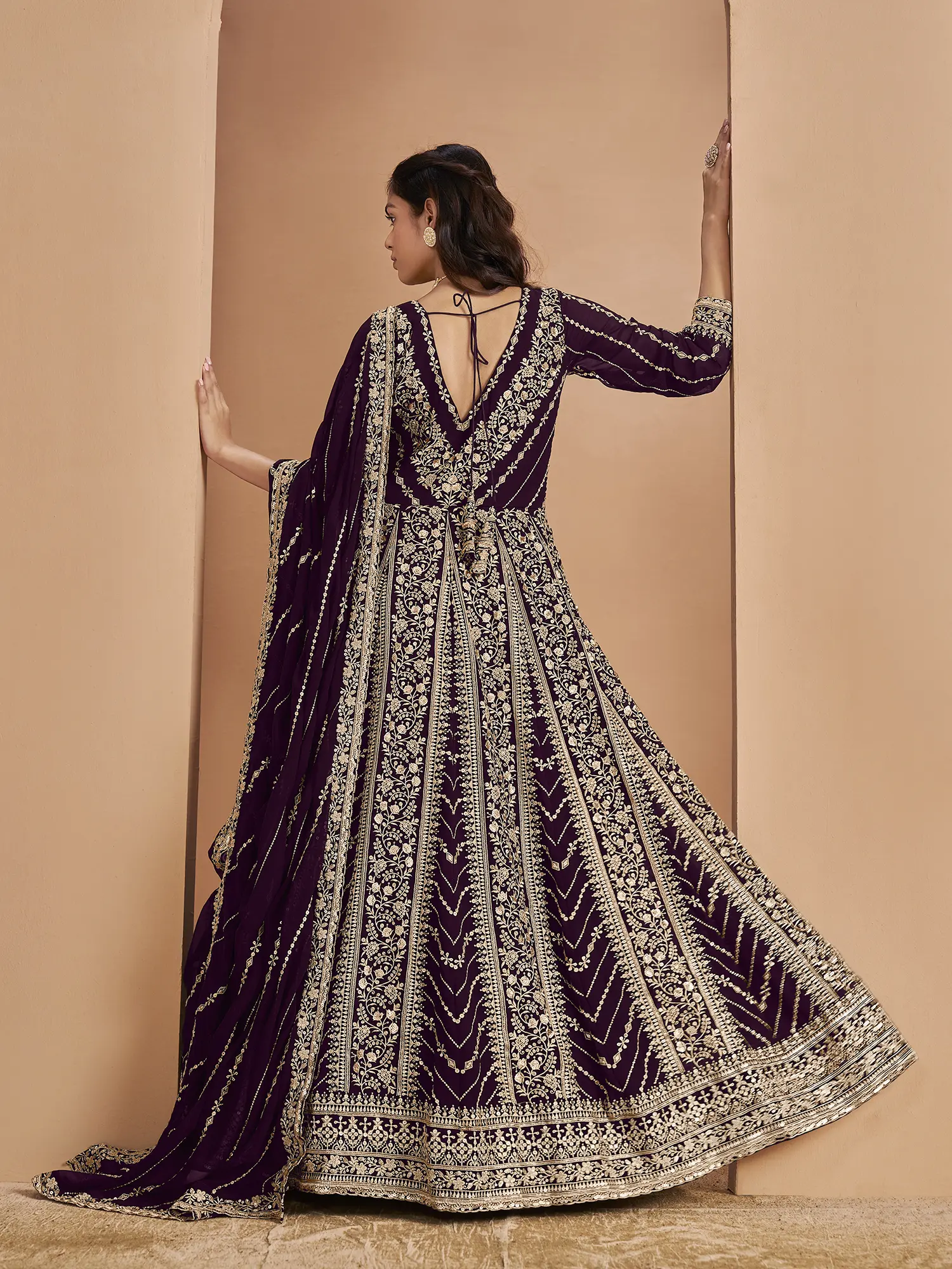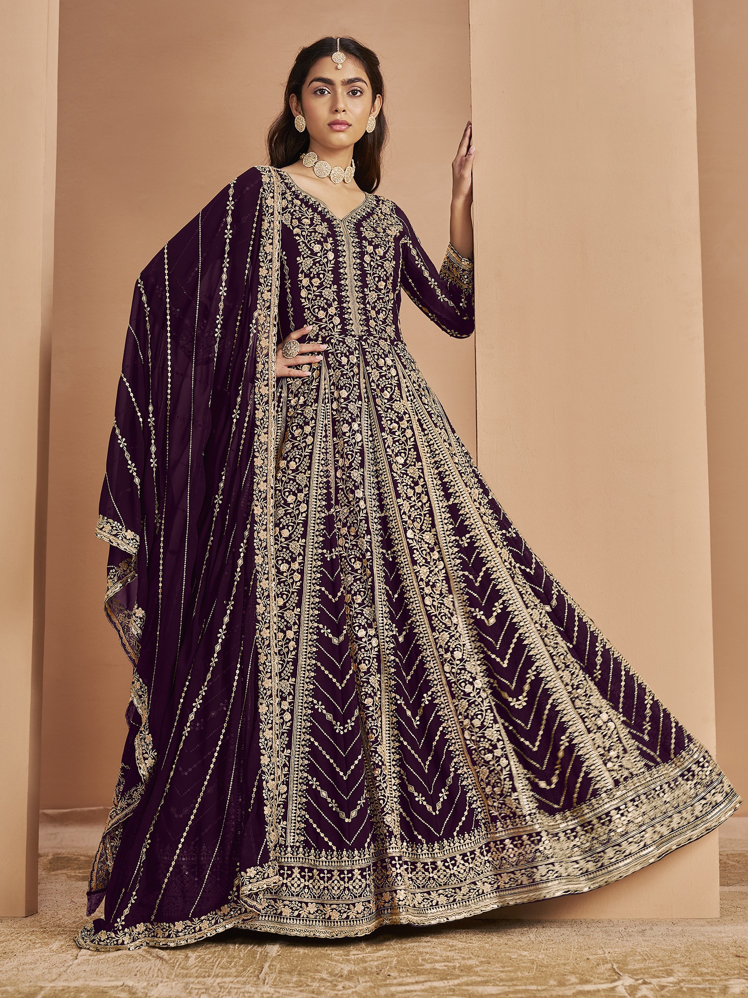 Step into a realm of unparalleled sophistication with this exquisite ensemble, designed to make you the radiant center of attention at any festive occasion. Crafted from luxurious Faux Georgette, this gown drapes beautifully, offering both comfort and a flattering silhouette. The deep, rich hue of the fabric serves as a perfect canvas for the intricate and extensive embroidery that adorns every inch of the garment.