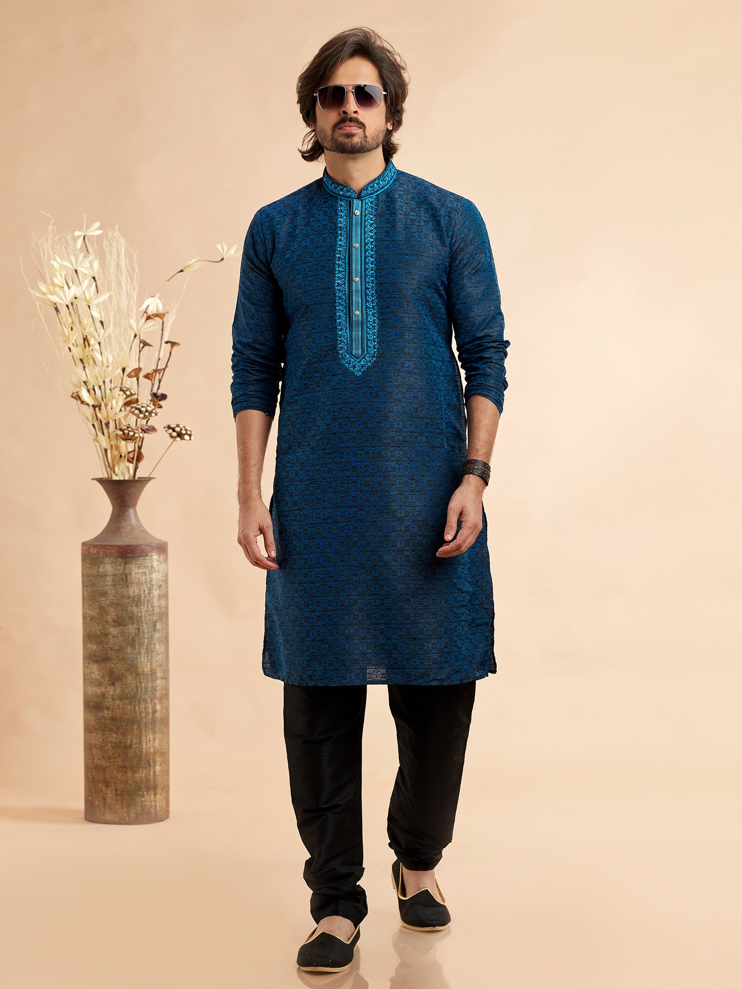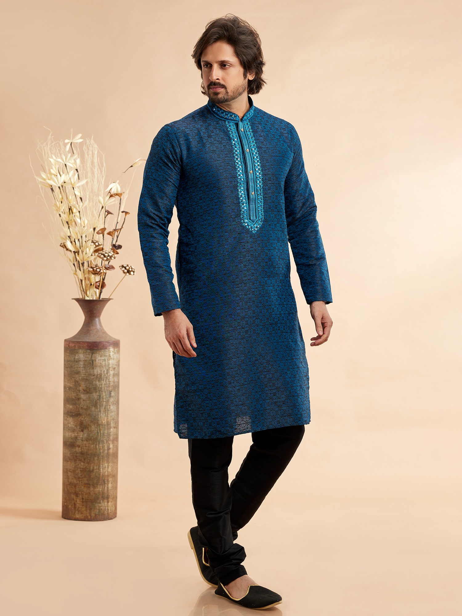 Designer Jacquard Art Silk Men's Kurta Pajama Set With Dupion Silk Bottom Featuring Mirror And Machine Work For Party And Wedding