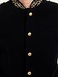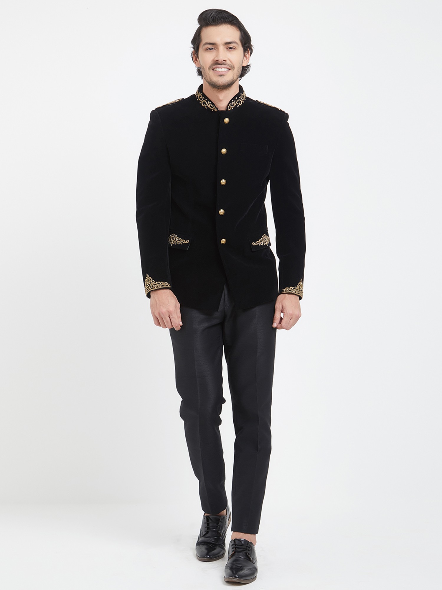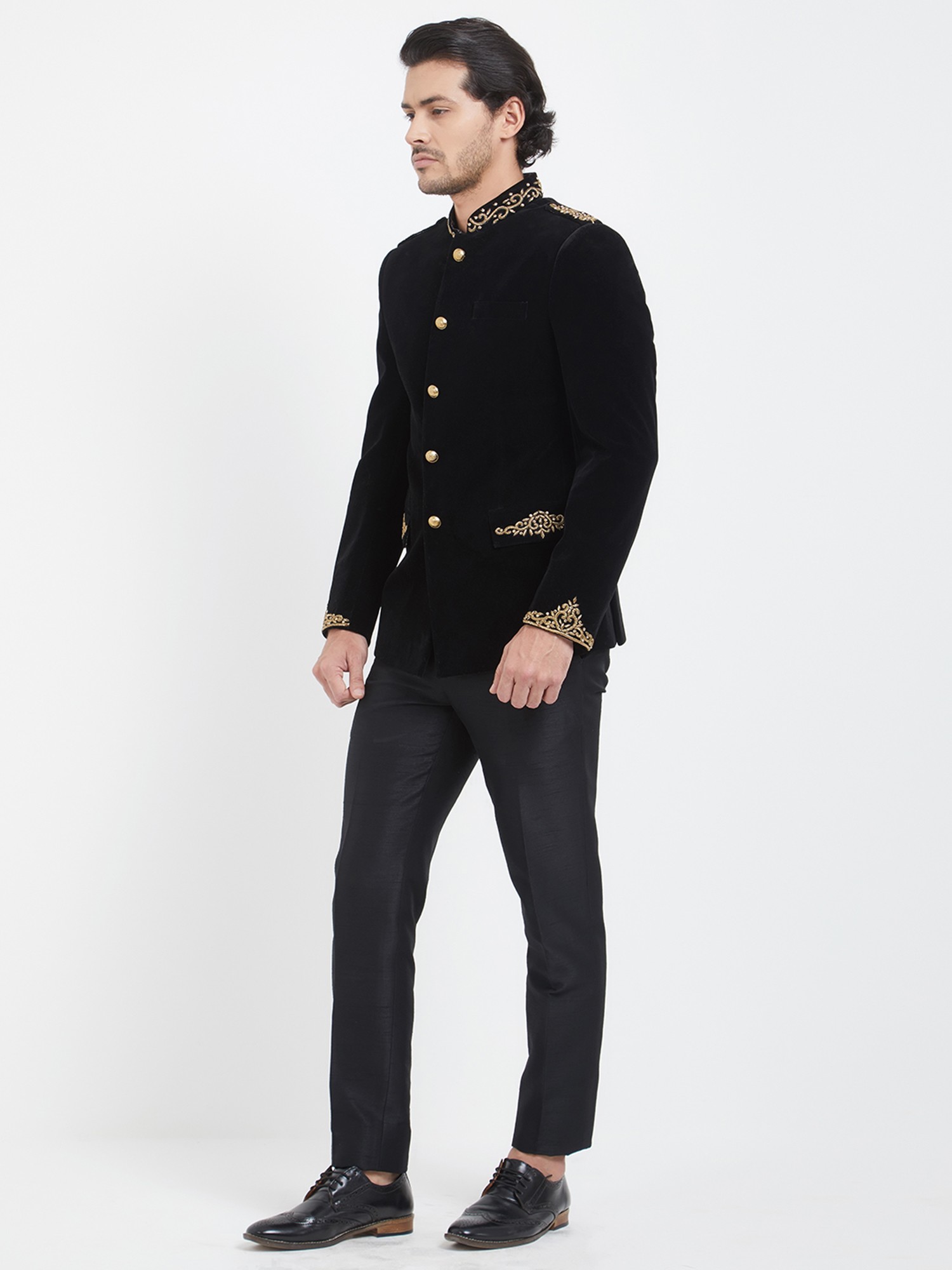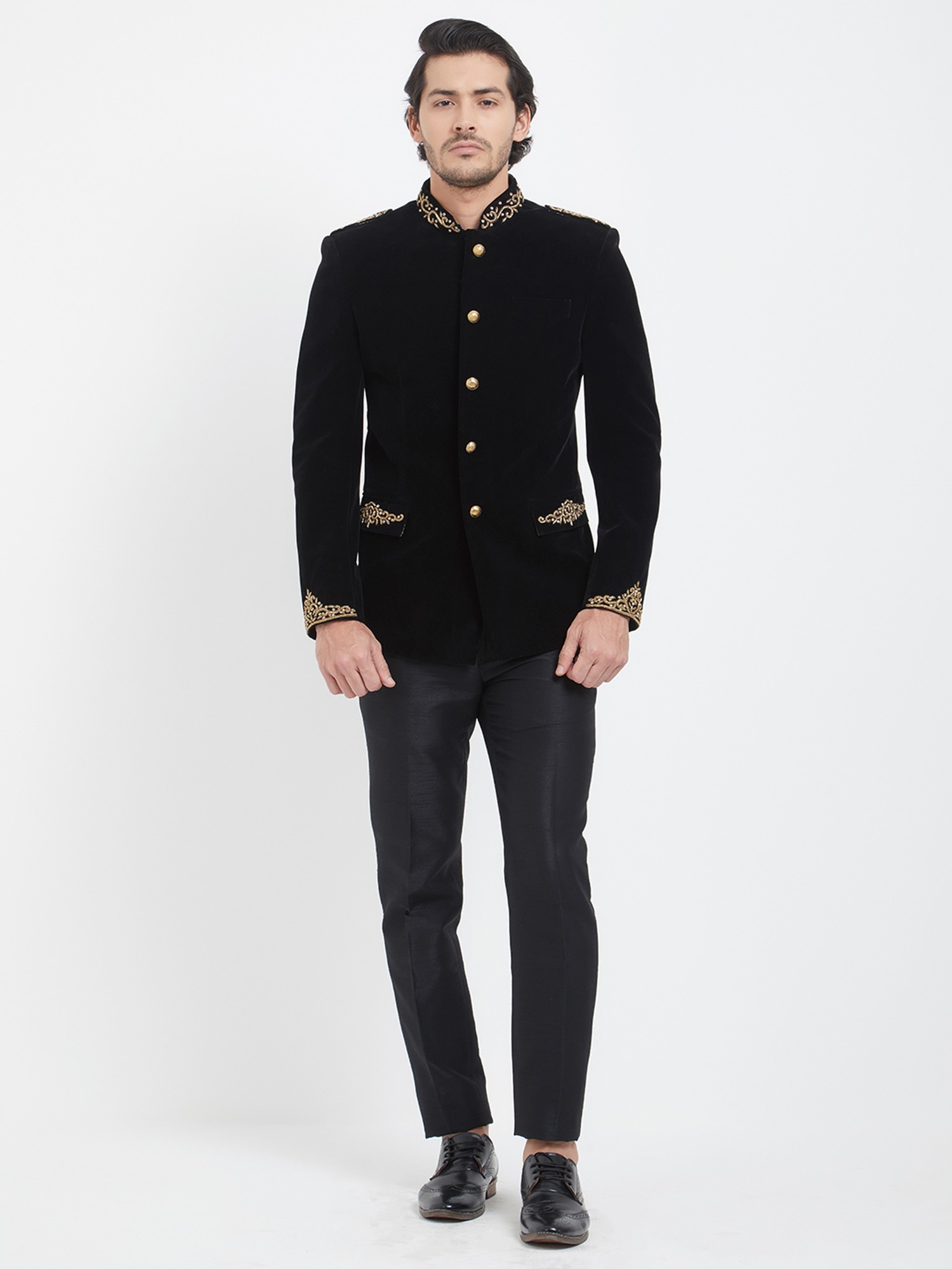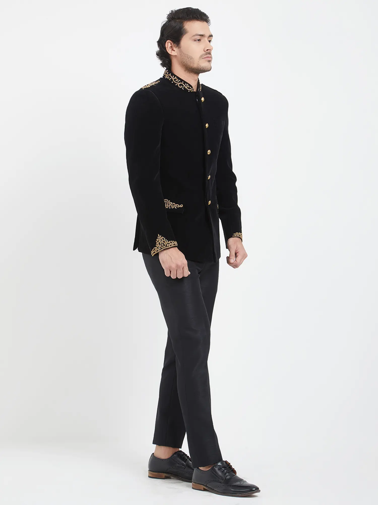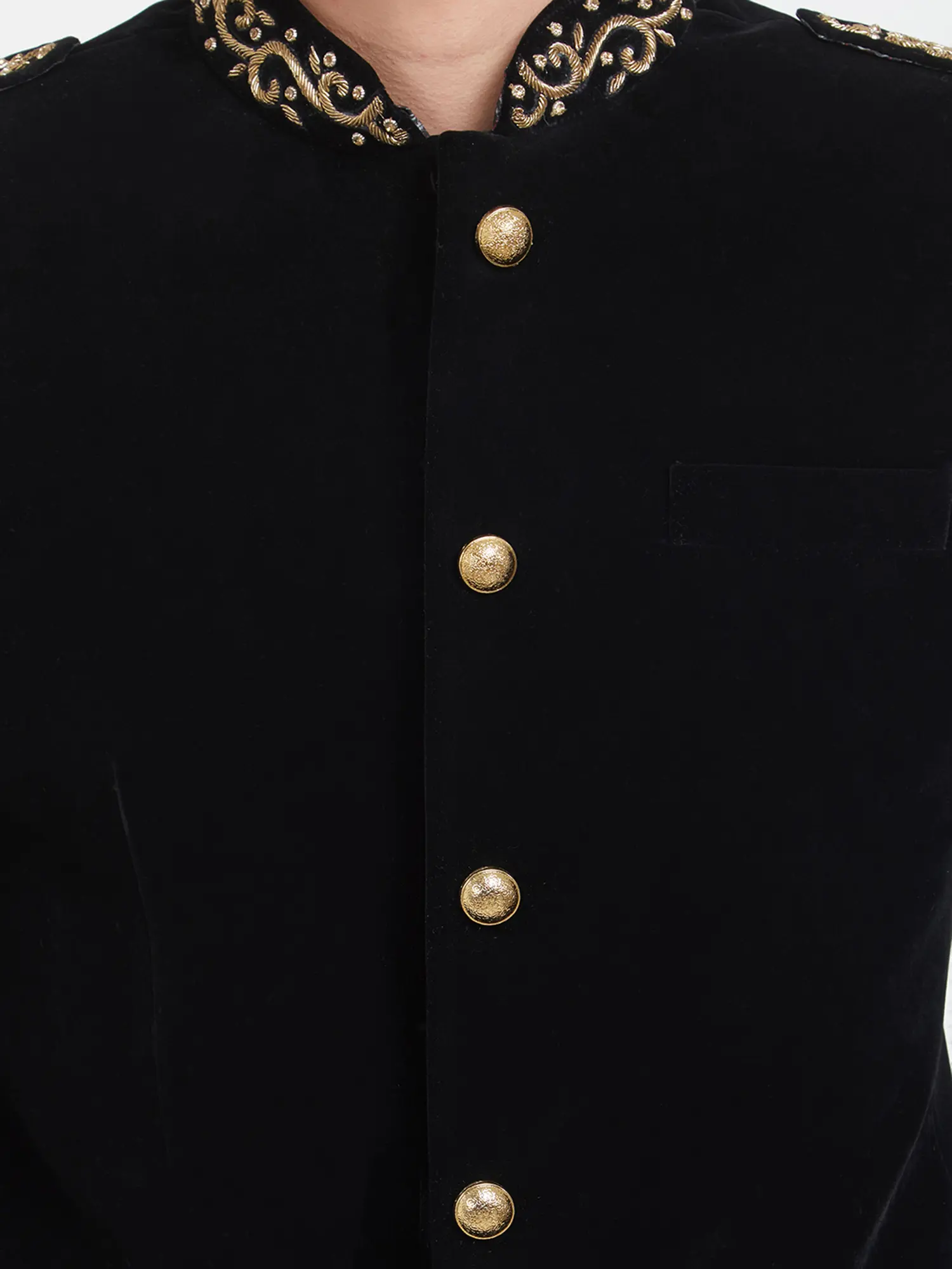 Adorned with a captivating display of hand-embroidered motifs, the collar and cuffs become canvases of artistry. The subtle gleam of the meticulously placed gold buttons adds a touch of regal splendor, perfectly complementing the deep, rich hue of the velvet. This thoughtful detailing ensures a striking visual appeal that is both understated and undeniably impactful.