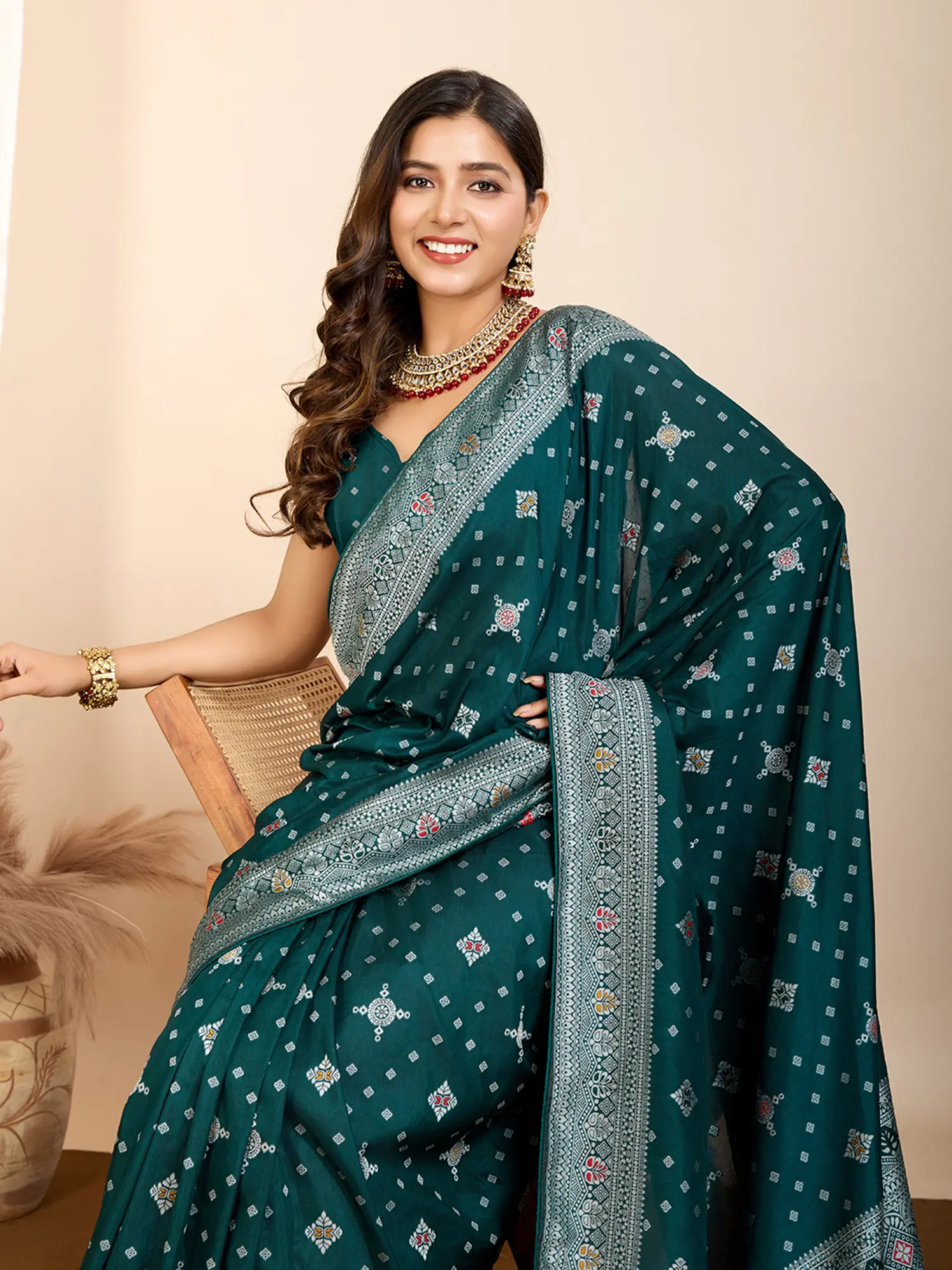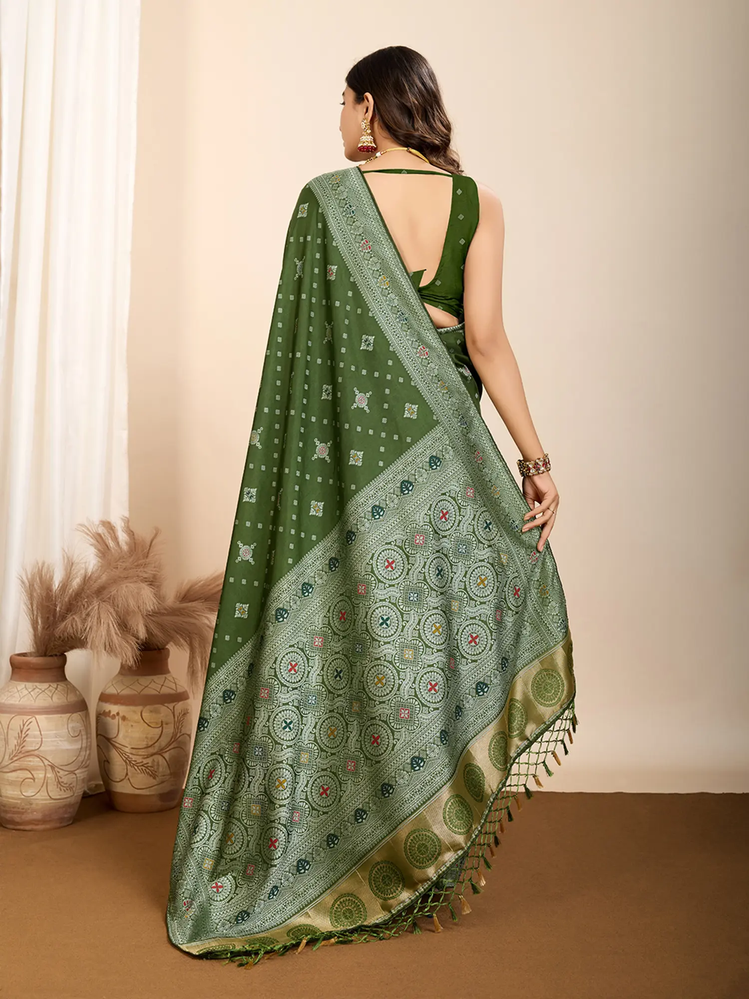 The saree features a captivating all-over woven pattern, a testament to skilled artisans. Small, diamond-shaped motifs are scattered across the main body, interspersed with larger, more elaborate circular designs that feature geometric patterns and subtle pops of color. These intricate details are framed by a broad border, embellished with a sophisticated Bandhani-inspired pattern in contrasting silver and lighter green threads. The pallu is a true highlight, showcasing an even richer tapestry of woven artistry. It culminates in a border of lustrous gold, accented with delicate, hand-tied tassels in a complementary shade, adding a touch of playful sophistication to this regal garment.