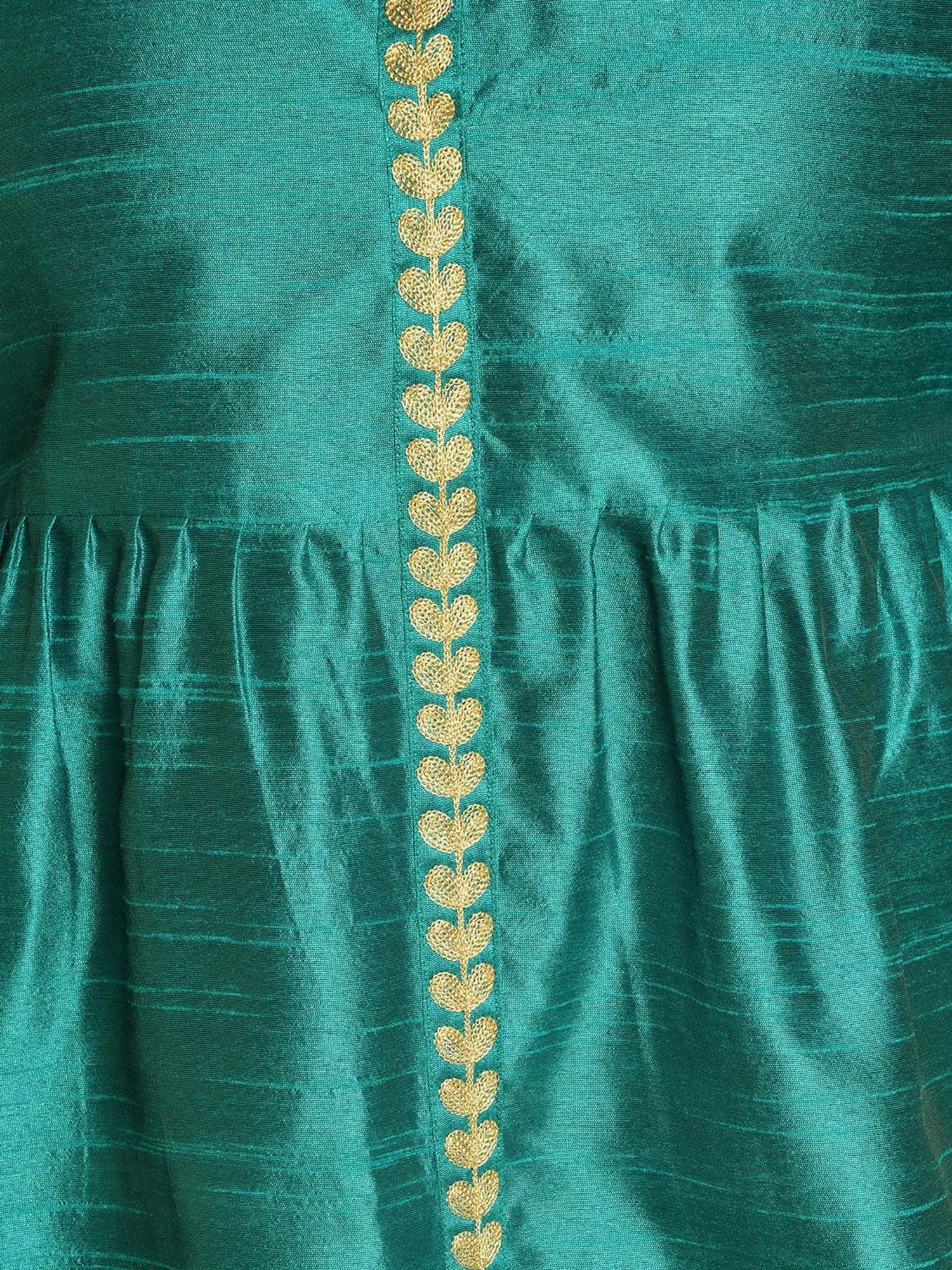 Step into the spotlight with this breathtaking A-line kurta set, meticulously crafted from luxurious silk. The vibrant teal hue evokes a sense of regal elegance, making it the perfect choice for festive occasions, weddings, or any event where you wish to make a sophisticated statement. The natural sheen of the silk fabric drapes beautifully, offering both comfort and an undeniable air of opulence. This ensemble is designed to flatter, with its classic A-line silhouette that flares gently from the waist, creating a graceful and feminine profile.