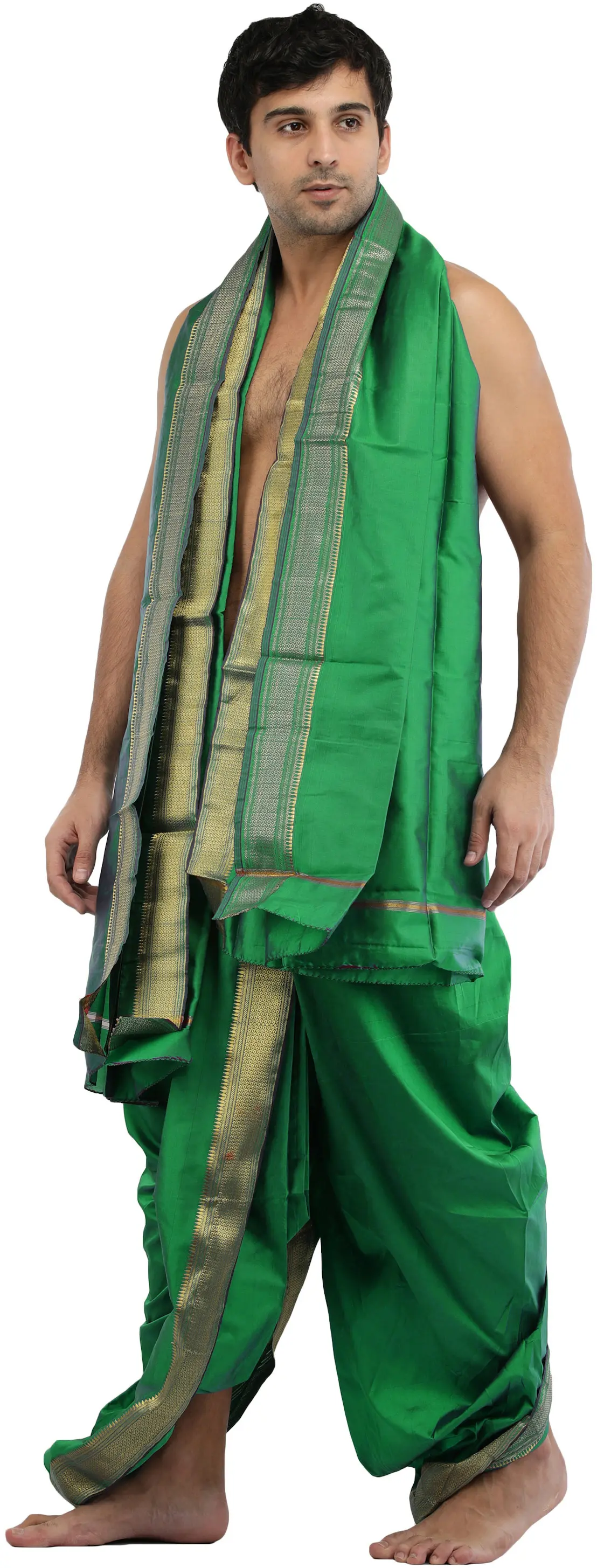 The lightweight cotton fabric of the dhoti is available in various colors having a stripe of a colorful border making it appear rich and sophisticated. This clothing is suited especially for the summer season. A lot of innovations have been made to the Dhoti, one of them being its availability in silk fabric also. The silk varieties are worn on special occasions and marriage ceremonies, while the cotton varieties are worn as daily wear. The Indian dhoti is not only extremely comfortable for men but also adds an element of dignity and manliness to their personalities. The way of styling the Indian dhoti differs from place to place and has indeed evolved a lot due to global influence.