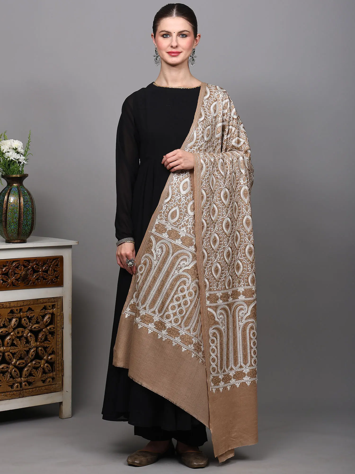 Wool Stole with Zari Embroidered Floral Arabesque Pattern and Diamond Weave from Punjab